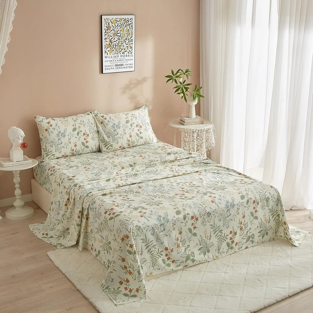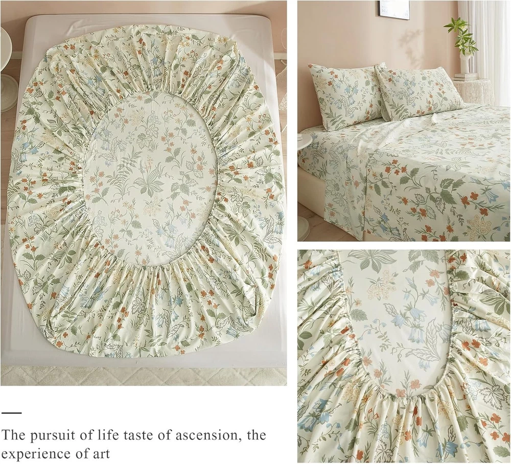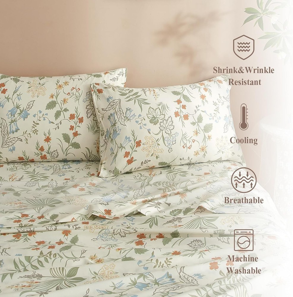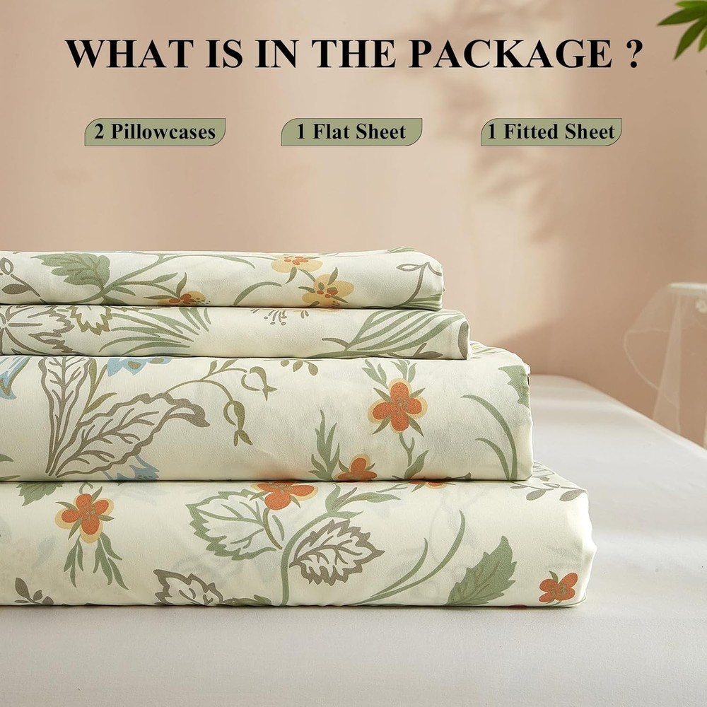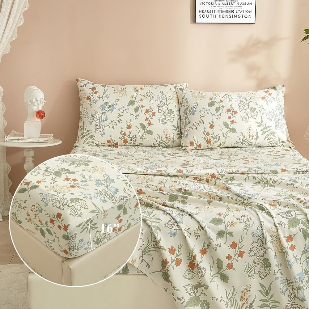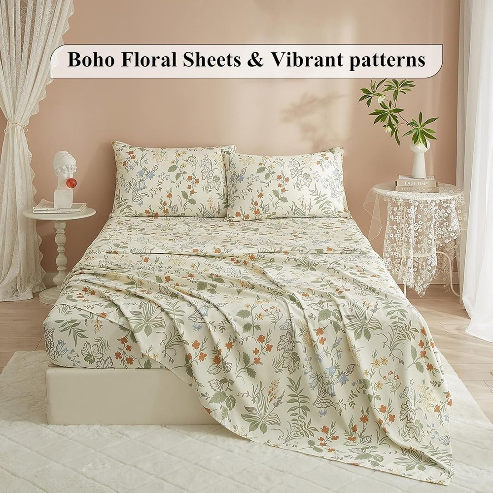 About this item EASY FIT SHEET SET- Cottagecore green floral sheet set was made from 100% washed microfiber material,which offers strength and durability with exceptional softness.Experience the ultimate comfort and soft touch with our full bed sheets,sleep better and wake up each morning feeling refreshed,this washed microfiber sheets is stronger than cotton with ultra-tight knit,these luxury full sheets floral bed sheets won't rip or tear after washing. 4 PIECE FULL SHEET SETS - Luxury Soft Full Size Bed Sheets Set 4 Piece - 1 flat sheet 81"x96",1 fitted sheet 54"x75"x16",2 pillowcases 20"x30".Extra Deep pockets that fit mattresses up to 16" deep with elastic around the fitted sheet.The all-around elastic on our fitted sheets will cover your deep luxurious mattress and any toppers easily, no matter how much you toss and turn. SOFT BED SHEET SET - Cooling Full Sheet Set is feature with green floral botanical pattern,which is wrinkle and fade resistant.HIGHBUY bed sheet sets are available in a variety of beautiful designs and colors,prefect for your home decor aesthetic.Ultra soft boho floral sheets is best for Bedroom,Guest Room,Kids Room,RV,vacation home,College Dorm.Ideal choice as a sweet gift for Women,Men,Teens,Boys,Girls,Toddlers,Nursery,Friend,Son,Daughter,Family EASY CARE - Full sheets is machine washable.Wash on a gentle cycle with cold water,tumble-dry them on low heat.Quick ironing or steam clean when needed,to give your bed that fresh new ironed look every single time.HIGHBUY sheet set is manufactured by factory that is certified OEKO - TEX Standard 100.Visiting the HIGHBUY store,find out your favorite bedding sets. BOHO FLORAL SHEET SET - 4 Piece Comfortable Full Sheet & Pillowcase Sets decorate your home.Keep you cool,comfortable,and breathable in all seasons.If you are not satisfied with the product for any reason, please contact us and we are happy to assist you. The Vintage Flowers Sheets Full Size in Green Floral design are a charming addition to any bedroom. Made from lightweight and breathable microfiber material, these sheets are perfect for cooling off in the summer months. With a deep pocket design and a fitted sheet pocket depth of 16 inches, these rectangular sheets are comfortable and stylish. The floral pattern and cottage style give a cozy feel to the room, while the pull-on closure makes it easy to get in and out of bed. Machine washable and wrinkle-resistant, these sheets are a practical and beautiful choice for your bedroom decor.