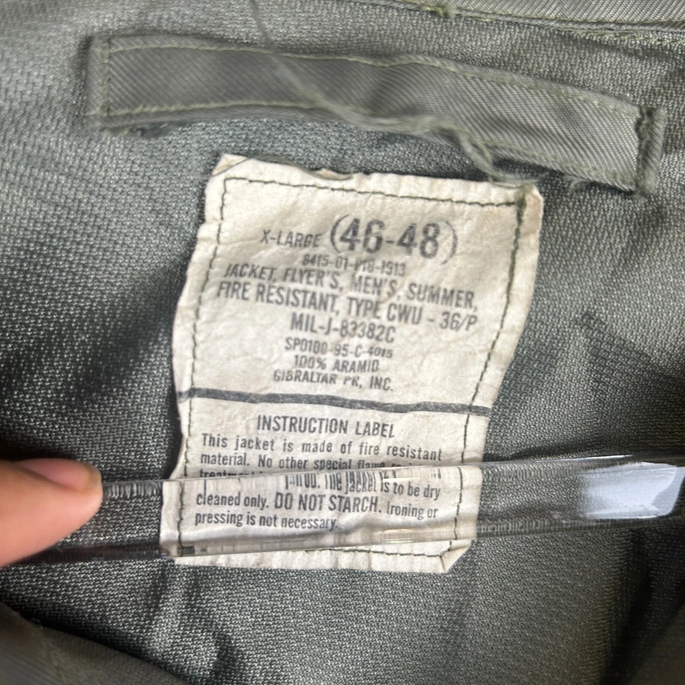 Stay warm and stylish with this vintage Flyer's Cold Weather CWU-36/P jacket from the US Army. The jacket features a full zip closure and solid green color with a logo accent. It is made of lightweight nylon material with polyester insulation, making it perfect for walking, hunting, and hiking during summer, fall, and spring seasons. The jacket also has pockets to keep your essentials safe and secure. This jacket is a size XL and fits regularly. It is suitable for travel, casual wear, and workwear. The garment care requires dry cleaning only. This jacket is a must-have for any vintage clothing enthusiast and is perfect for those who want to add a touch of style to their wardrobe. SKU: PK-36-82
