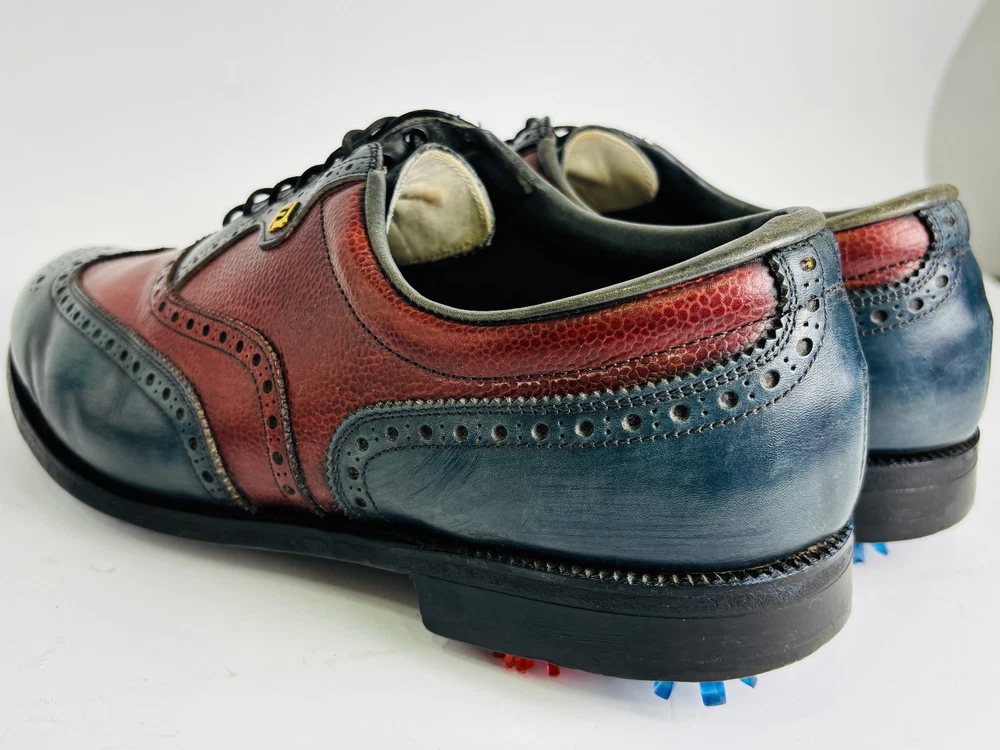 Offered here is a rare and collectible pair of vintage FootJoy wingtip golf shoes , size 11.5 D , proudly Made in the USA . These two-tone leather classics feature bold red pebble-grain panels contrasted with deep blue smooth leather, full brogue detailing, and new soft spikes. These shoes were crafted during the golden era of FootJoy manufacturing, when every pair was hand-finished in their Brockton, Massachusetts facility. That factory closed in 2008, marking the end of U.S.-made FootJoy footwear — making surviving pairs like these truly scarce. FootJoy has long been considered the gold standard in golf footwear, worn by legends such as Jack Nicklaus, Tom Watson, and Payne Stewart . Vintage USA-made FootJoys are highly sought after by collectors and golfers who appreciate their superior craftsmanship, premium leather, and timeless style. With the supply permanently capped, values for well-preserved examples are only expected to rise. Condition : Very good vintage condition overall. The uppers are supple and retain rich color. There is a small rip in the heel counter (photographed) that has been sealed with cement and clear tape for stability, but it will need a proper repair for long-term wear. Spikes and soles are in excellent shape. Details: Brand: FootJoy Size: 11.5 D Color: Red pebble-grain & blue smooth leather two-tone Style: Wingtip full brogue golf shoes Made in USA – Brockton, Massachusetts factory (now closed) new matching soft spikes Collectible vintage golf footwear Why These Matter: FootJoy’s American-made shoes were built to a standard rarely seen today. The leather quality, hand-finishing, and Goodyear welt construction made them not only high-performance on the course but also durable enough to last decades. With production moved overseas and the U.S. factory gone, vintage models like these represent a piece of golf history — both wearable and highly collectible.
