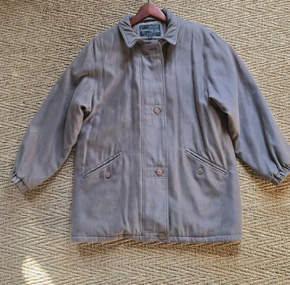 This vintage Forecaster coat in beige is a must-have for any fashion-forward woman. Made with polyester, it features a hood and is sized as a medium. This overcoat is perfect for any occasion and will keep you warm in style. The coat is missing a hood, but that does not take away from its overall look. It is a great addition to any wardrobe and is perfect for those who love vintage style.
