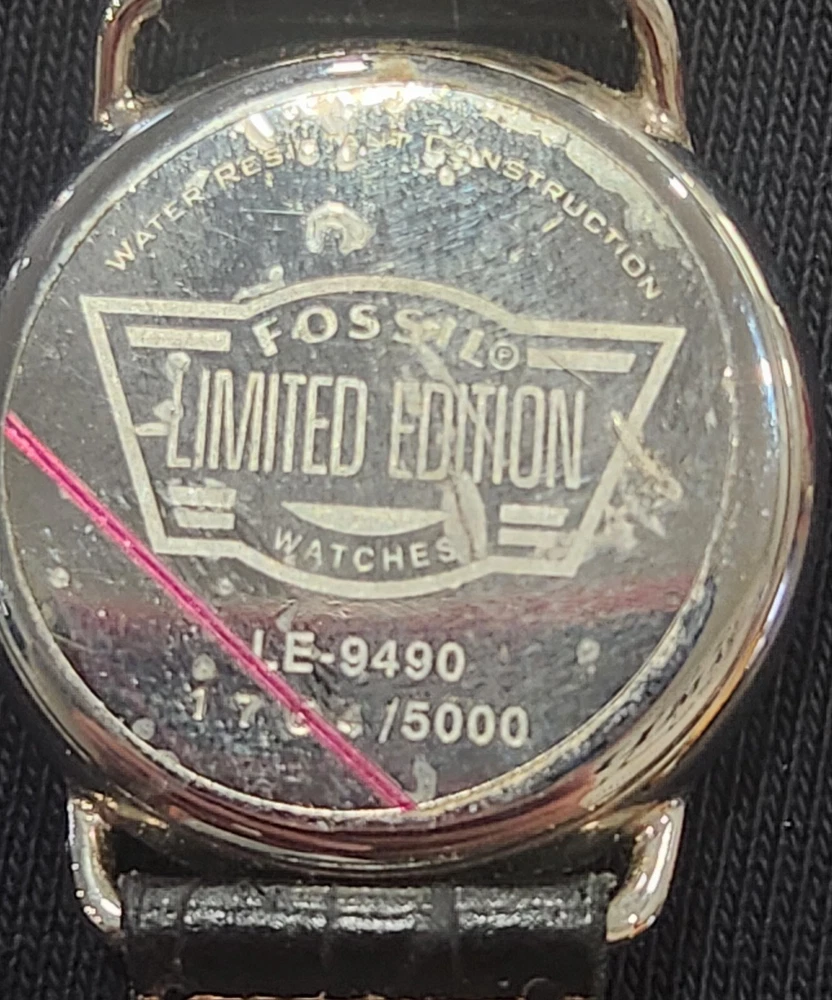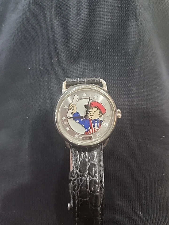 This Fossil Limited Edition News Boy Watch is a vintage piece with a silver bezel and a two-piece black leather strap. The watch has a round shape and an analog display with a white dial color. It was manufactured in Japan and has a reference number of LE9490. The watch comes with its original box and packaging, and is customized with no changes made. It is a unisex adult watch that is perfect for casual wear. The movement is quartz, and the watch has a unique vintage style that is sure to catch everyone's attention.