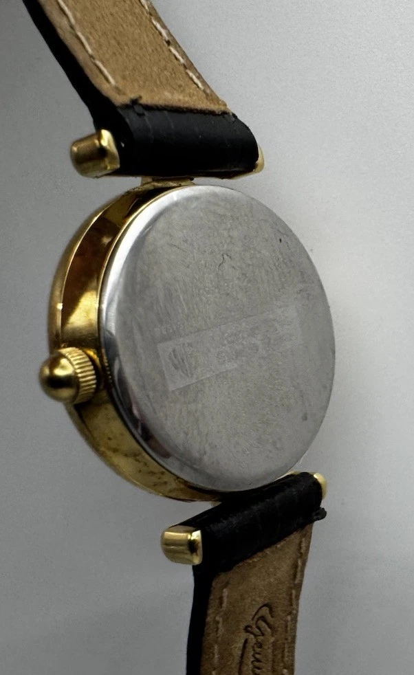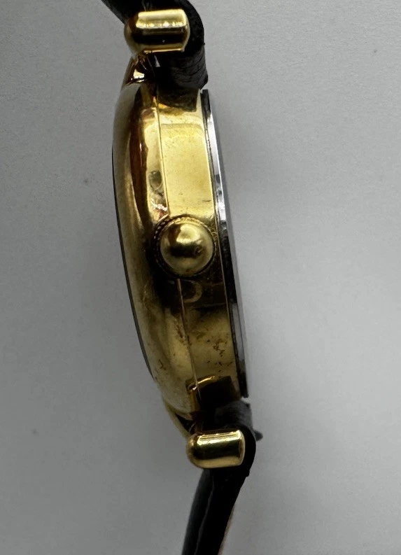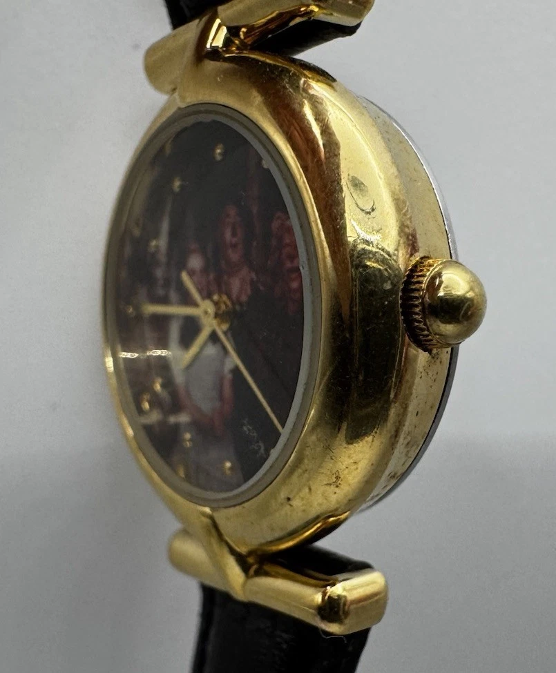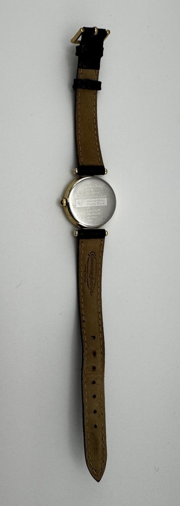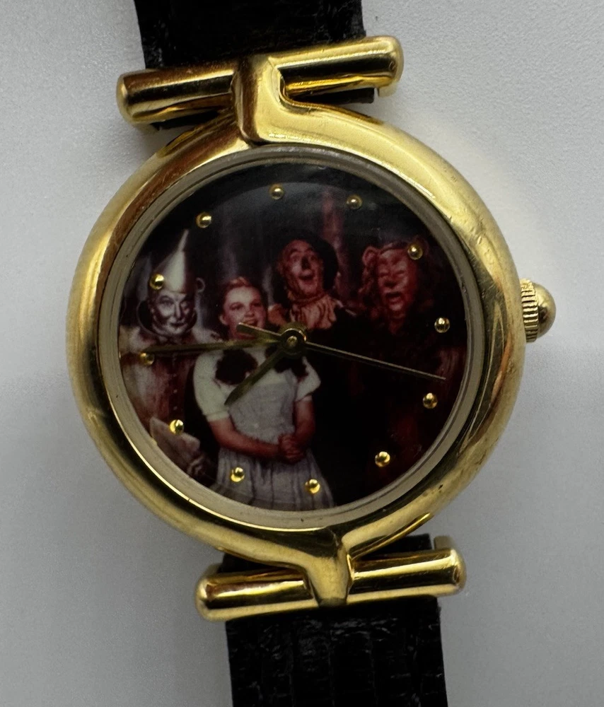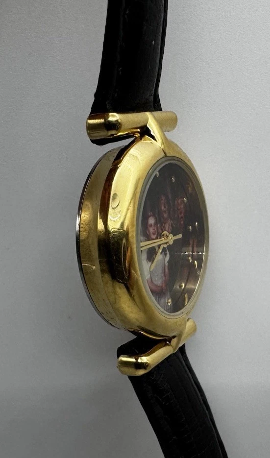 Vintage Fossil Warner Bros watch featuring Dorothy, the Tin Man, Scarecrow, and the Cowardly Lion on the dial. Gold‑tone case with a black leather strap. Fully working and shows light vintage wear. A nostalgic collectible from the Wizard of Oz Studio Store series.