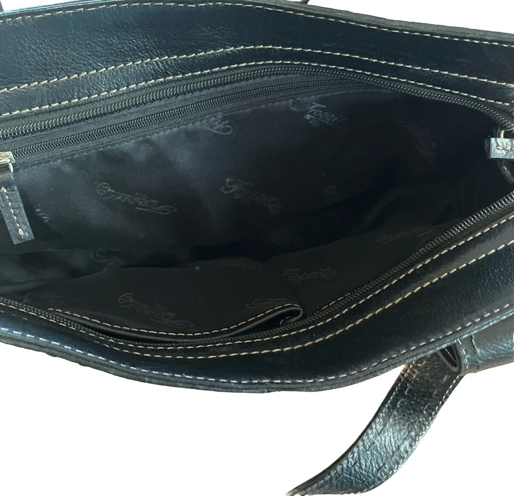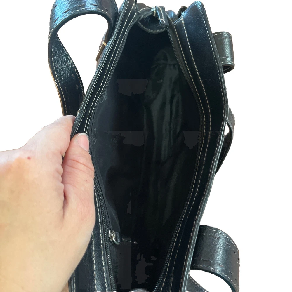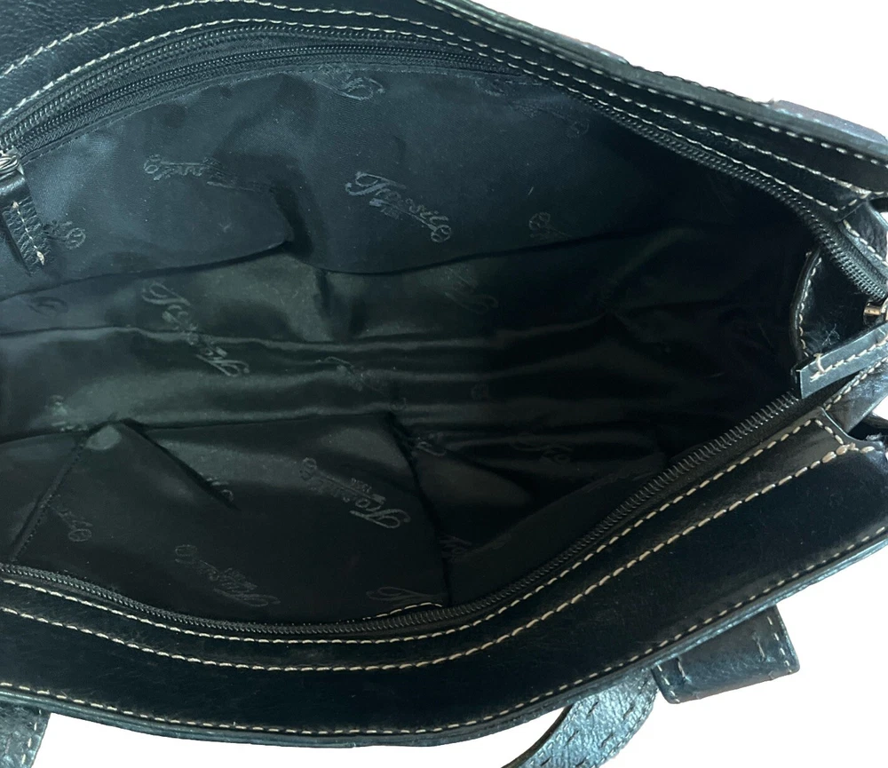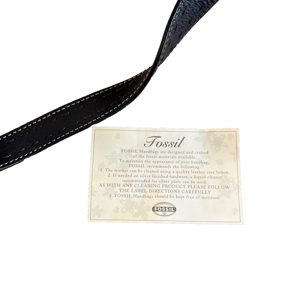 This vintage Fossil handbag purse is a must-have for any fashion-forward woman. Made of high-quality leather, it features a rectangular shape with a zip and magnetic closure. The black exterior color and stainless steel handle/strap material add a touch of elegance to this medium-sized bag, making it suitable for any occasion, from travel to workwear. The purse has a 7-inch bag height, 13-inch bag width, and 4-inch bag depth, providing ample space for all your essentials. It comes with additional strap accents, zipper, stitching, and embroidered details that make it stand out from the rest. The Fossil Sedona model has a classic and preppy theme, perfect for the 90s era.