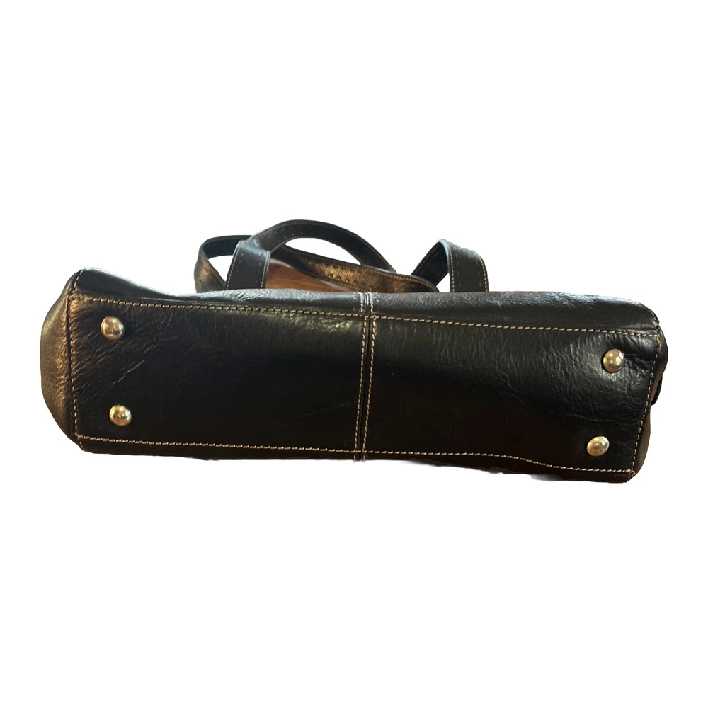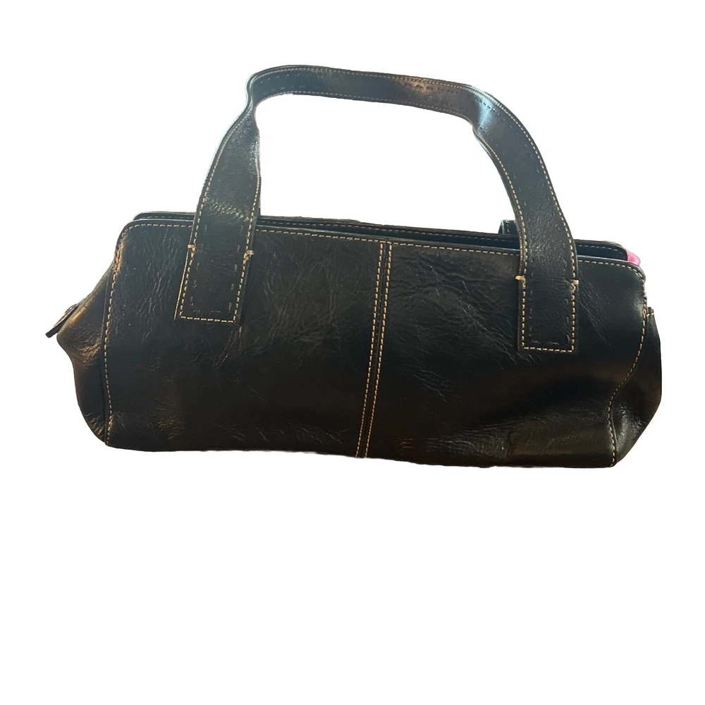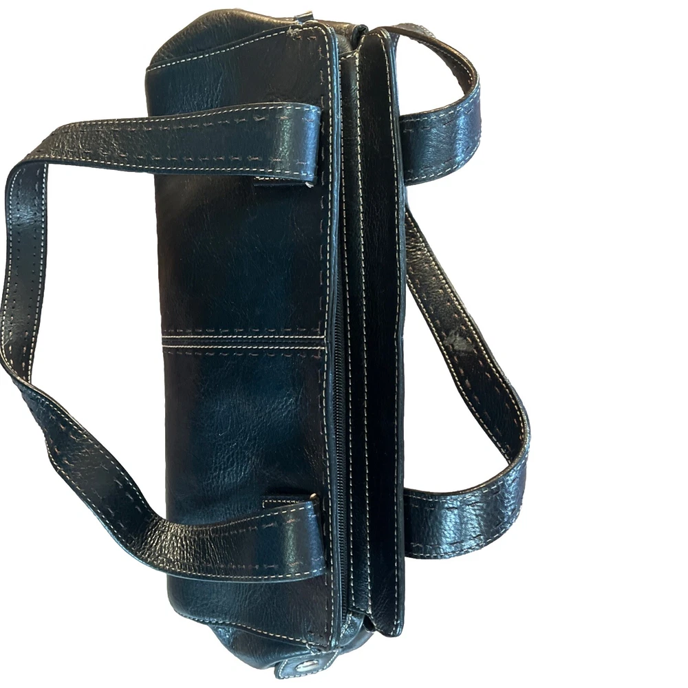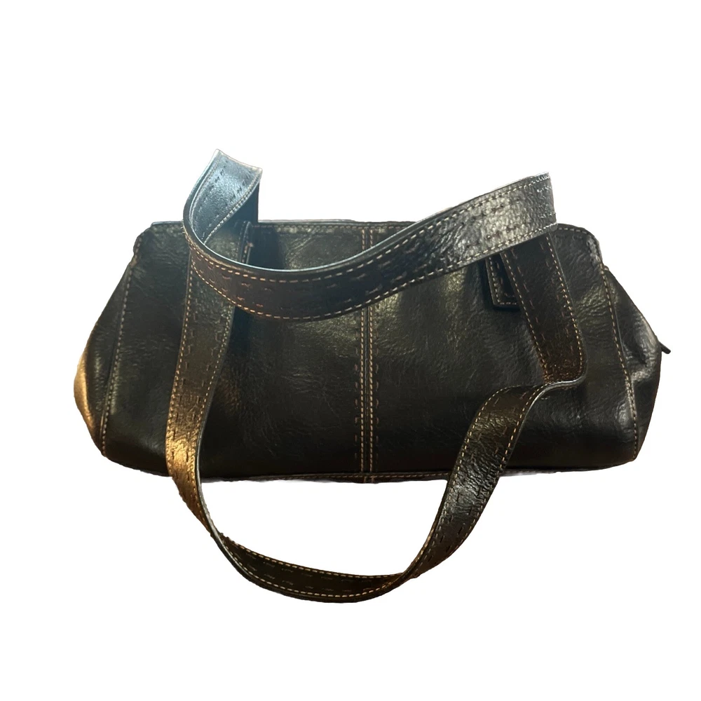 This vintage Fossil handbag purse is a must-have for any fashion-forward woman. Made of high-quality leather, it features a rectangular shape with a zip and magnetic closure. The black exterior color and stainless steel handle/strap material add a touch of elegance to this medium-sized bag, making it suitable for any occasion, from travel to workwear. The purse has a 7-inch bag height, 13-inch bag width, and 4-inch bag depth, providing ample space for all your essentials. It comes with additional strap accents, zipper, stitching, and embroidered details that make it stand out from the rest. The Fossil Sedona model has a classic and preppy theme, perfect for the 90s era.