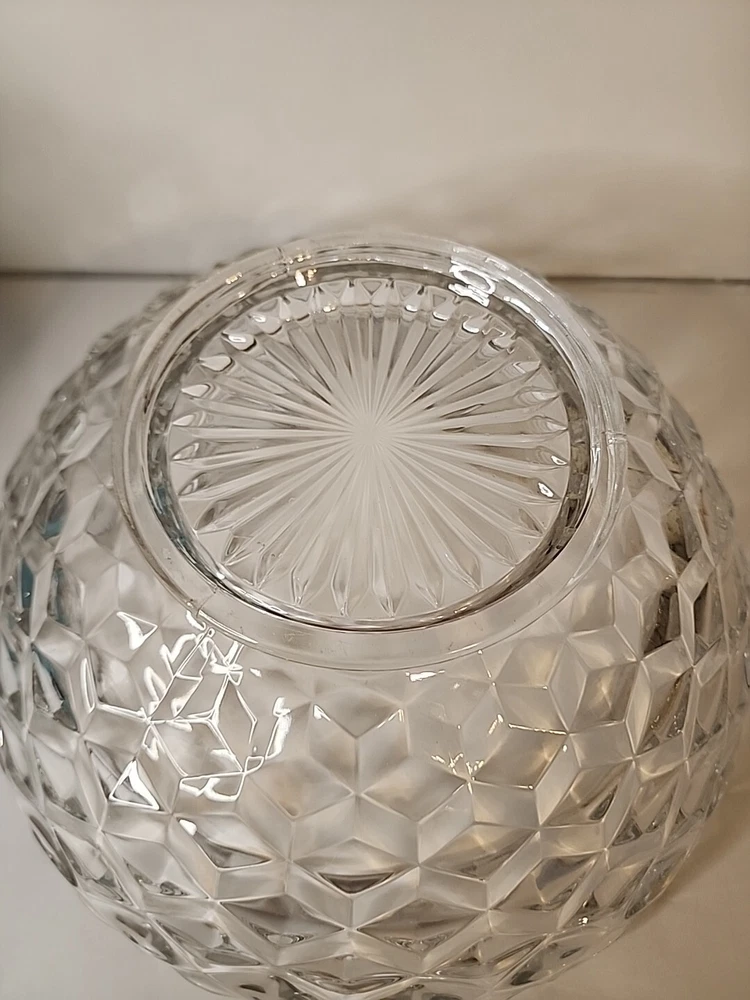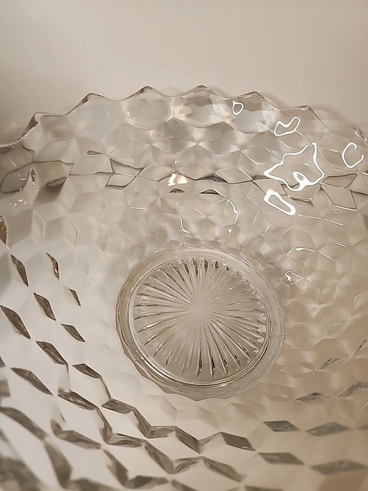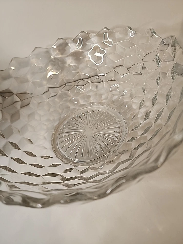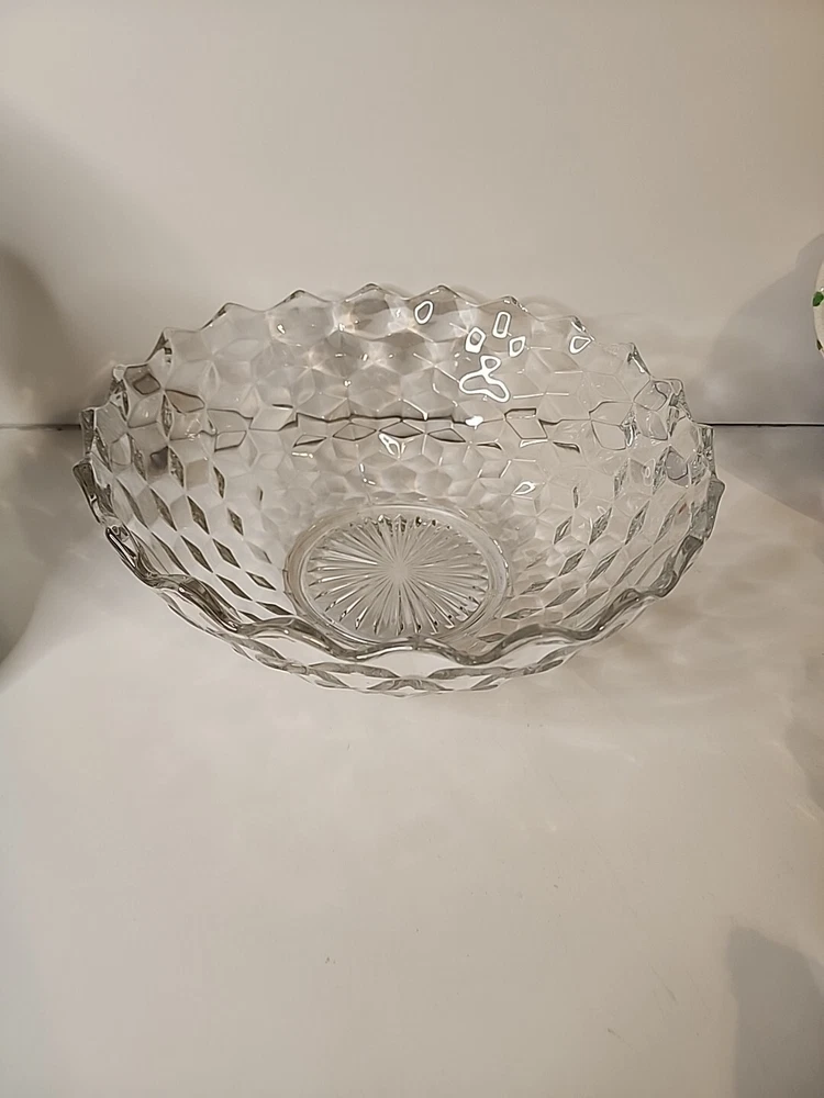 This vintage Fostoria American Cubist Pattern serving bowl is a beautiful addition to any dinnerware collection. The round, 10-inch bowl features a stunning fruit pattern and is made of shiny clear glass. Perfect for all occasions, this mid-century modern style bowl is a licensed reproduction and weighs 4 pounds and 12 ounces. The bowl is designed with a single place setting and comes with a matching fruit bowl. It is perfect for serving fruits or any other dish. The item length and depth are 4 inches, and it has a beautiful clear color that will complement any table setting. This bowl is a great piece for collectors or anyone who appreciates beautiful glassware. New out of box