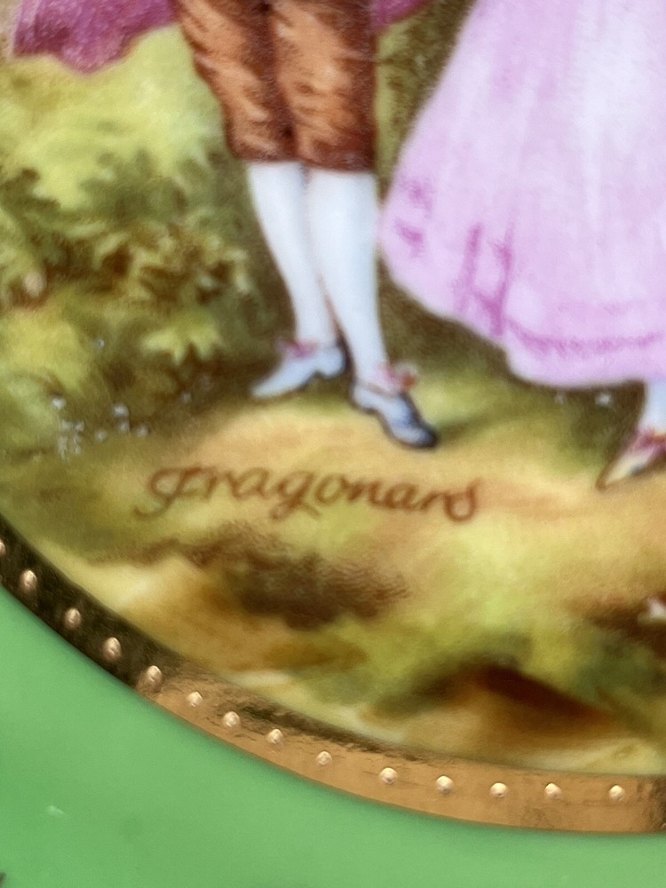 This vintage Fragonard courting plate from MM Bavaria is a beautiful addition to any collection. The round plate measures 7.5 inches in diameter and features a stunning green color with a love and romance theme. Made of high-quality porcelain, this collector plate is a true gem. The plate bears the MM Crown Backstamp and is from Germany, making it a unique piece with a rich history. Whether you're a collector or simply looking for a special decorative item, this vintage plate is sure to impress. Add it to your collection today!
