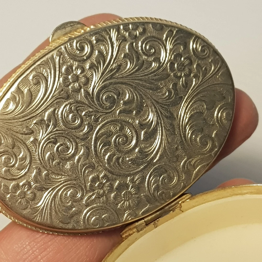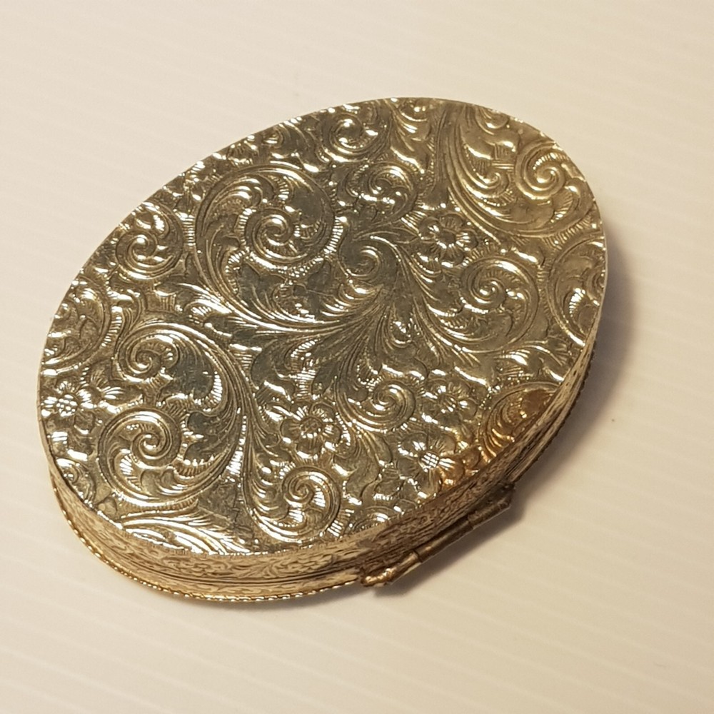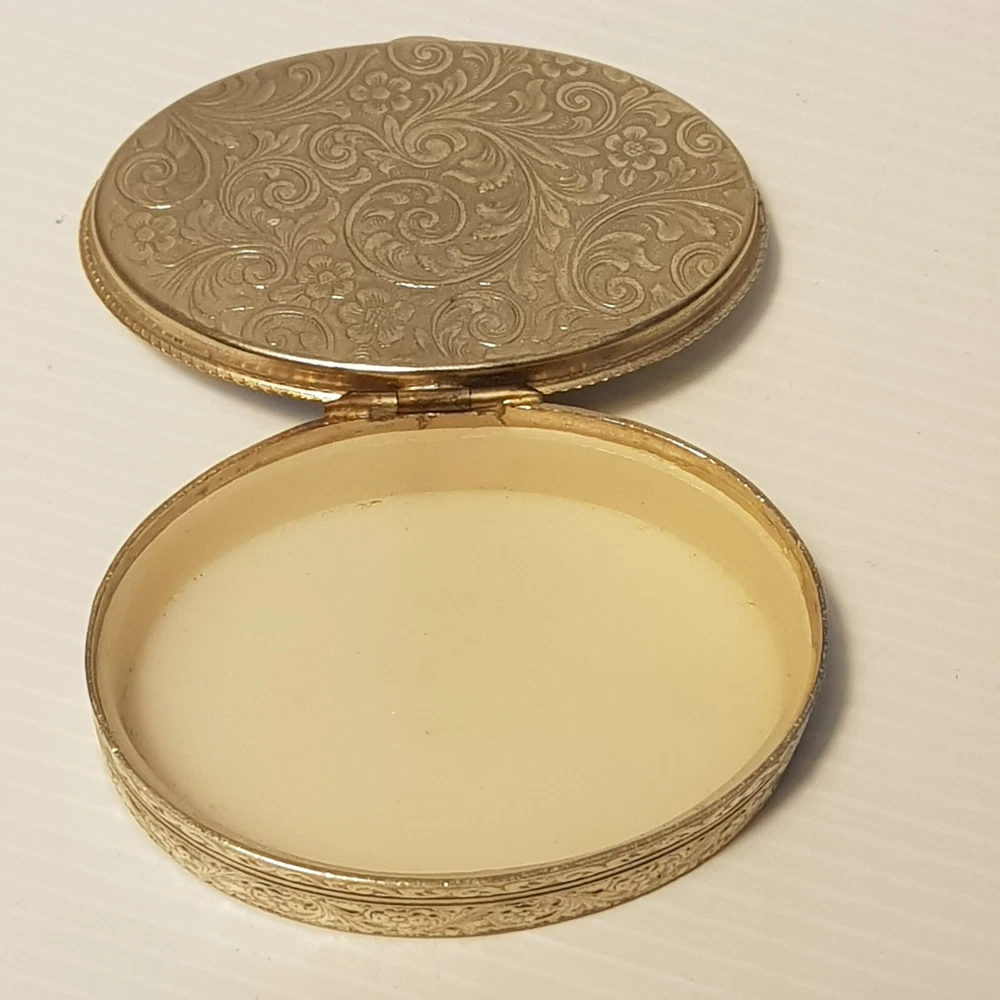 This is a very beautiful trinket/ pill box. Very delicate case with extensive swirl engraving on the exterior and interior.