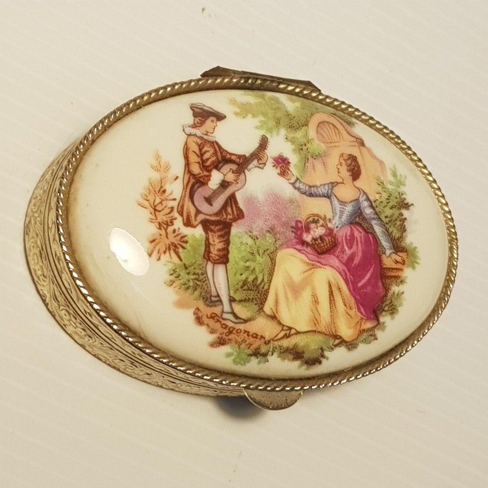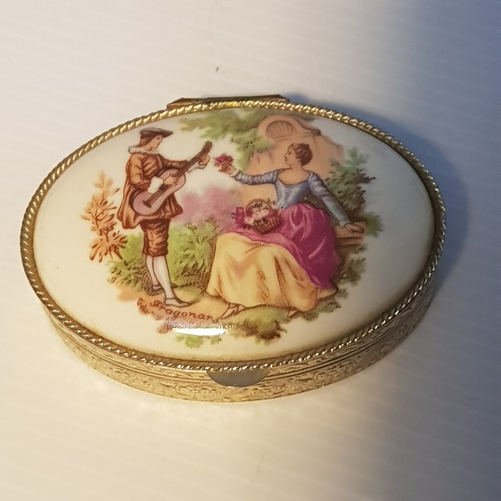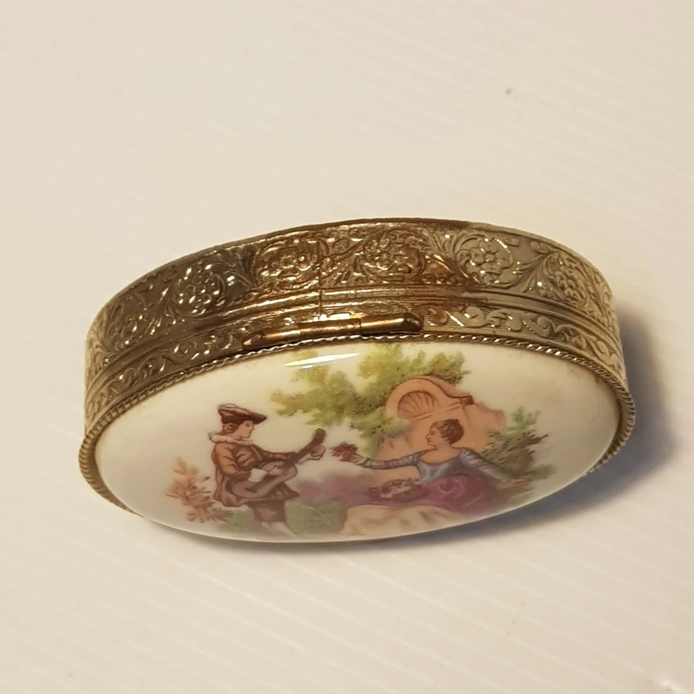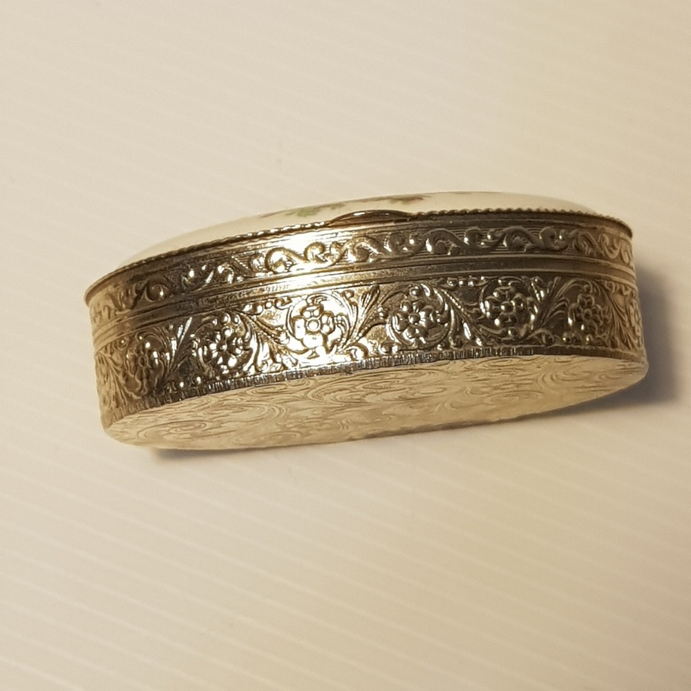 This is a very beautiful trinket/ pill box. Very delicate case with extensive swirl engraving on the exterior and interior.