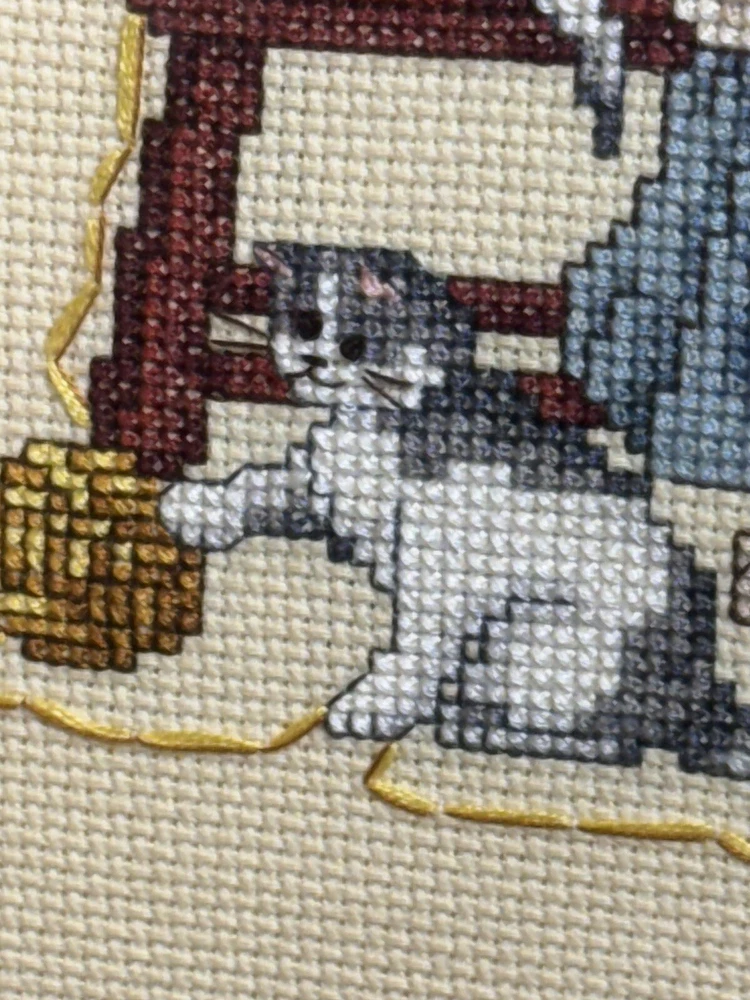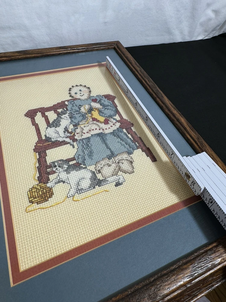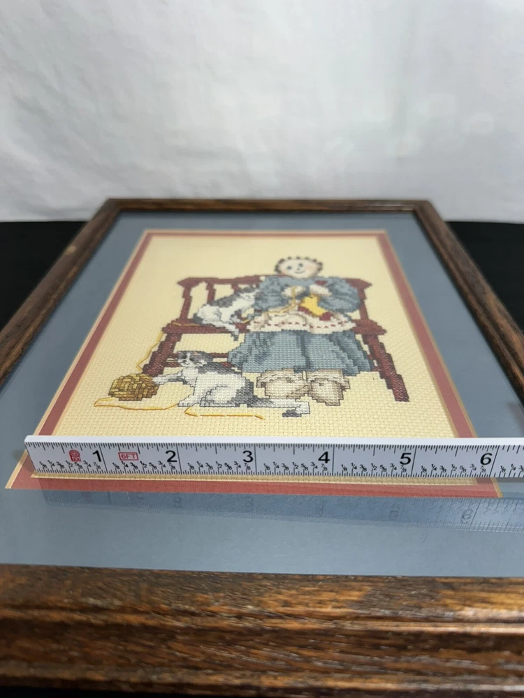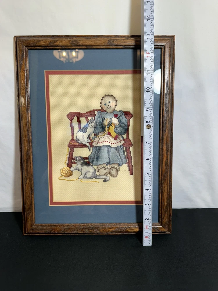 This vintage framed cross stitch art piece features a charming scene of a girl knitting with two cats. The intricate details of the embroidery make this piece a unique addition to any collection. Made in the USA, this piece is a testament to the skill and dedication of American craftsmen. The type of embroidery used is cross stitch, and the piece is finished and ready to display. The perfect addition to any home decor, this piece is sure to delight any lover of embroidery and vintage art.