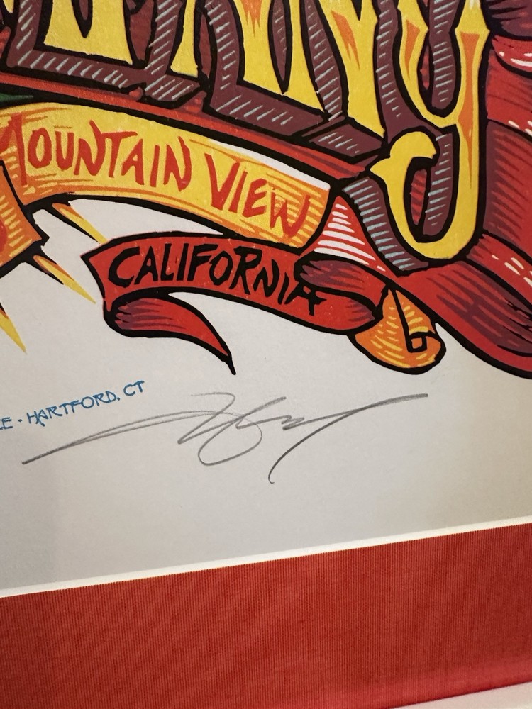 Capture a piece of music history with the 30" X 24" Framed Dead & Company Concert Poster from their performance at the Shoreline Amphitheatre, in Mountain View, CA on July 2-3, 2018. Rare numbered poster # 530 of 1050. Poster artist is AJ Masthay. Poster signed by artist. Excellent condition. Celebrate the iconic Grateful Dead spin-off with this original piece, a must-have for any collector or fan of the rock and pop genre. Expertly crafted in the United States, this poster is not just a visual memento but a tribute to the enduring legacy of the band. It's a standout addition to any music memorabilia collection, bringing a touch of the Grateful Dead's spirited energy into your space.Poster description:White frame with a sheet of glass, orange outer matting, no inner matting;Flying eye ball, skeleton with electric guitar and amp