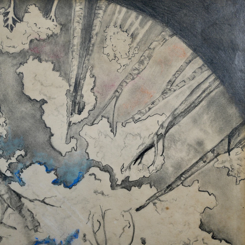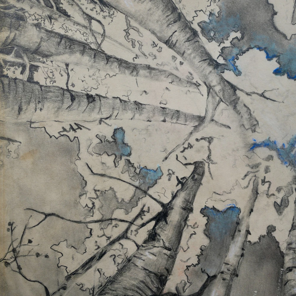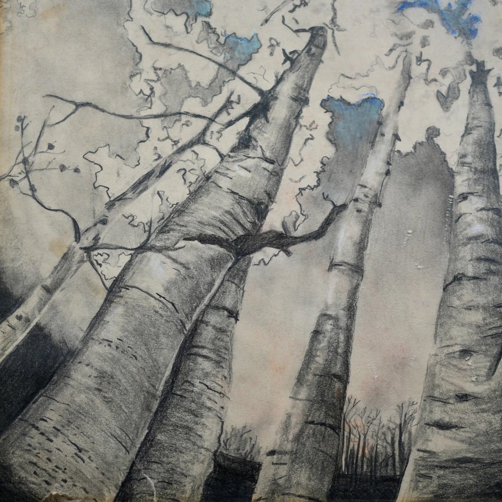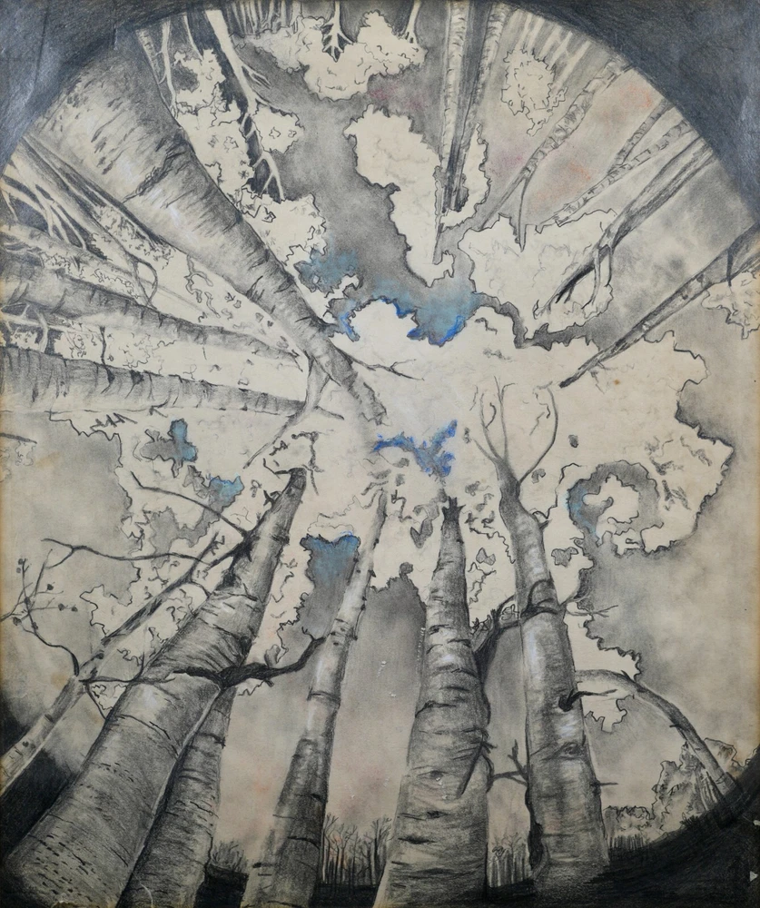 The Vintage ( Circa.1960s ) Framed Original Landscape Charcoal and Color Pencil Painting "View of Birch Forest" , No Signature Found. It Depicts the Landscape Scenery of White Birch Forest in Winter. The Composition is Made through the Unique Perspective of Children Looking Up, the Sight Follows the Towering Birch Tree Trunk and Looks Towards the Blue Sky and White Clouds, which is Full of Children Interest. The Painting Shows Toning, Tear at the Bottom Edge, and Some Scratch on the Frame Consistent With Age, Overall in Good Condition. Title: "View of Birch Forest" Artist: Unsigned Time Period: 1960s Medium: Charcoal and Color Pencil on Paper Condition: Overall in Good Condition Frame Size: 26" By 23" Sight Size: 18-1/4" By 15-1/4" Available For Domestic Shipping and International Shipping. Thanks!