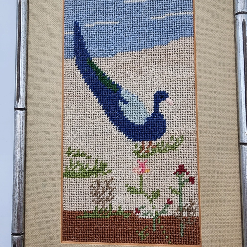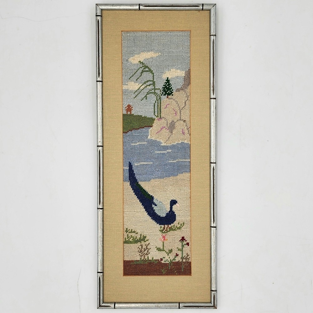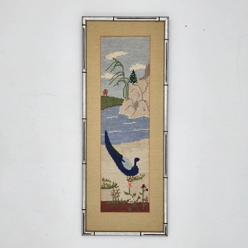 Charming vintage hand-stitched needlepoint artwork featuring a serene landscape with a graceful peacock by a riverside. The scene is beautifully detailed with soft pastel tones—blue water, tan sand, green foliage, and a small red-roofed house in the distance—creating a peaceful, nature-inspired composition. Presented in a narrow rectangular frame with a linen mat and silver-toned trim, the piece has a refined, mid-century aesthetic perfect for bohemian, cottage, or traditional interiors. Medium: Needlepoint embroidery on fabric Frame Size: Approx. 8.5” x 20.5” (including frame) Era: Likely mid-20th century Condition: Very good vintage condition with minor age wear to frame consistent with age Style: Folk Art / Mid-Century Decorative Needlework A lovely handmade textile piece that brings a touch of warmth and artistry to any wall.