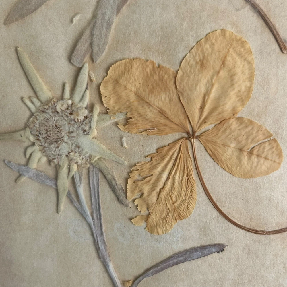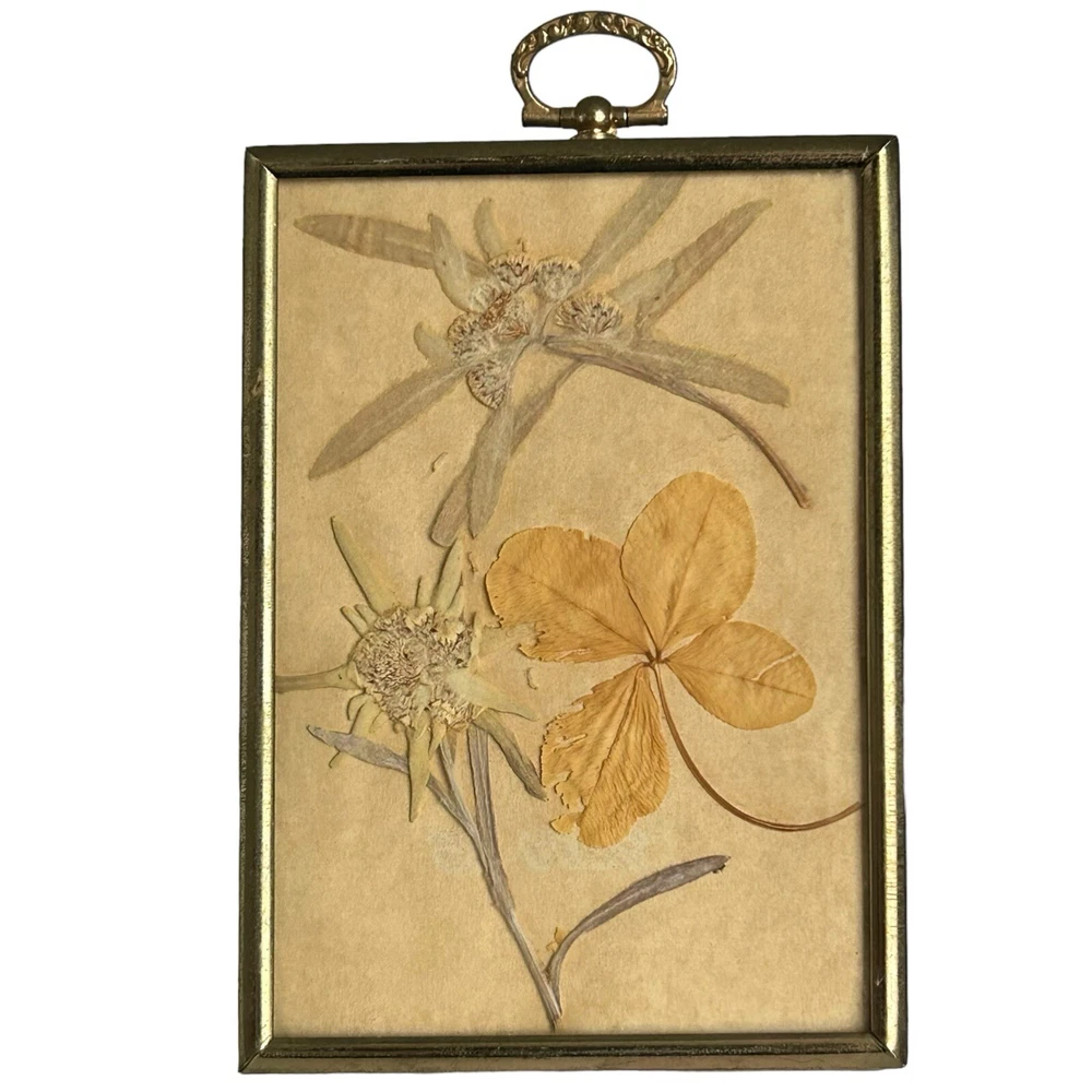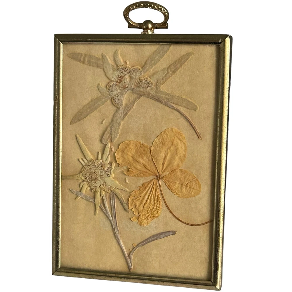 Vintage Framed Pressed Edelweiss Flowers & Four Leaf Clover Art Symbolic for True Love, bravery, strength and sacrifice. The edelweiss flower grows in the Alps and comes with a long list of historic & folkloric significance. In 1861, author Berthold Auerbach narrated a story of a brave young man who risks his life to collect this rare flower for his lover as an act of true love. In WW1, the edelweiss was granted to the German alpine troops for their bravery. In WW2 an edelweiss flower was worn on the sleeve and caps of the mountain infantry troops. Another interesting tidbit is the superstitious belief that burning the flower as incense will rid all evil spirits from your home. Four leaf clovers are considered a rare mutation that occurs approximately 1 in every 10,000 which is why they’re considered lucky. Minor surface scratches and some tarnishing may be present to the frame due to preowned condition. No chipping or fractures to the glass. Please see pictures as part of full description and measurements.