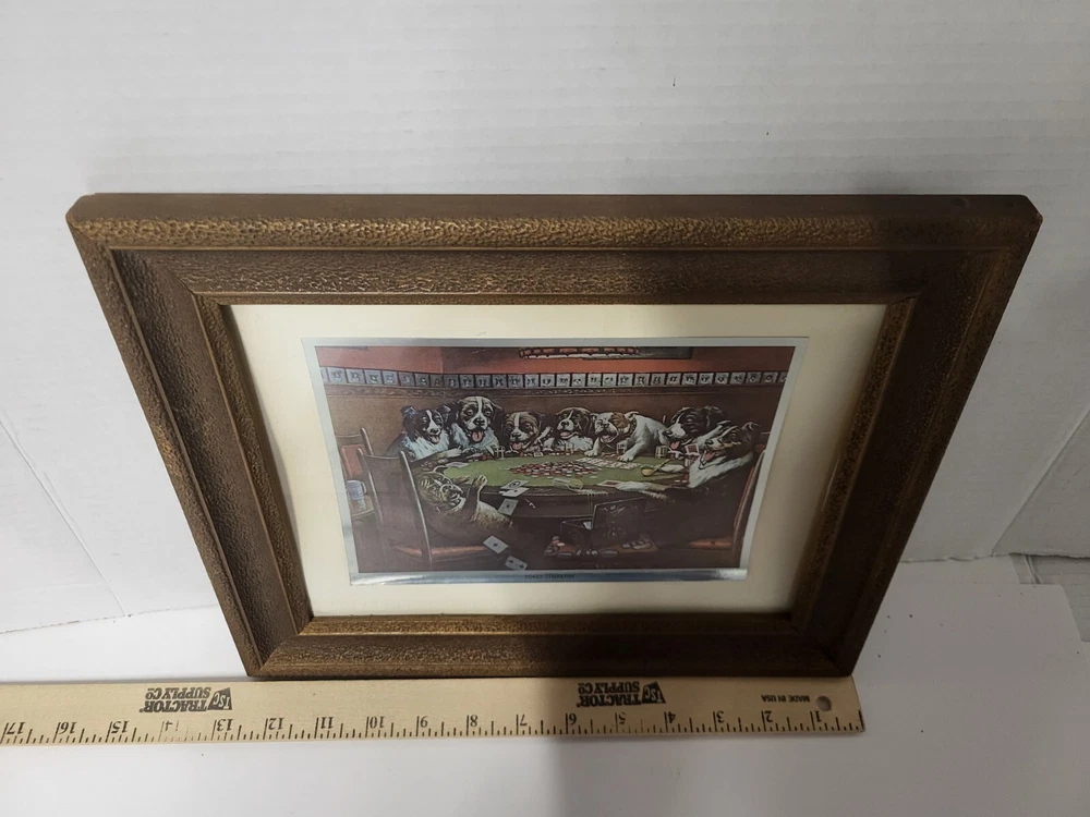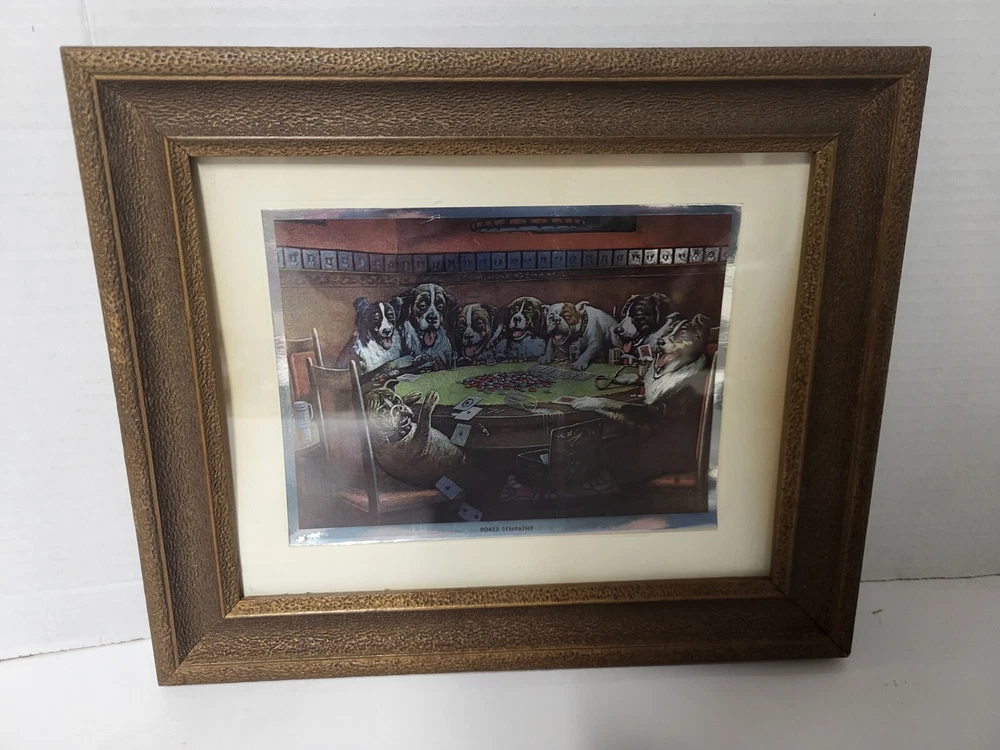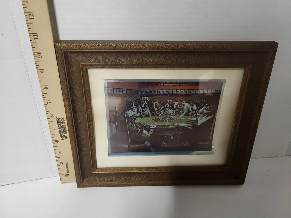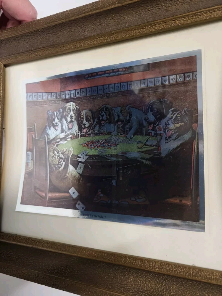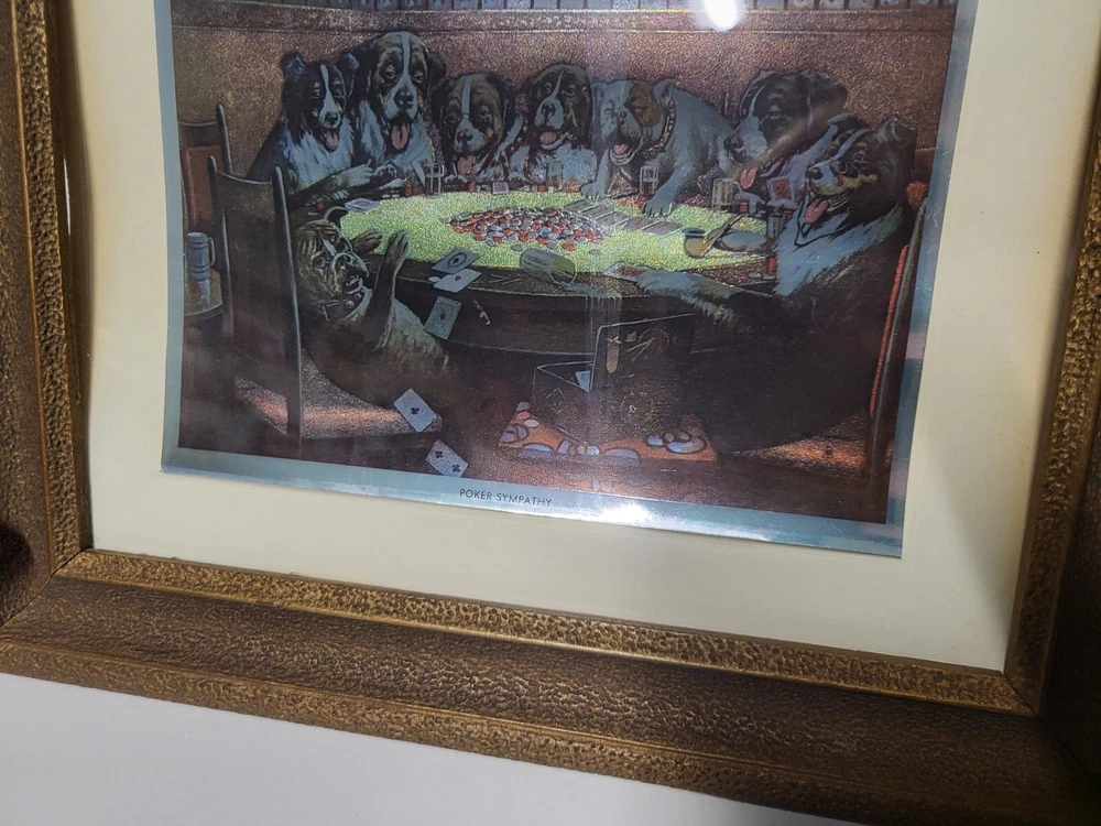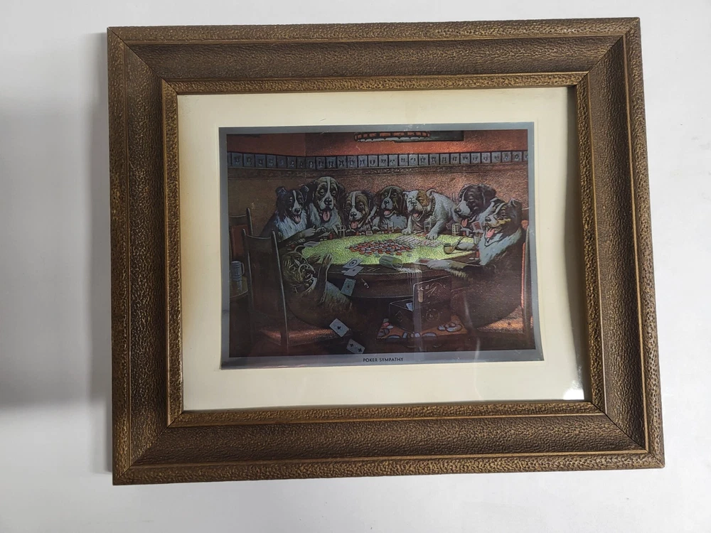 Vintage Framed Print "Poker Sympathy" By C M Coolidge Dogs Playing Cards In Color Foil Craft which has a sort of 3D Effect at different angles. Old Wood frame shows light wear. Print is free of tears or rips. 10.5" ht, 13" Length, 1" Depth. Will sell Print Only Without Frame if Requested. Please see Matching Pictures "A Friend In Need," "A Bold Bluff," & "Sitting Up With A Sick Friend," also in my listings. Will combine shipping if purchasing more than one.