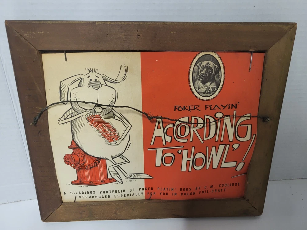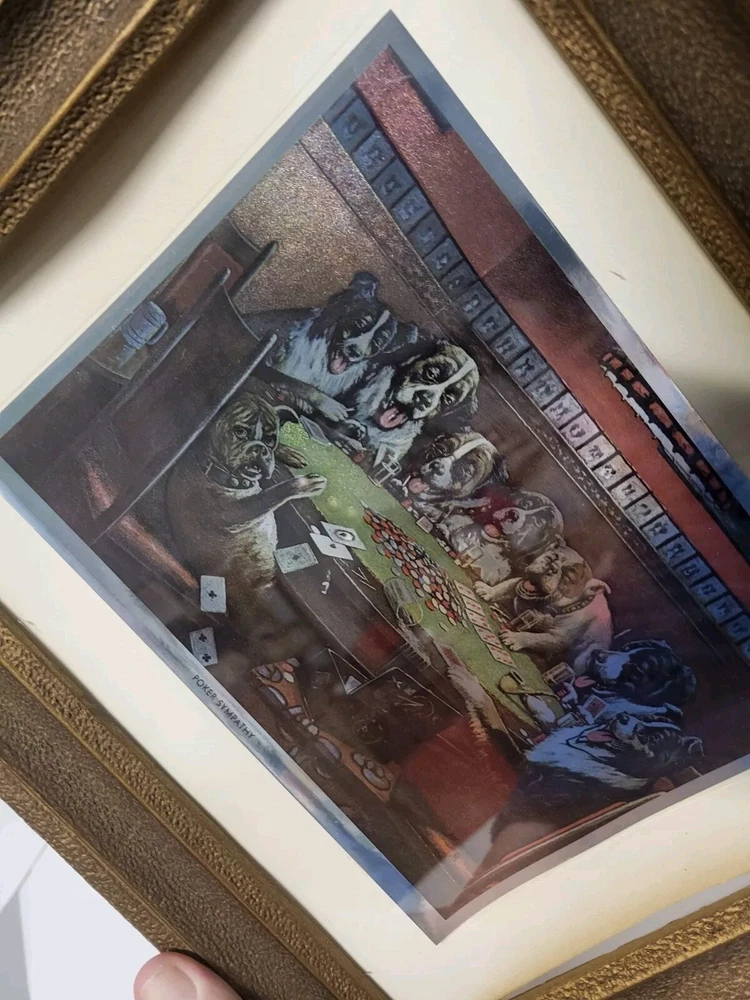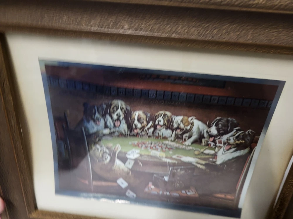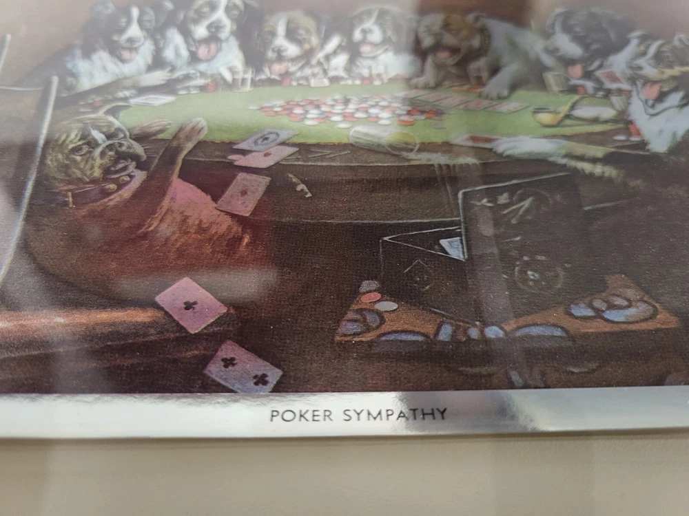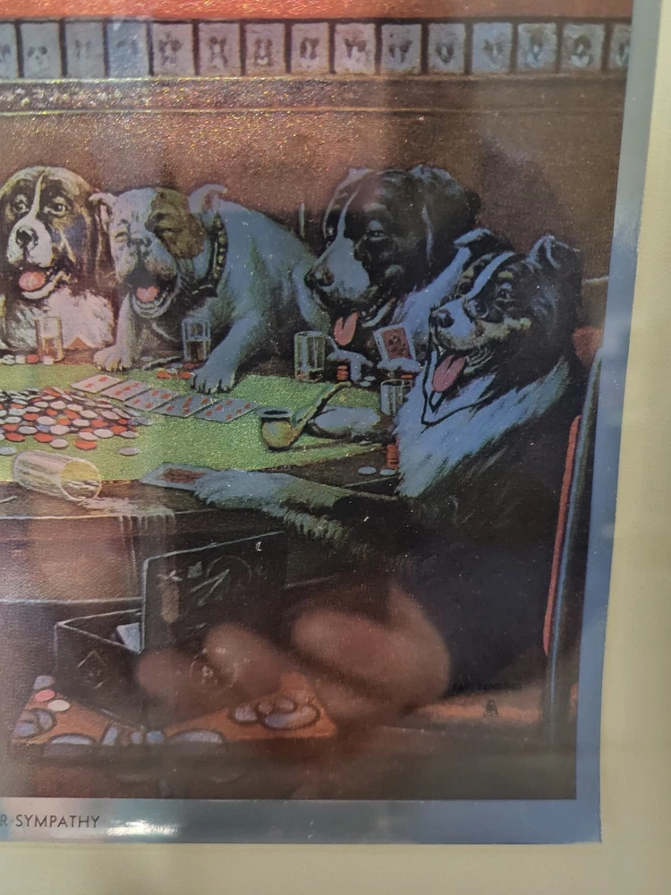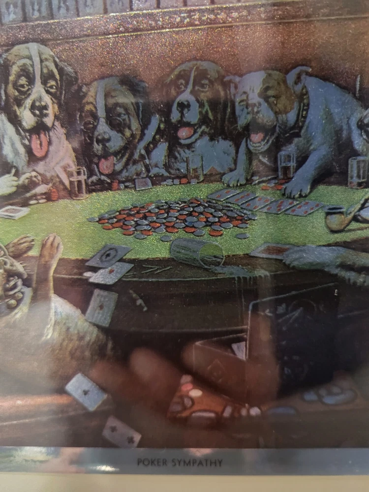 Vintage Framed Print "Poker Sympathy" By C M Coolidge Dogs Playing Cards In Color Foil Craft which has a sort of 3D Effect at different angles. Old Wood frame shows light wear. Print is free of tears or rips. 10.5" ht, 13" Length, 1" Depth. Will sell Print Only Without Frame if Requested. Please see Matching Pictures "A Friend In Need," "A Bold Bluff," & "Sitting Up With A Sick Friend," also in my listings. Will combine shipping if purchasing more than one.