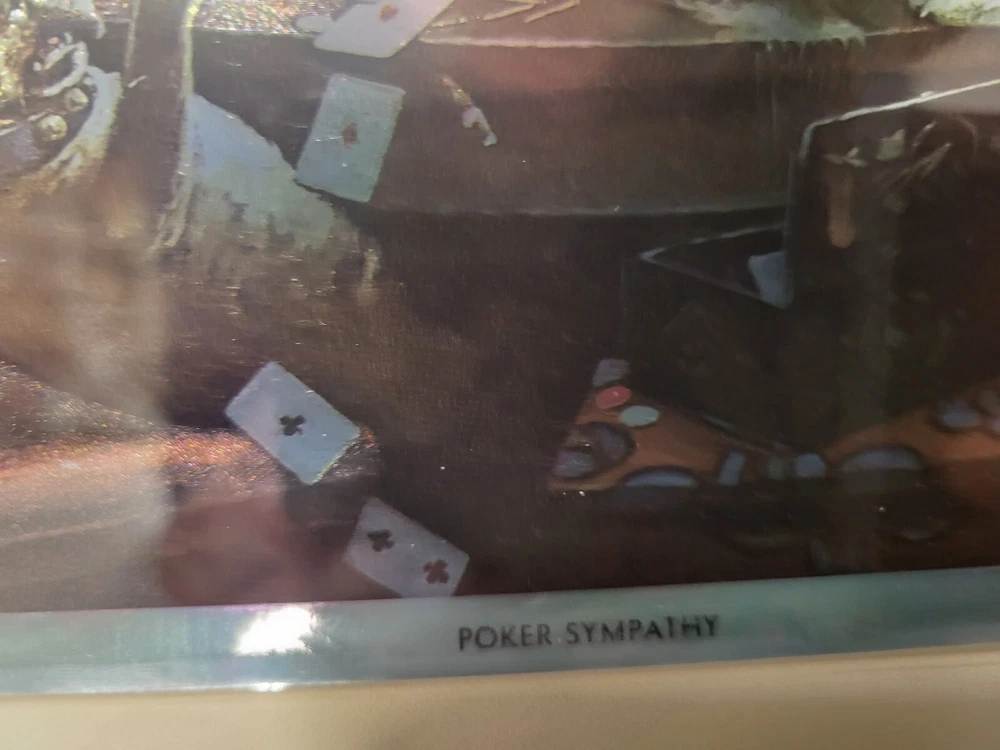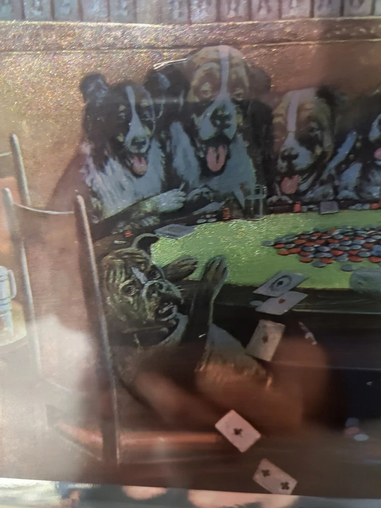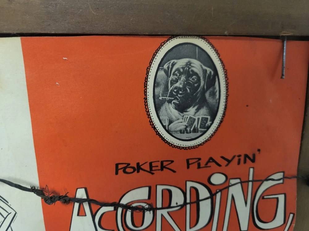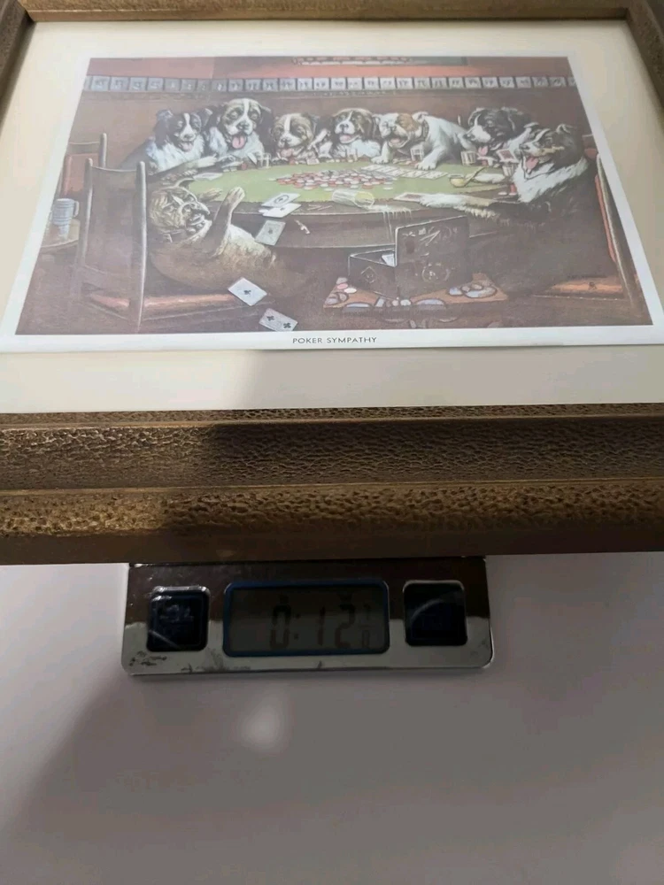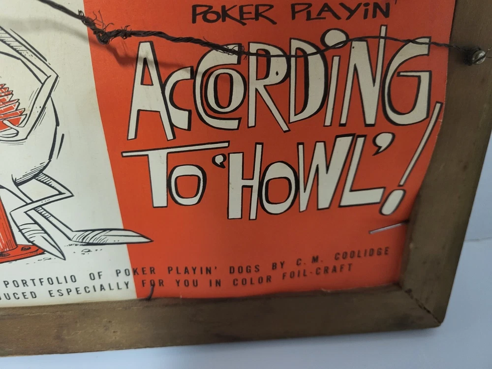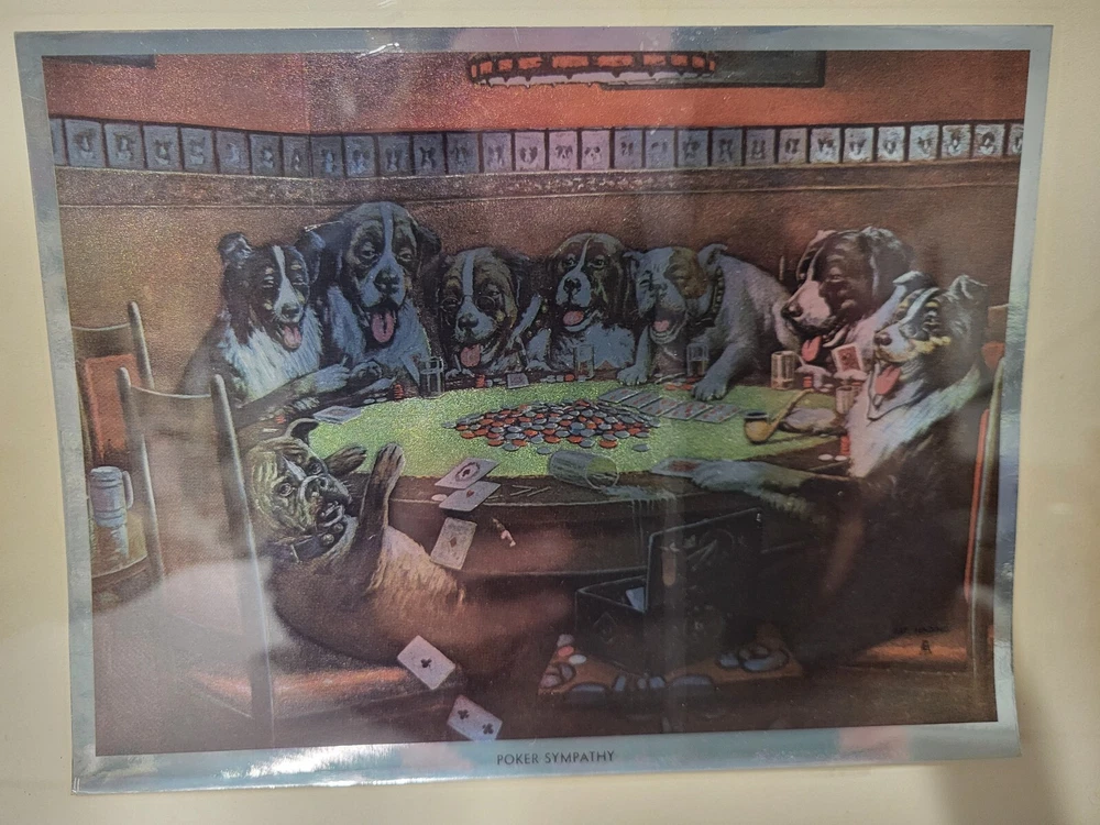 Vintage Framed Print "Poker Sympathy" By C M Coolidge Dogs Playing Cards In Color Foil Craft which has a sort of 3D Effect at different angles. Old Wood frame shows light wear. Print is free of tears or rips. 10.5" ht, 13" Length, 1" Depth. Will sell Print Only Without Frame if Requested. Please see Matching Pictures "A Friend In Need," "A Bold Bluff," & "Sitting Up With A Sick Friend," also in my listings. Will combine shipping if purchasing more than one.