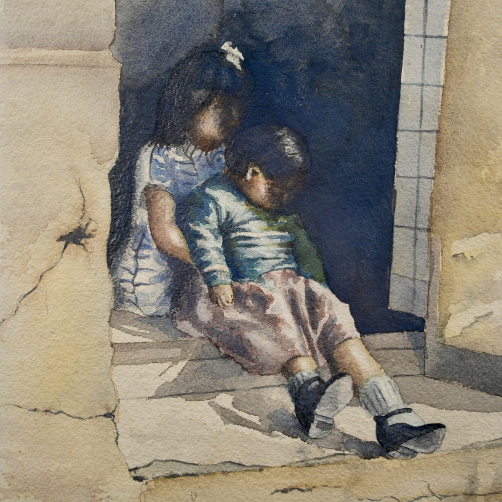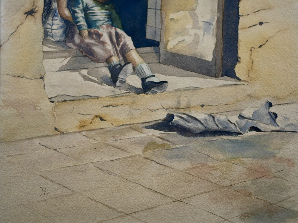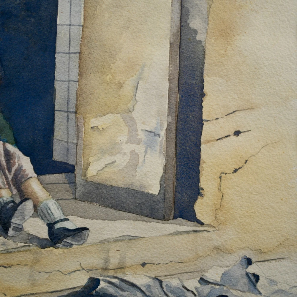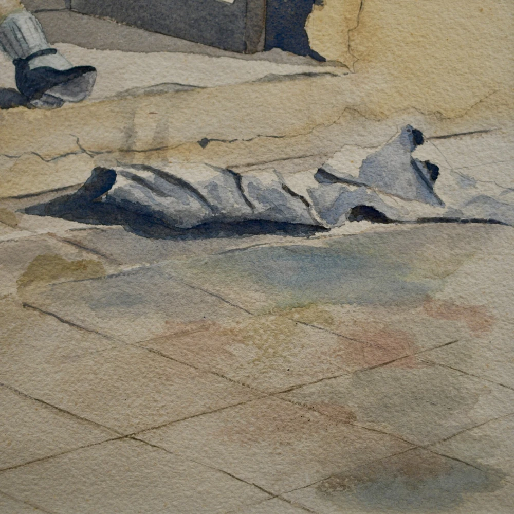 The Vintage ( Circa.1960s ) Framed Original Watercolor Painting on Paper "Street Scene After the War" , Illegibly Signature in Lower Left. The Painting Depicts A Desolate and Silent Street Scene After the War. In the Cold Wind, Two Exhausted Children Snuggled Together at the Gate Near the Street, Feeling Confused and Helpless About the Unknow Future Life in the War. There are Still Residual Bullet Marks on the Wall of the Street Building. The Painting Presents the Dilapidated and Decadent Street through Cold Tones and Simple Composition, Reflecting the Cruelty and Ruthlessness Brought By the War to Ordinary People. The Painting Shows Minimal Toning, and Some Wear on the Frame Consistent with Age, In Good Condition. Title: "Street Scene After the War" Artist: Illegibly Signature Time Period: 1960s Medium: Watercolor on Paper Condition: Good Condition Frame Size: 30" By 26" Sight Size: 17-1/4" By 13-1/4" Available For Domestic Shipping and International Shipping. Thanks!
