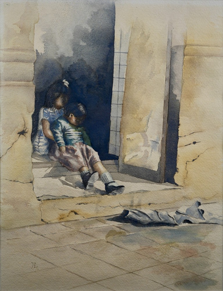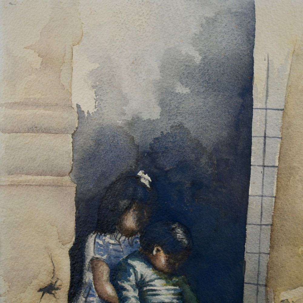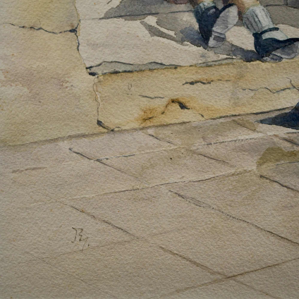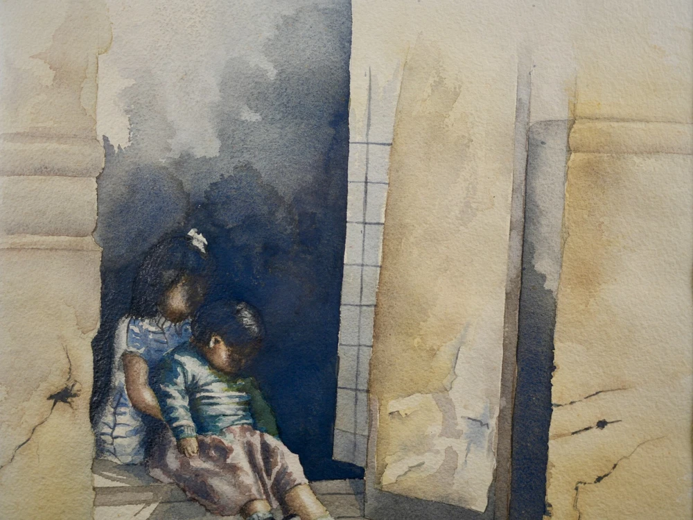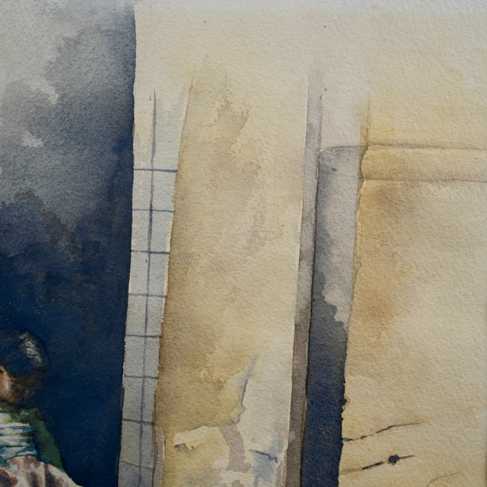 The Vintage ( Circa.1960s ) Framed Original Watercolor Painting on Paper "Street Scene After the War" , Illegibly Signature in Lower Left. The Painting Depicts A Desolate and Silent Street Scene After the War. In the Cold Wind, Two Exhausted Children Snuggled Together at the Gate Near the Street, Feeling Confused and Helpless About the Unknow Future Life in the War. There are Still Residual Bullet Marks on the Wall of the Street Building. The Painting Presents the Dilapidated and Decadent Street through Cold Tones and Simple Composition, Reflecting the Cruelty and Ruthlessness Brought By the War to Ordinary People. The Painting Shows Minimal Toning, and Some Wear on the Frame Consistent with Age, In Good Condition. Title: "Street Scene After the War" Artist: Illegibly Signature Time Period: 1960s Medium: Watercolor on Paper Condition: Good Condition Frame Size: 30" By 26" Sight Size: 17-1/4" By 13-1/4" Available For Domestic Shipping and International Shipping. Thanks!