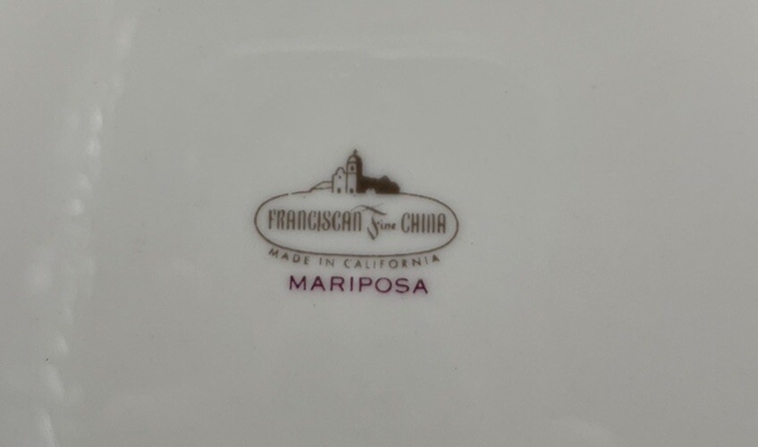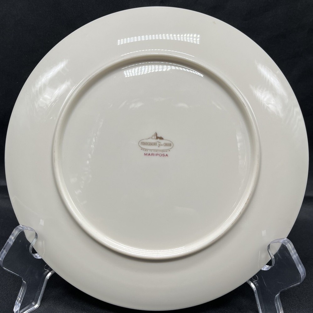 Backstamp: Printed Shape: Round Vintage: Yes Country/Region of Manufacture: United States Origin: California Set Includes: Salad Plate Pattern: Mariposa Brand: Franciscan Color: Multicolor Material: Bone China, Porcelain Original/Licensed Reproduction: Original Occasion: All Occasions Plate Diameter: 6.75” Type: Salad Plate