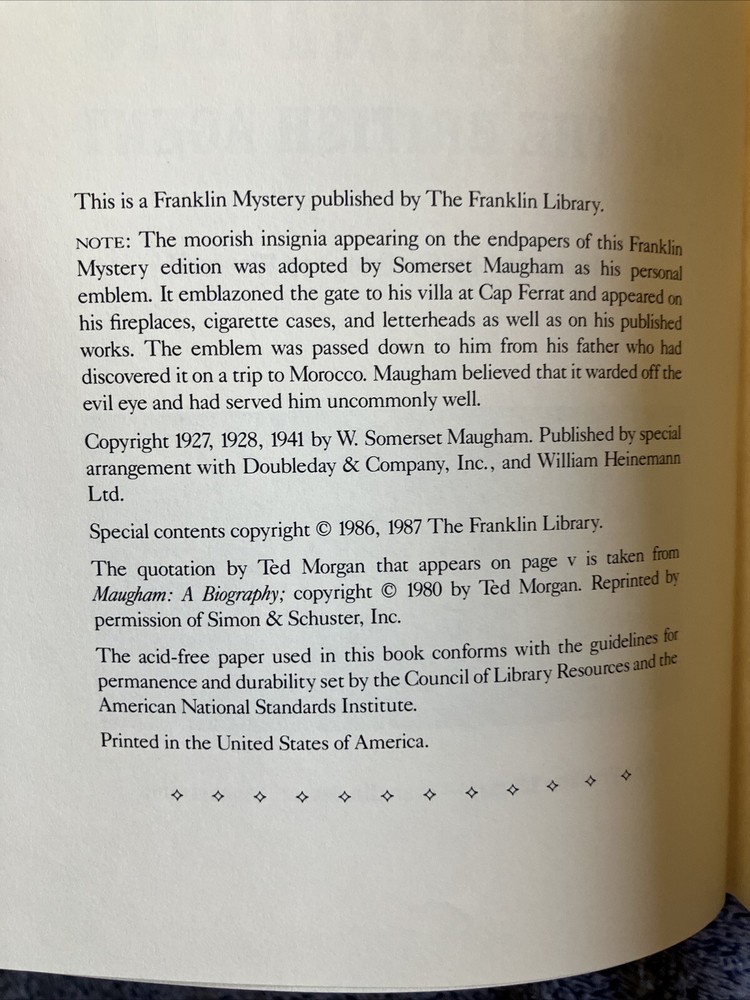 Bump On Cover——-Delve into the captivating world of mystery and suspense with the Franklin Mystery Library edition of "Ashenden" by W. Somerset Maugham. This luxurious leather-bound volume, printed in 1987, is a treasure for both collectors and fans of gripping narrative. The book offers a seamless reading experience in English, with its pages bound in supple leather that promises to age well. Ashenden takes you on a journey through intrigue and espionage, with Maugham's masterful storytelling that has stood the test of time. Published by the prestigious Franklin Library, this book is not just a reading material but a piece of craftsmanship from the United States, perfect for display or to be savored in a cozy nook. Please ask all questions before bidding. Please see all photos. If you are unhappy with item,please contact me to resolve the problem before opening a case,I value your business and work hard to keep a top seller rating, Thank You!