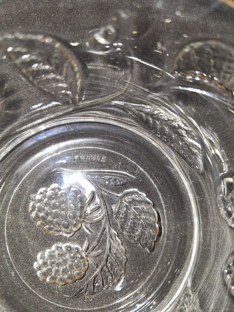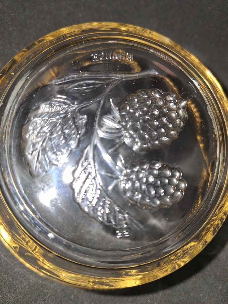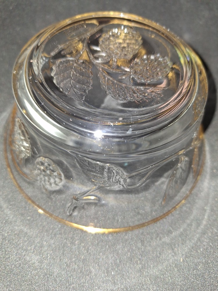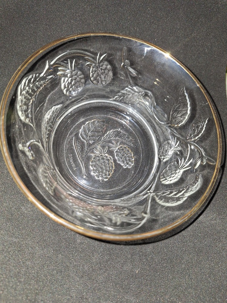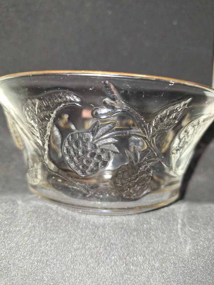This is a vintage clear glass bowl with a gold rim and grape vine design. The bowl is made in France and has a diameter of 5 inches and a depth of 2 1/4 inches. It is a decorative piece that is suitable for all occasions and should be hand washed only. The bowl is an original and has a vintage pattern with a round shape. The finish is glossy and the bowl is an ideal gift for someone who loves fruit themed decor.