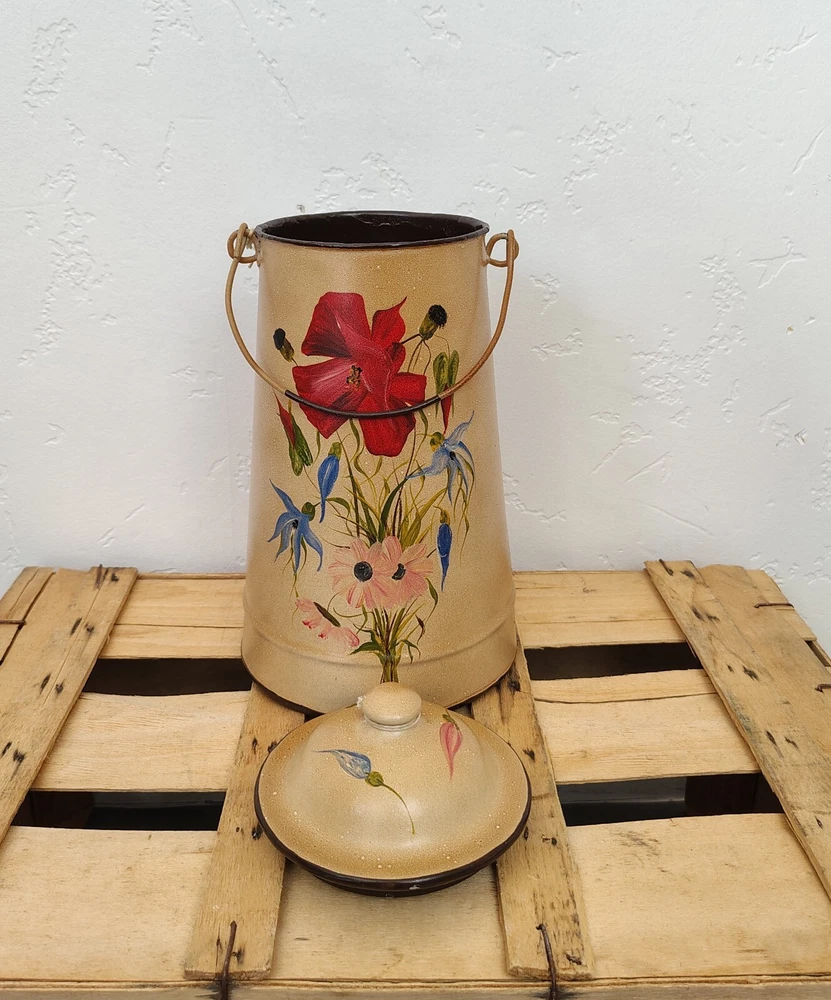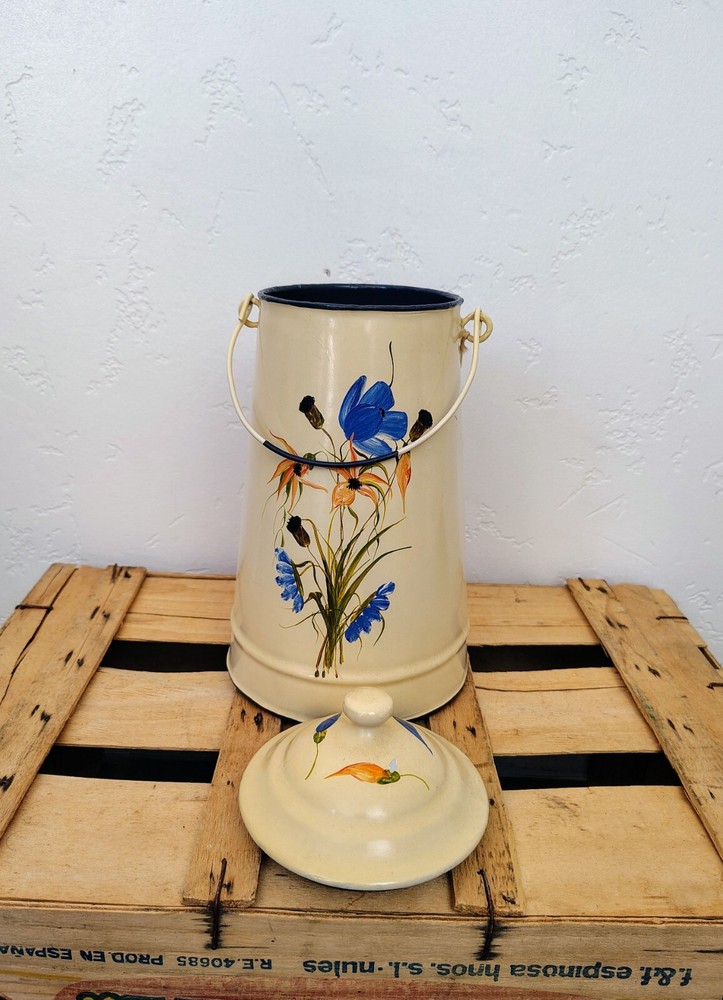 The vintage French enamelware milk coffee pot doubles as a charming flower vase, with its classic white enamel finish adding a touch of antique elegance to any space. This versatile piece showcases the timeless beauty of enamel material, making it a desirable collectible item for those who appreciate vintage kitchen decor. They have been decorated with new paintings Dimensions 26 x 14 cm // 10.23 x 5.51 inches