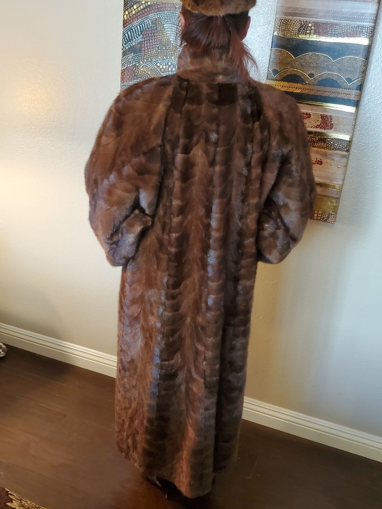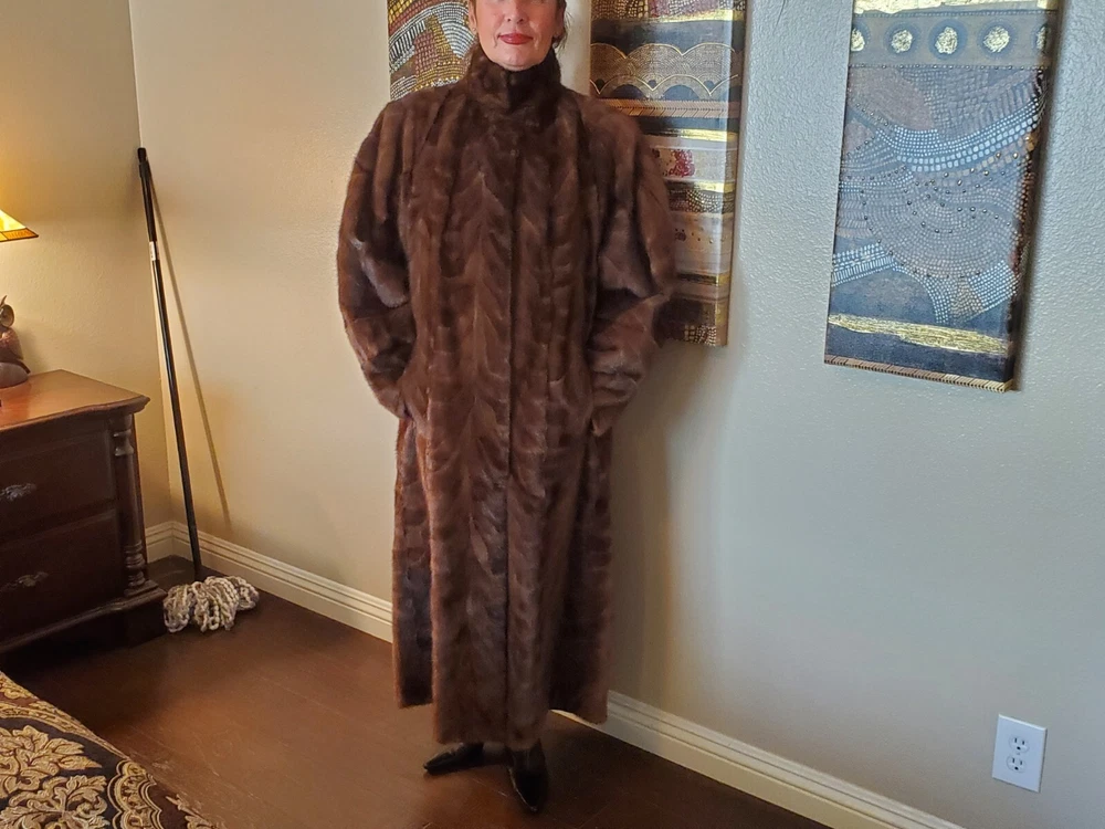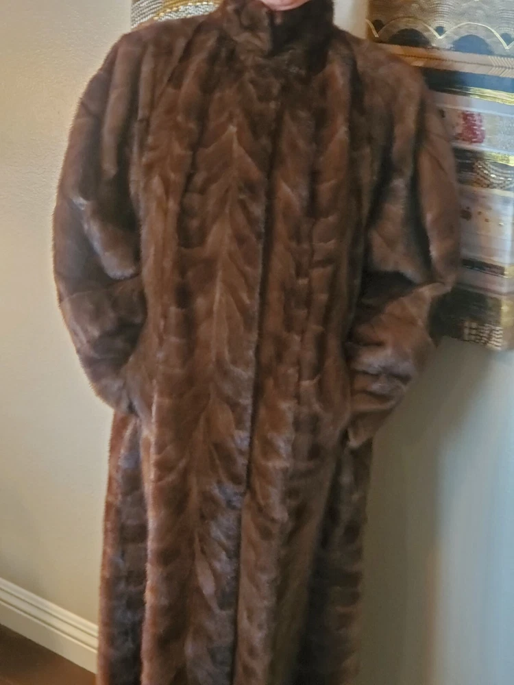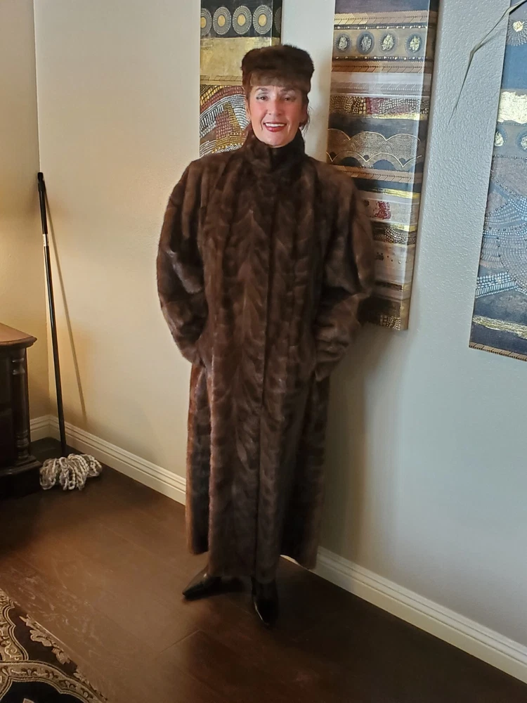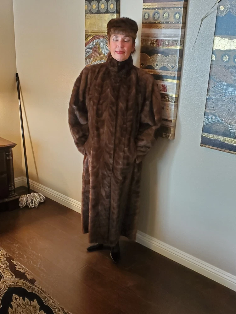 This stunning full-length mink coat is the epitome of luxury and style. The soft beige fur feels incredibly plush against the skin, while the silk lining adds extra comfort. The matching hat ties the elegant look together perfectly. The craftsmanship is impeccable, with clean stitching and a flattering silhouette that drapes beautifully. It keeps you warm without being bulky, making it ideal for formal events or chilly evenings. The classic design ensures it never goes out of fashion. A true investment piece that elevates any outfit instantly.