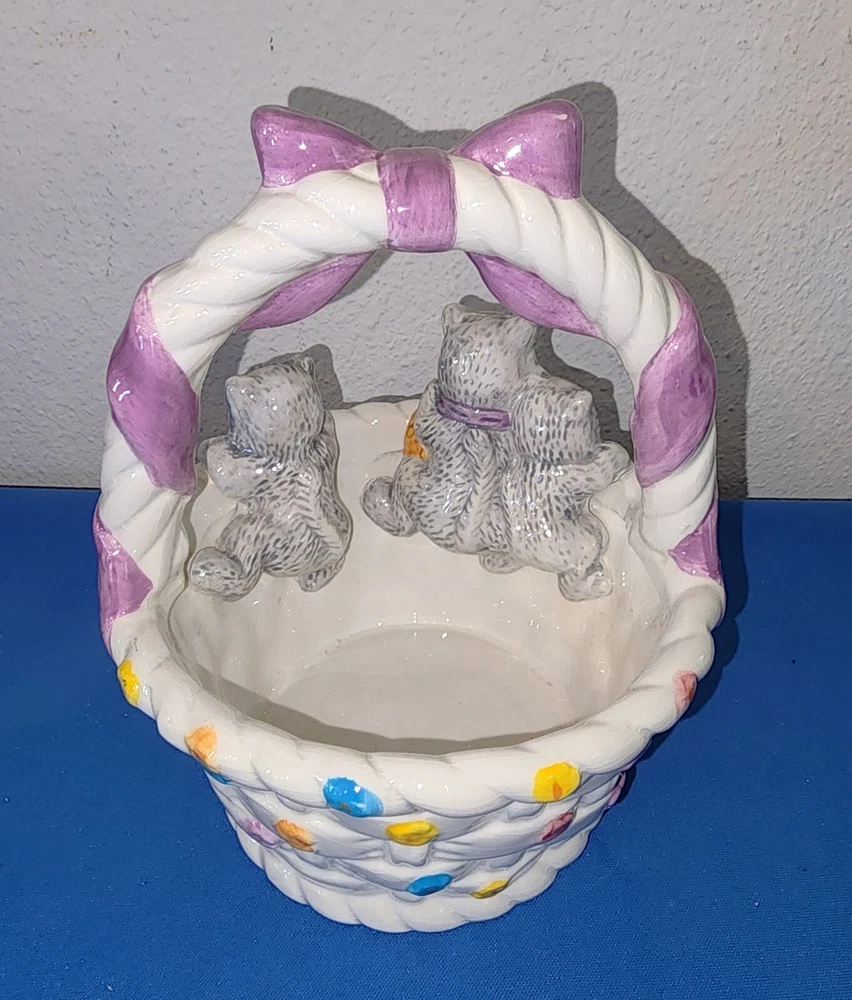 Vintage GAC Ceramic Colorful Easter Basket, 3 Kittens Playing New Size 6 1/2" Tall x 5" Wide