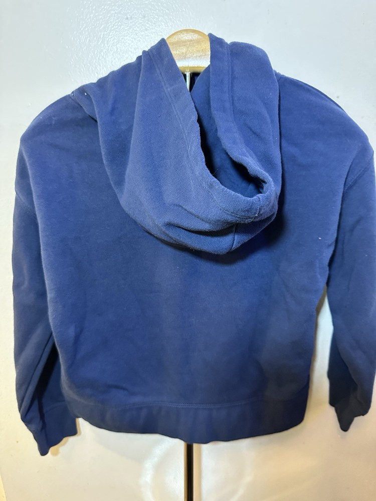 This is a GAP pullover sweatshirt for youth boys in blue, featuring a hood with the GAP logo embroidered on the front. It has long sleeves, a pullover closure, and pockets. Made of a cotton-polyester blend fabric, this casual hoodie is suitable for travel, activewear, and everyday wear in fall, winter, and spring. Easy to care for with machine washing, it is a classic style with a regular fit for boys size S.