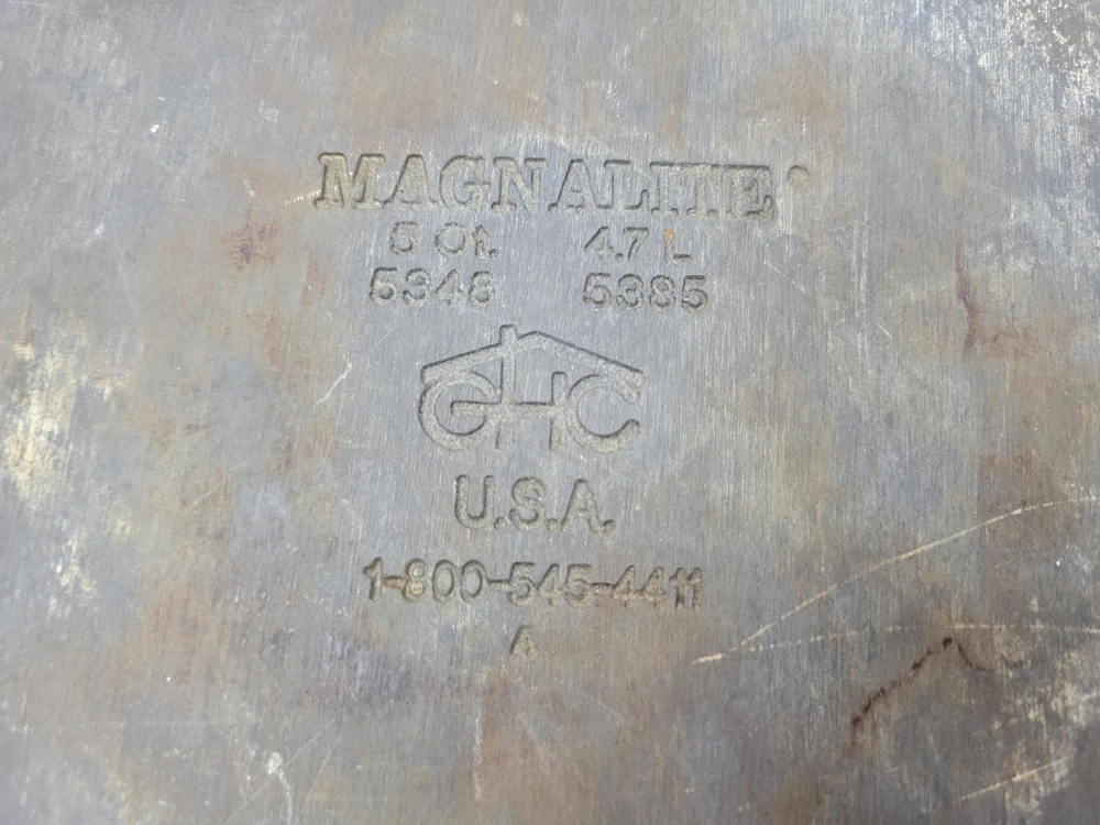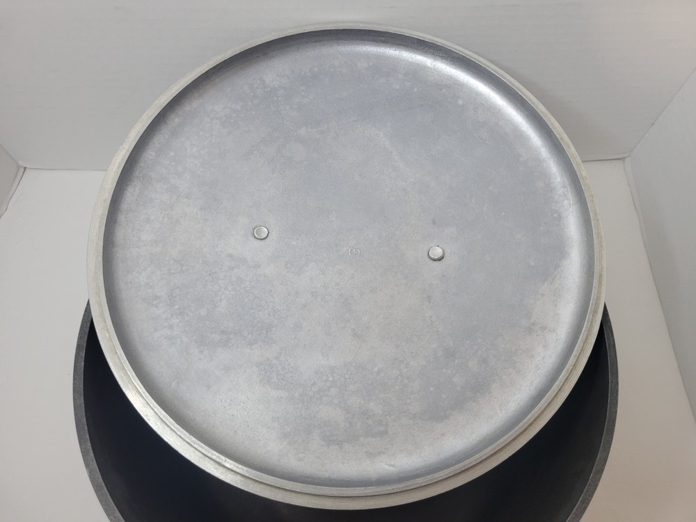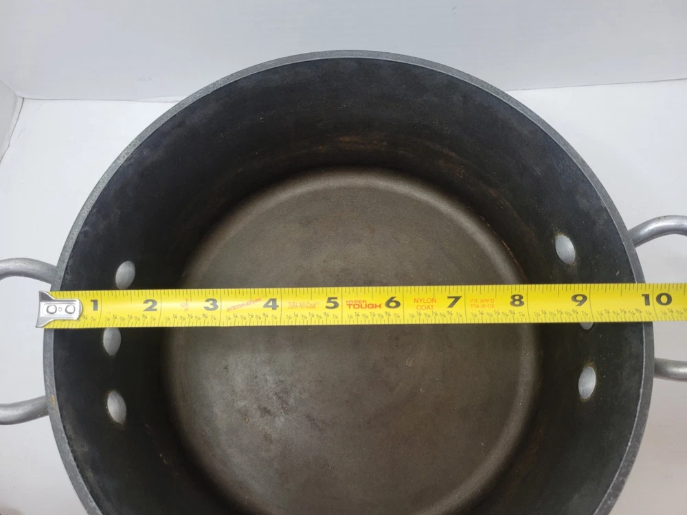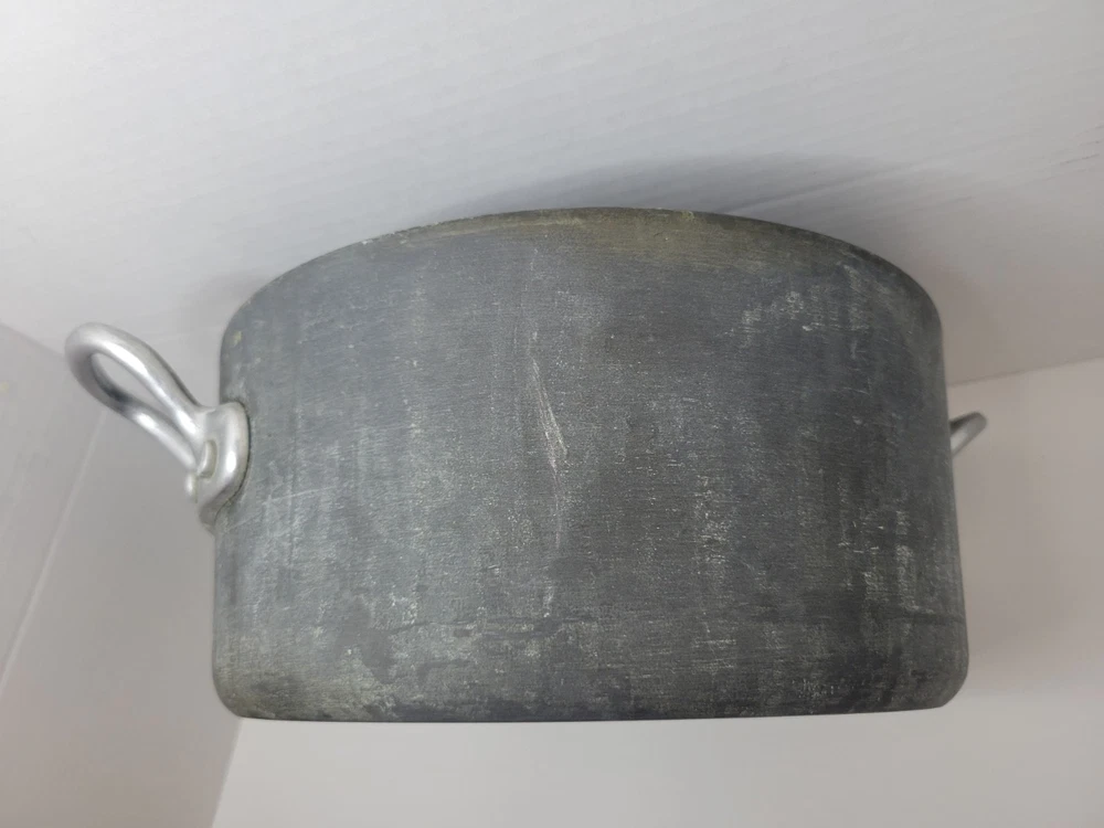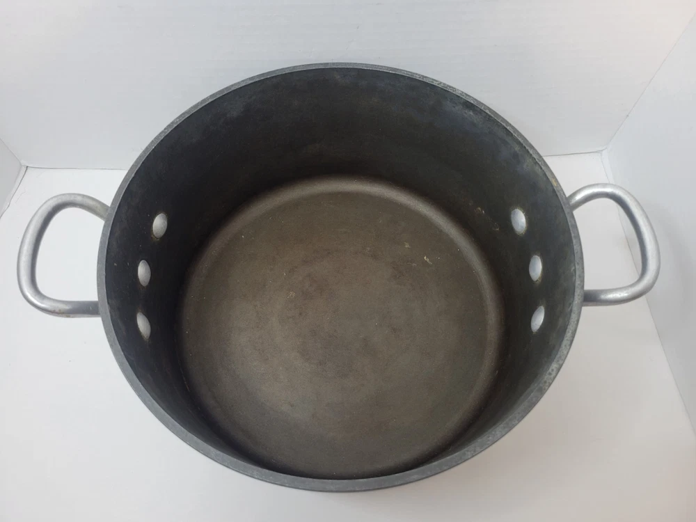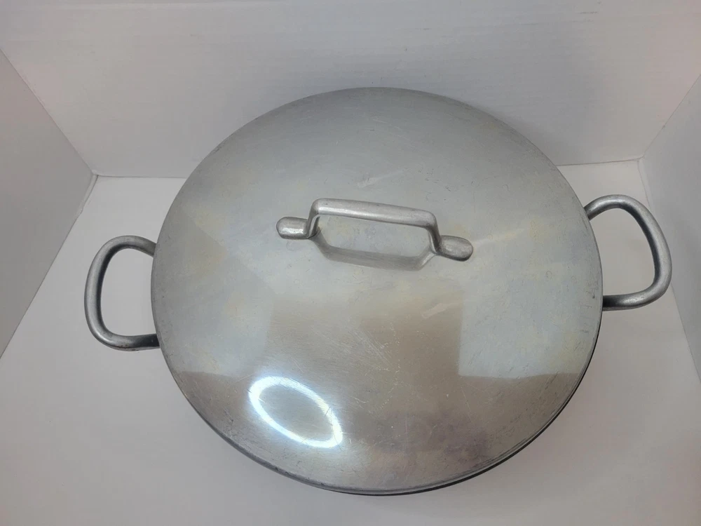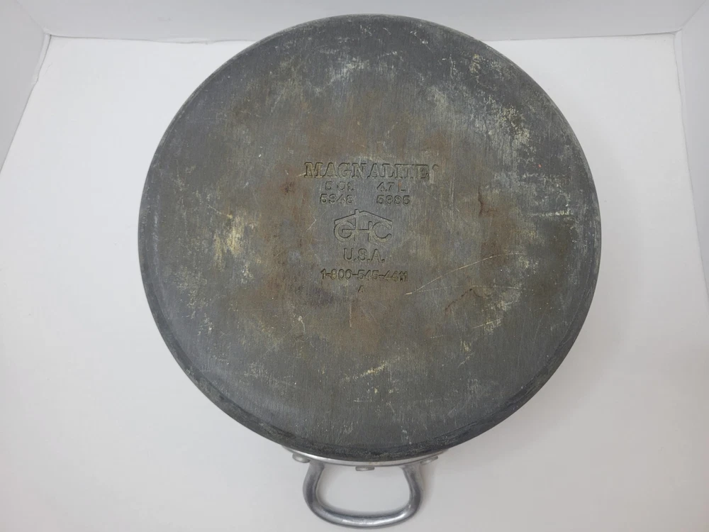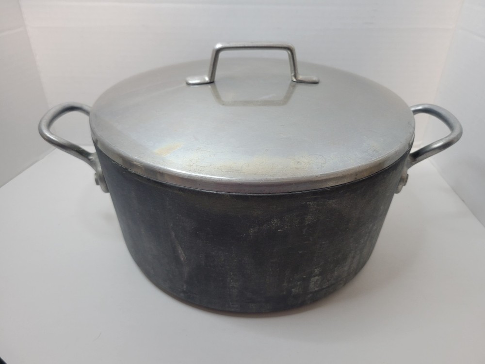 This 5-quart GHC Magnalite Dutch oven is crafted from durable anodized aluminum, offering excellent heat distribution for consistent cooking results. Its round design and sturdy handles ensure ease of use and versatility in the kitchen. • Capacity: 5 quarts • Durable anodized aluminum construction • Sturdy side handles for secure grip • Vintage design with timeless appeal Features: Vintage/Stock Pot/Round Dutch Oven/Cookware Size: 5 Quart/4.5 Liter/10inches across x 4.5inches depth Condition: Pre-Owned Good- The interior of this pot is in excellent condition! There is a light visible scratch, however there is no deep pitting or deep scratches in the middle of the interior of the pot. I feel like the sides are starting to oxidize because of the white showing up on it. Overall a fantastic pot to own. I've had several in my time and I've always loved cooking with these types of pots. The lid and pot itself both sit flat with no wobble! This item is in good pre-owned vintage condition with signs of wear/use typical of age. Please refer to photos for additional condition details.