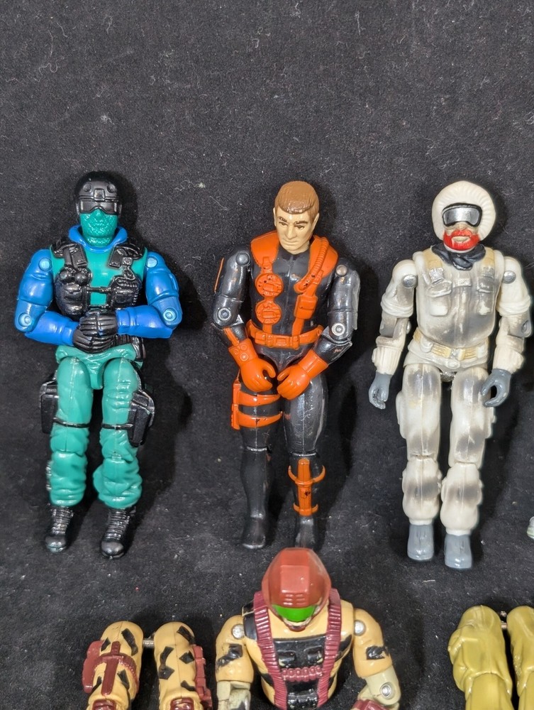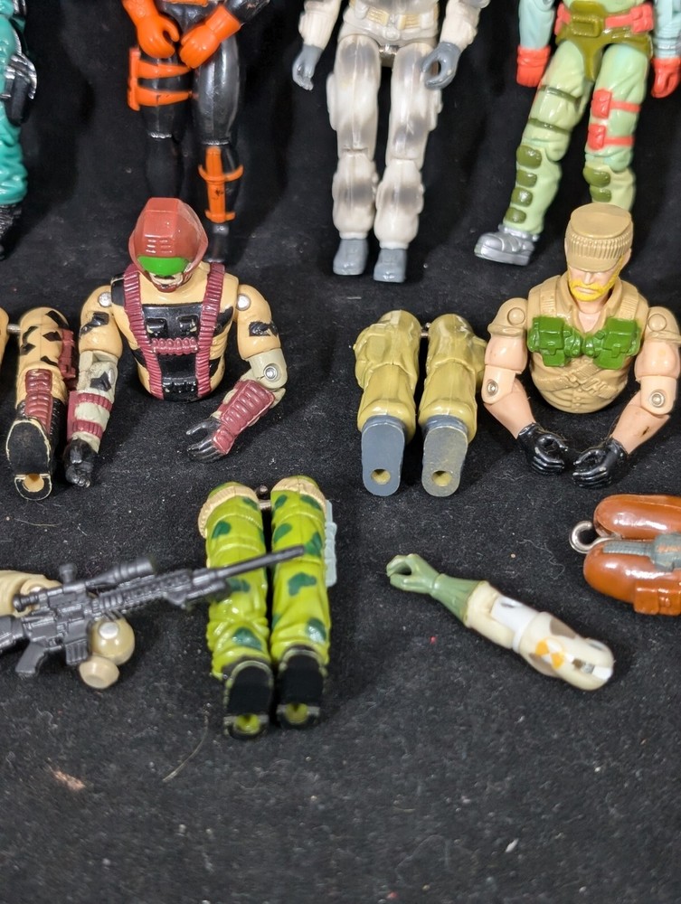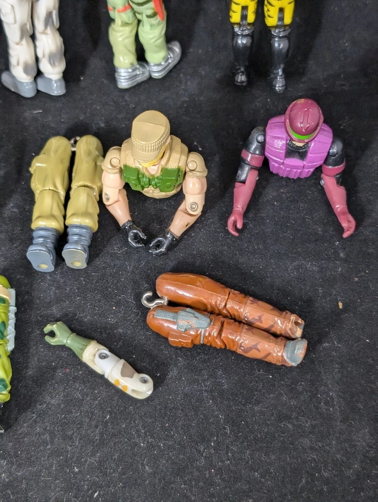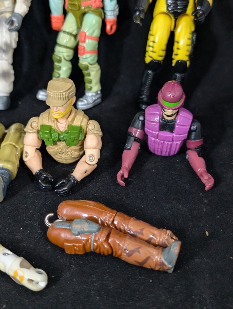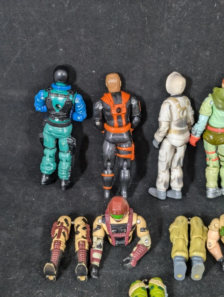 This Vintage GI JOE Action Figure Lot includes figures and body parts from the 1980's and 90's. The set features characters such as Deep Six, Wet Suit, and Snow Job, all made from durable plastic material. The figures stand at 3.75 inches tall and are in great shape for their age. This lot is perfect for collectors of vintage action figures, especially those interested in the G.I. Joe franchise. The figures come from the popular TV show G.I. Joe Arah and are sure to bring back memories of childhood playtime. Don't miss out on the opportunity to add these classic action figures to your collection.