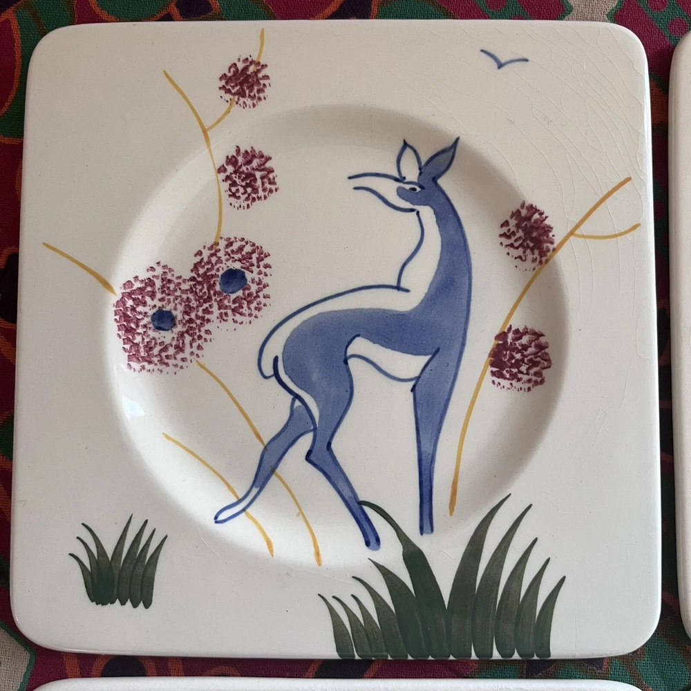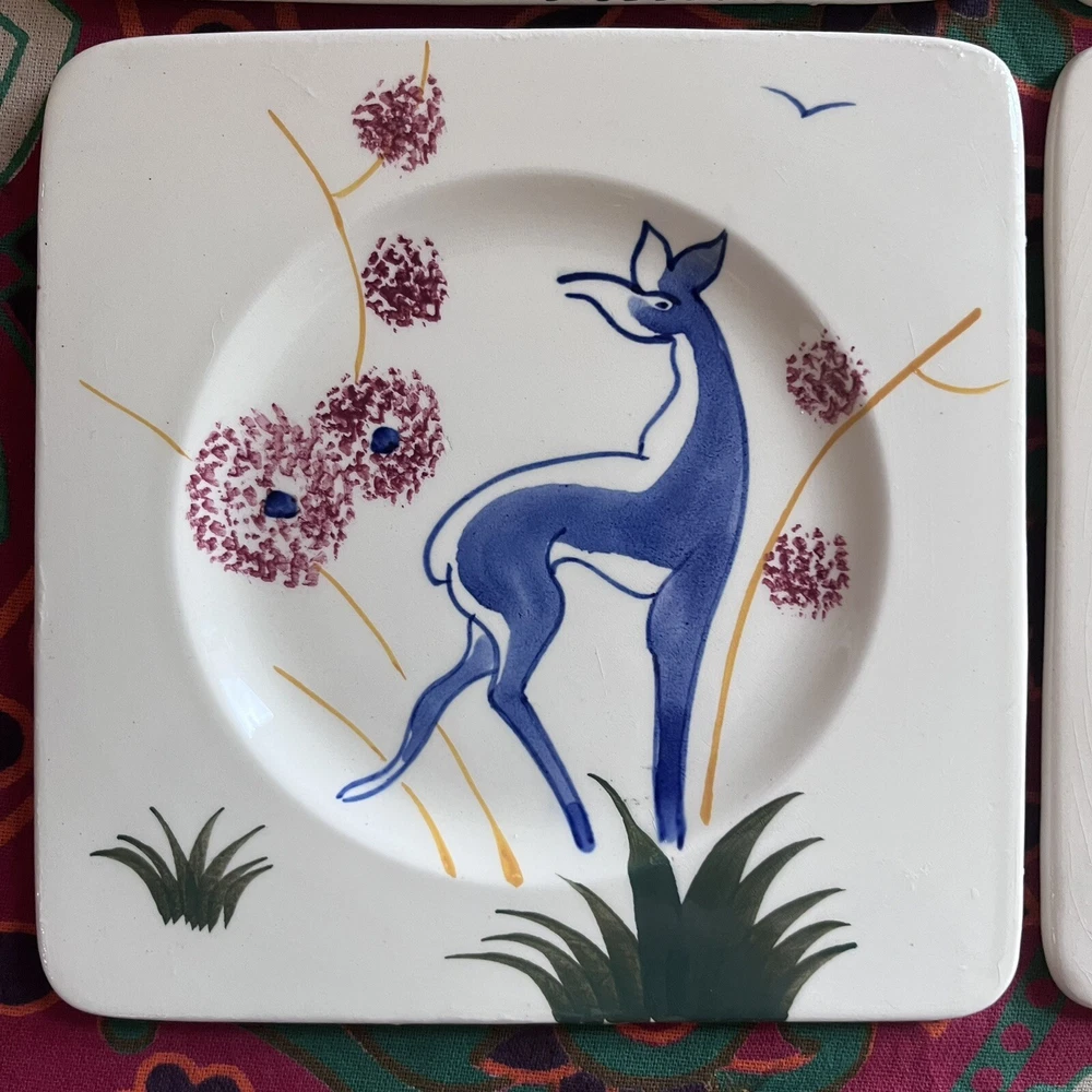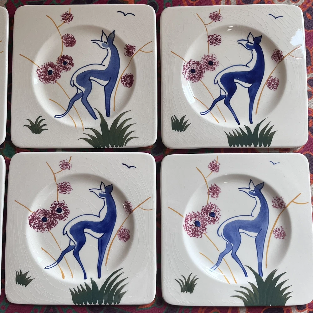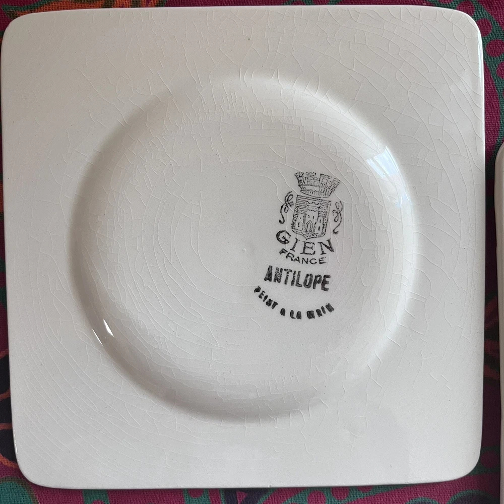 Vintage GIEN France Plates x 6 ANTILOPE Peint À La Main Bread, Tea, Canapé, or Hors D'oeuvre Square Plates Porcelain, Hand Painted with an "Antilope" in the center surrounded by red flowers with one flying bird shape. Circa 1950's Listing is for 2 plates with antilope design Colors: shades of blue, green, red, and deep yellowish-gold Measures approximately: 5.75" square Great vintage condition consistent with age and usage. Slightly rough around outside edges possibly manufacturing flaws. They do not appear to be flea bites. Some crazing on back of plates. One dark back edge of one plate.