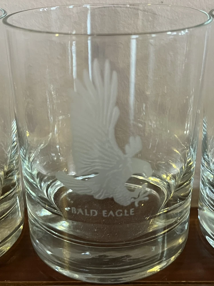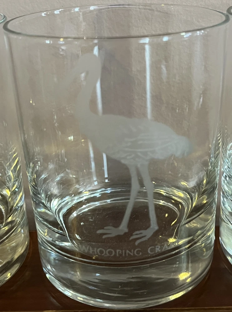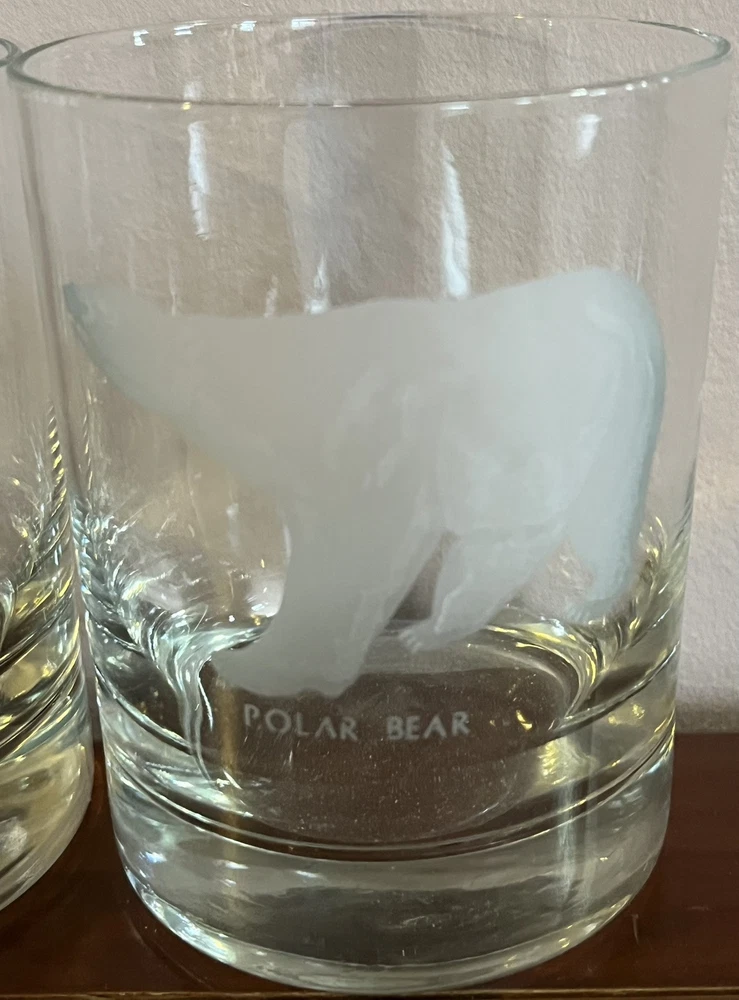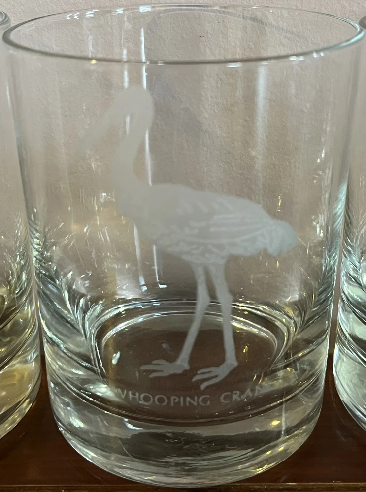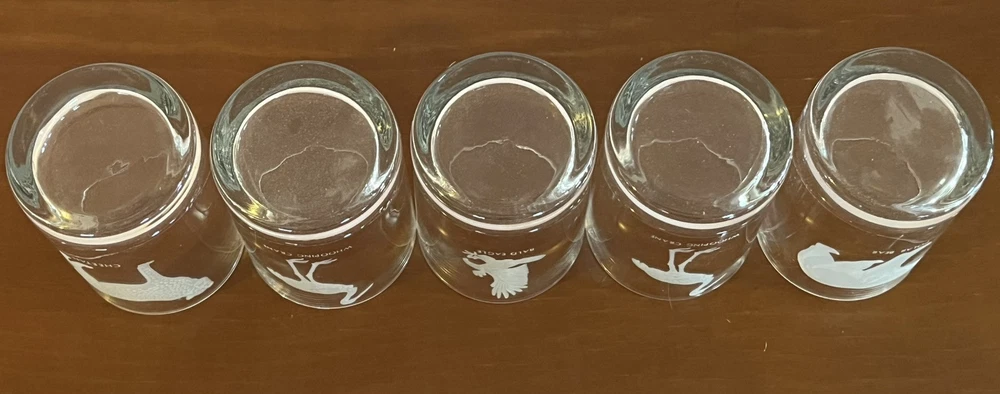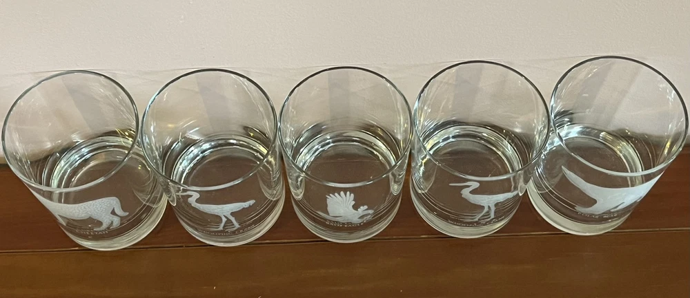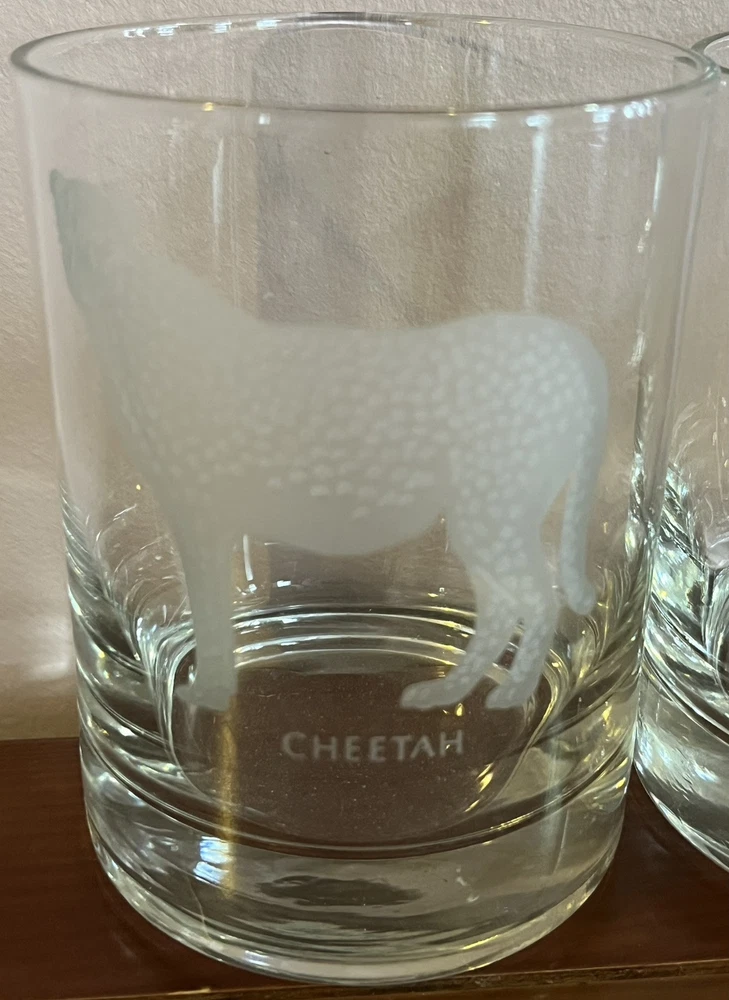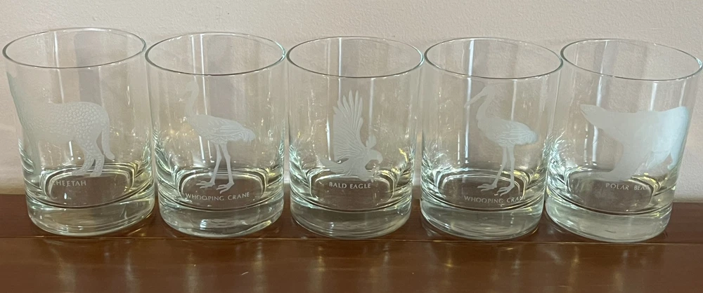 This is a set of five vintage Georg Jensen tumbler glasses with etched wildlife designs. The glasses are made of clear frosted glass and feature different animal designs on each glass. The set includes a Cheetah, Bald Eagle, Polar Bear, and two Whooping Crane glasses. The glasses are part of the Georg Jensen Wild Animals product line and are suitable for all occasions.