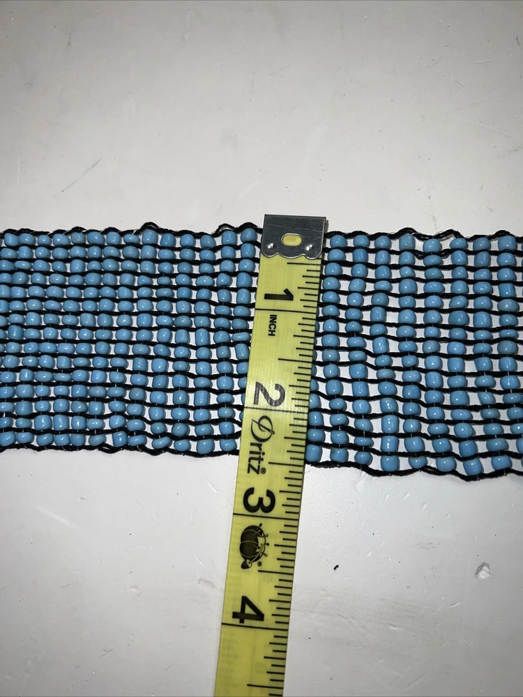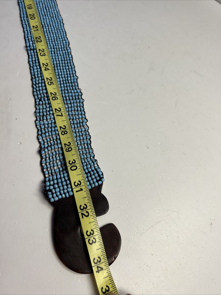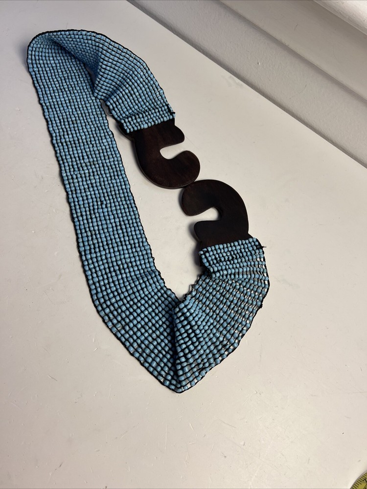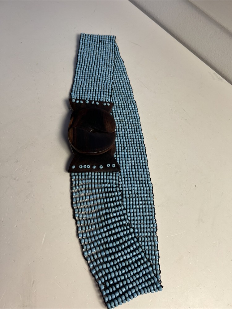 Add a touch of bohemian charm to your wardrobe with this vintage wide beaded belt from MCM. The teak buckle and gypsy accents give a unique look that is perfect for any festival or art event. The belt is made of high-quality beads and wood hardware, making it a durable and stylish accessory. This waist belt is one size fits all and features a beautiful blue color that will complement any outfit. Whether you're going for a 70s or 80s retro look, or simply want to add a touch of ethnic and fun to your wardrobe, this belt is the perfect choice. Handmade with care, this belt is a must-have for any bohemian or vintage lover.