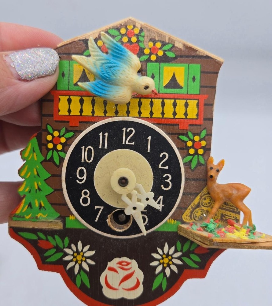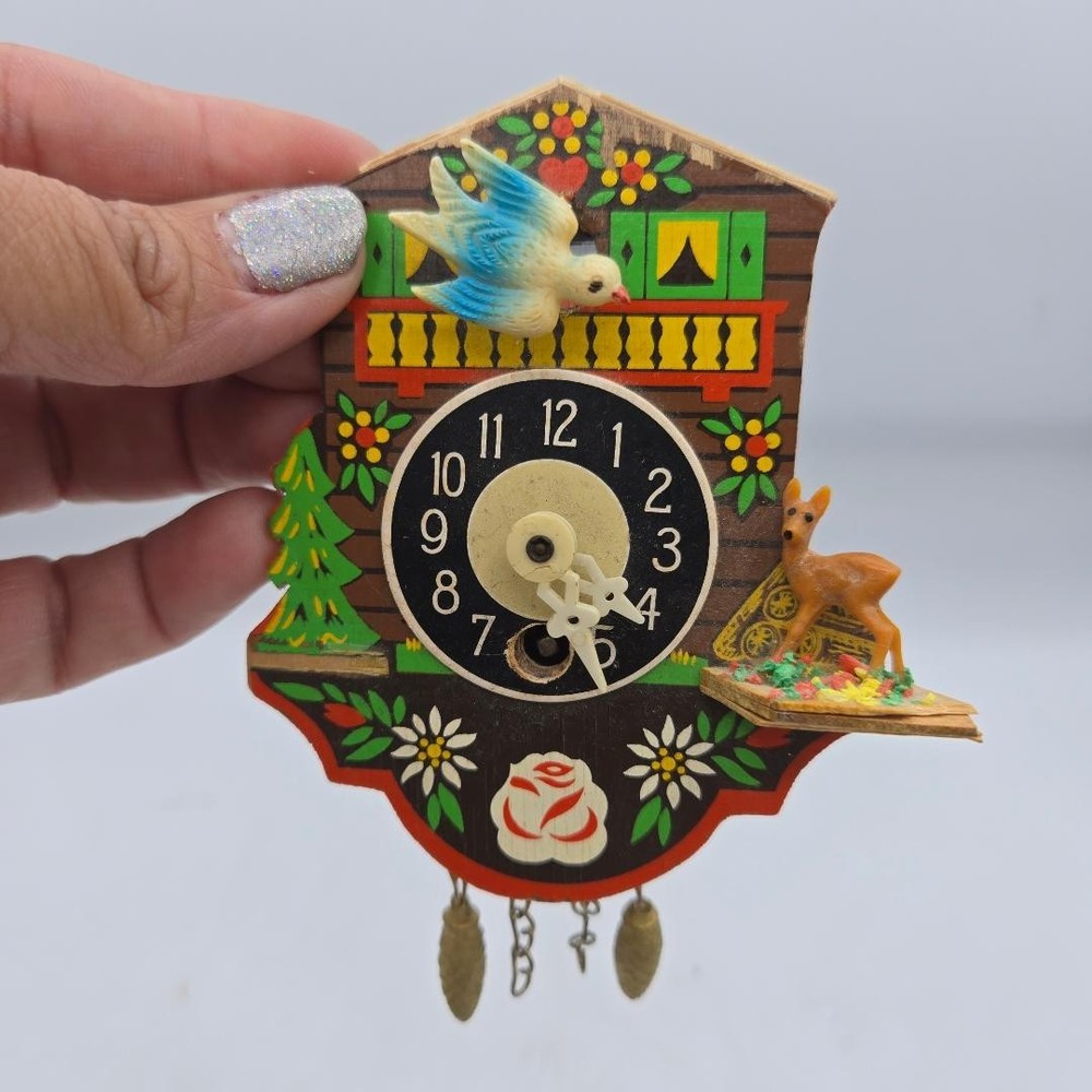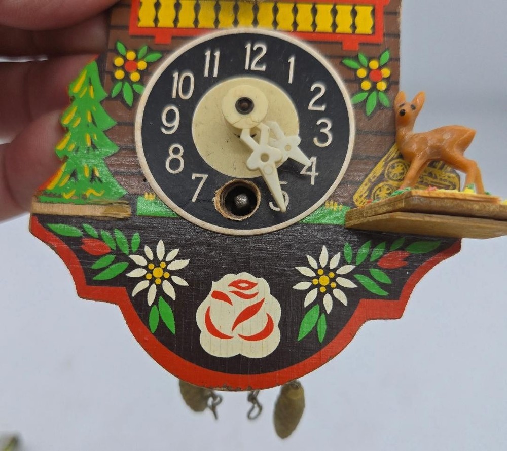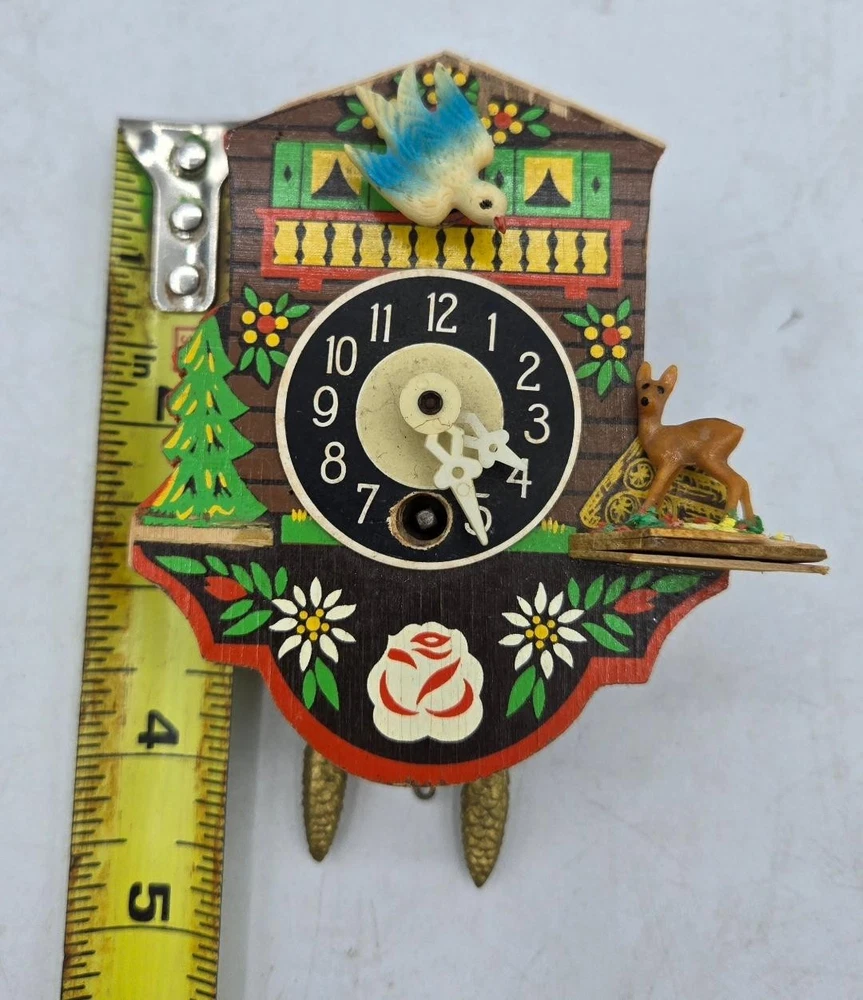Movement: Mechanical Style: Black Forest Seller Notes: “Clock is NOT working” Power Source: Spring Material: Plastic, Wood, Wood and Plastic Antique: No Finish: Painted Color: Multicolor Theme: Chalet With Bird Brand: Unbranded Item Height: 5" Country/Region of Manufacture: Germany Display Type: Analog Vintage: Yes Colour: Multicoloured