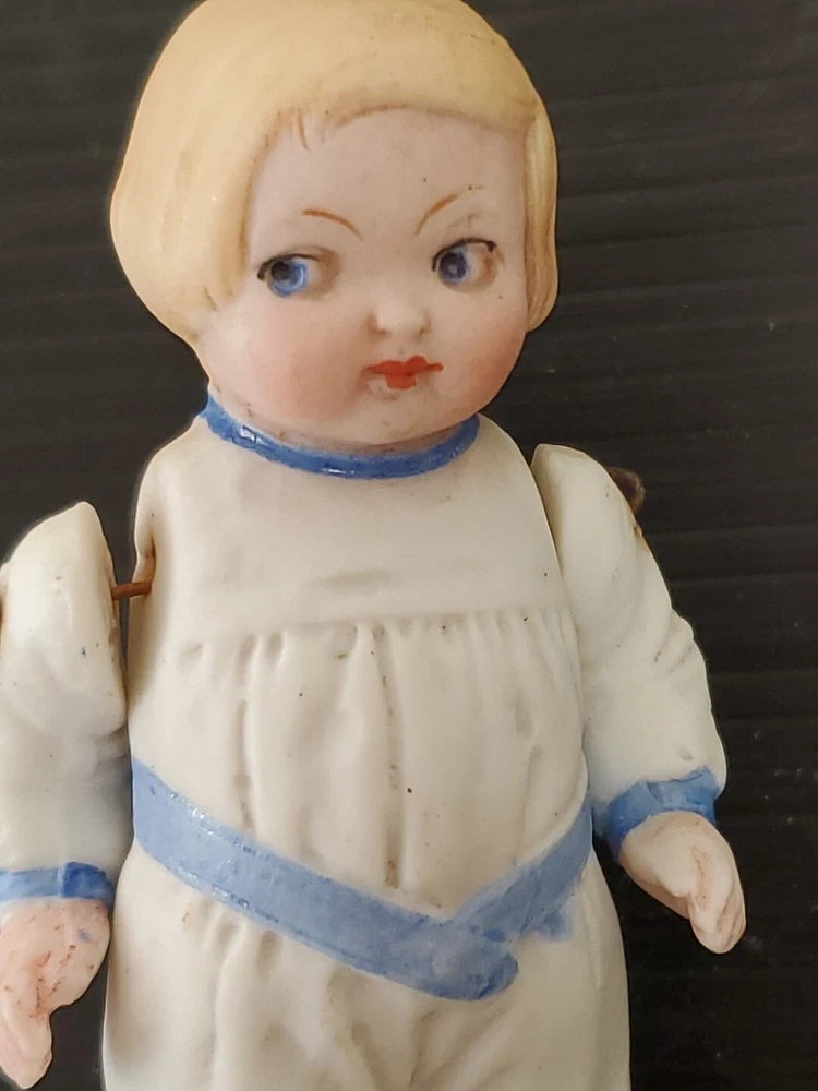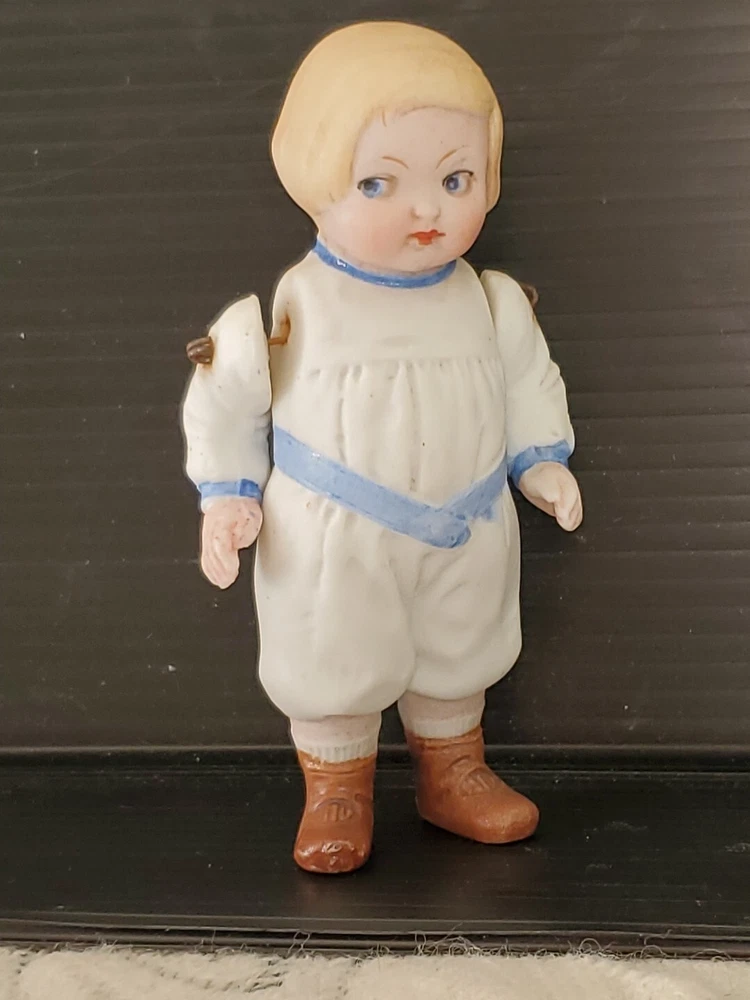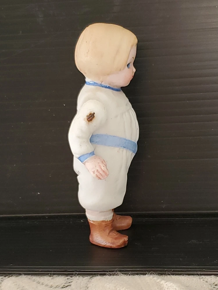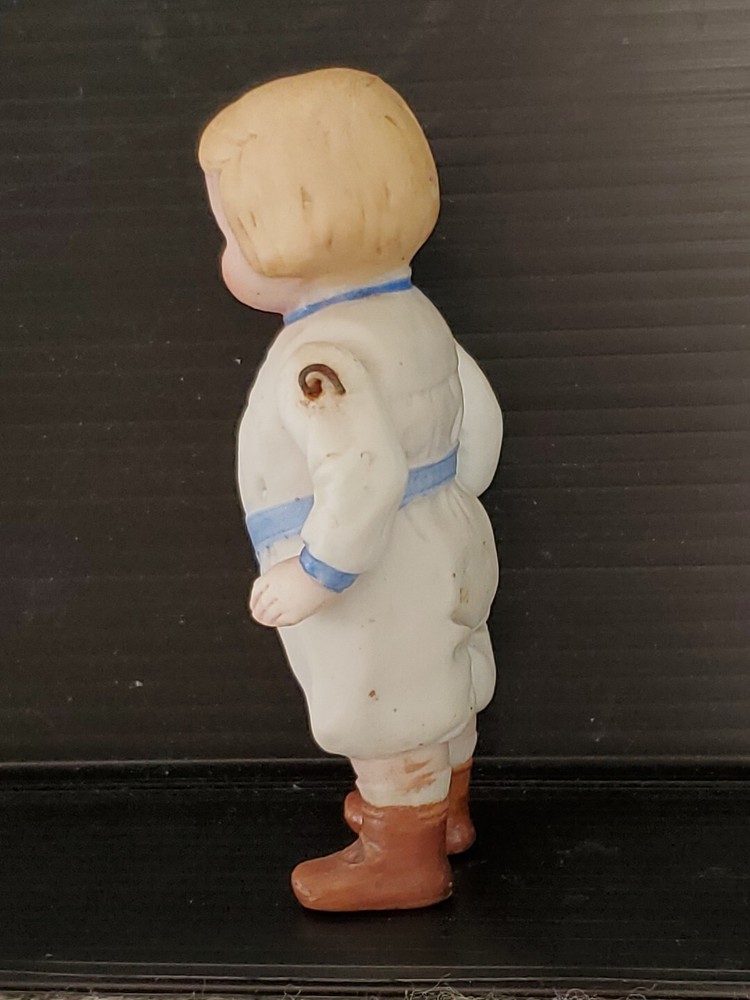 Doll Hair Type: Straight Ethnicity: Caucasian Item Length: 4" Brand: Unbranded Type: Porcelain Doll Doll Size: 3.5" Antique: Yes Vintage: Yes Number of Pieces: 1 Doll Gender: Boy Doll Doll Hair Color: Blonde Doll Complexion: Light Original/Licensed Reproduction: Original Set Includes: Doll Country/Region of Manufacture: Germany Time Period Manufactured: 1900-1919 Doll Eye Color: Blue Occasion: All Occasions Material: Bisque