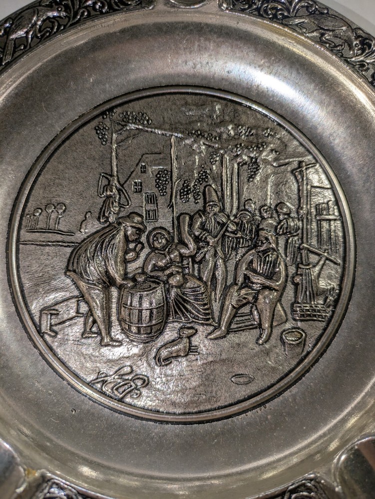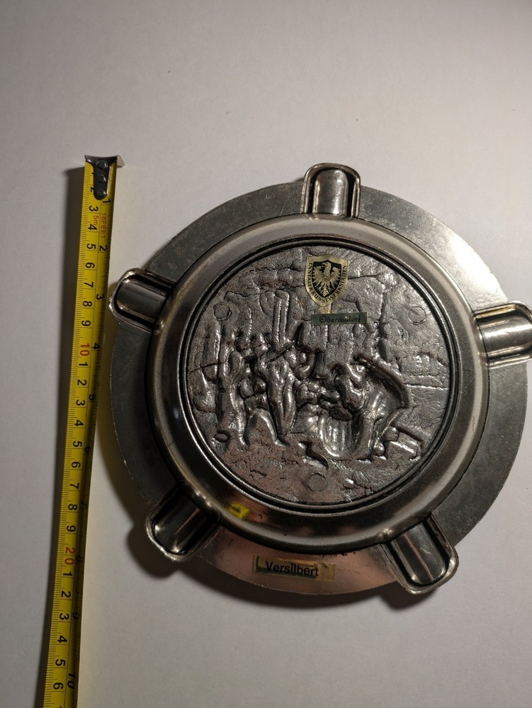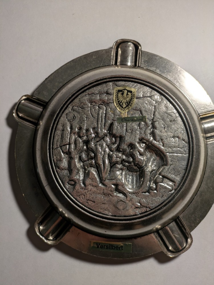 This is a vintage silver-plated (versilbert) German-made ashtray. The original owner of this ashtray was a native German who immigrated to the US and brought many artworks and Deutsch books of his motherland to the US. This fine ashtray has been unmarred by time and would serve well as a decorative table piece.