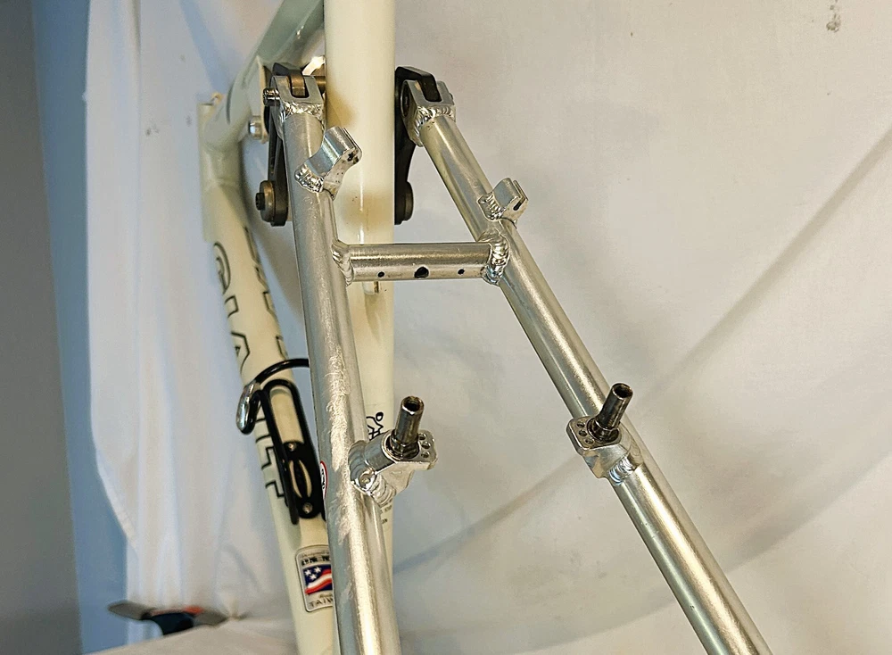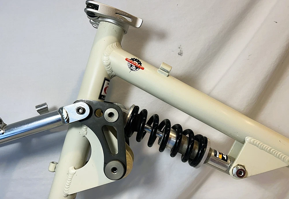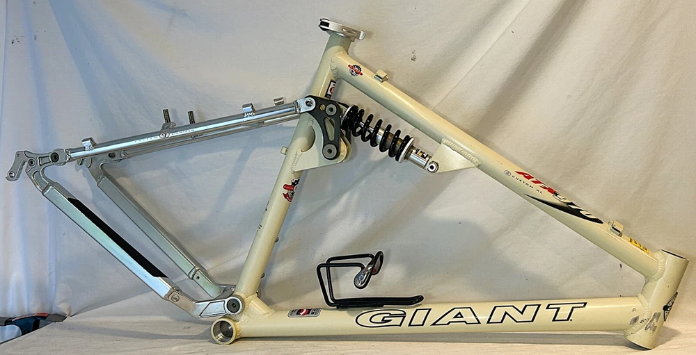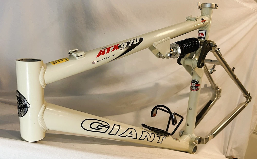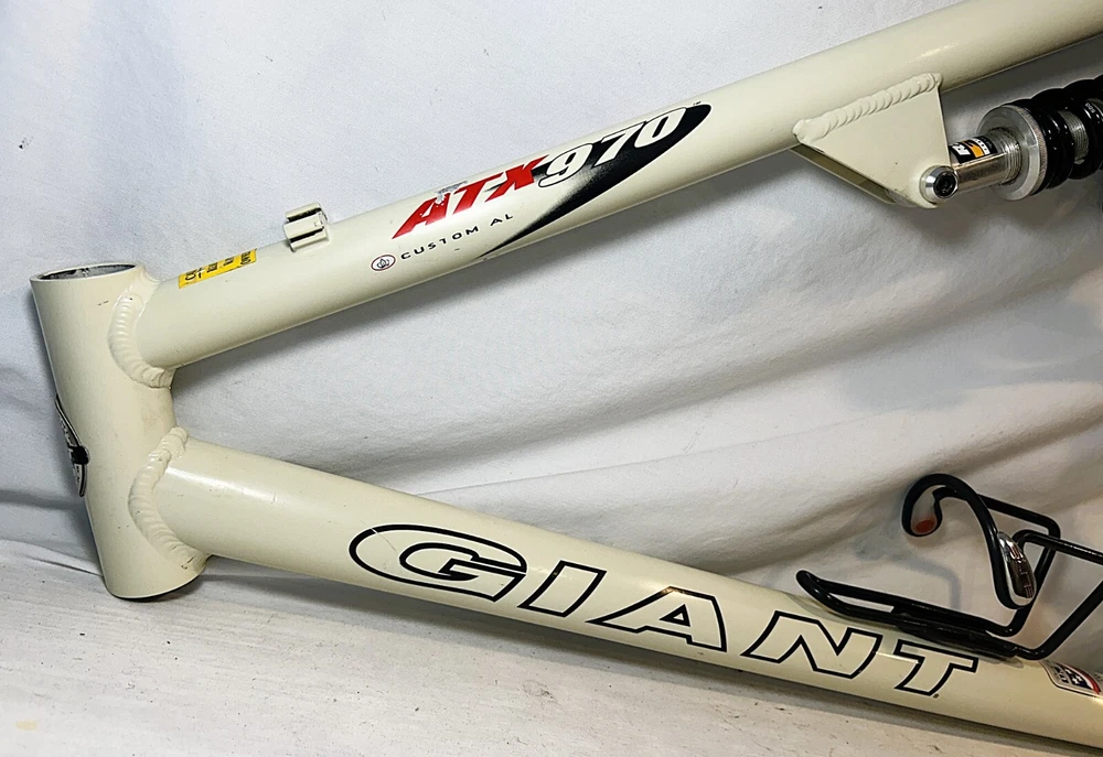 Vintage Giant ATX 970 full suspension aluminum Mountain Bike frame Vintage 90's full suspension mtb frame. This frame takes 26" wheels and was running cantilever brakes. This is labeled as a Large frame - see measurements below. In good condition but still is a used item that shows some wear that may include chips, scratches, cable rub, and other defects associated with a 25-30 year old bike. Please view all pics for an accurate representation. Approximate Measurements : Center to top of top tube : 19" Center to top of seat tube : 20.5" Top tube length: 23" Head tube length: 135mm Head tube diameter: 1.125 (1 & 1/8") Rear Spacing: 135mm Seat post size: 30.8 Weight: 7 lbs. 4 oz. IMPORTANT: Please read this description and thoroughly view all pictures before bidding. Please ask questions if needed. International Shipping will be handled by Ebays Global Shipping Program so fees will apply. I have no control or access to view these fees...all handled by EGSP. I will gladly leave Positive Feedback upon receiving it. Thank You and Have an Awesome Day !