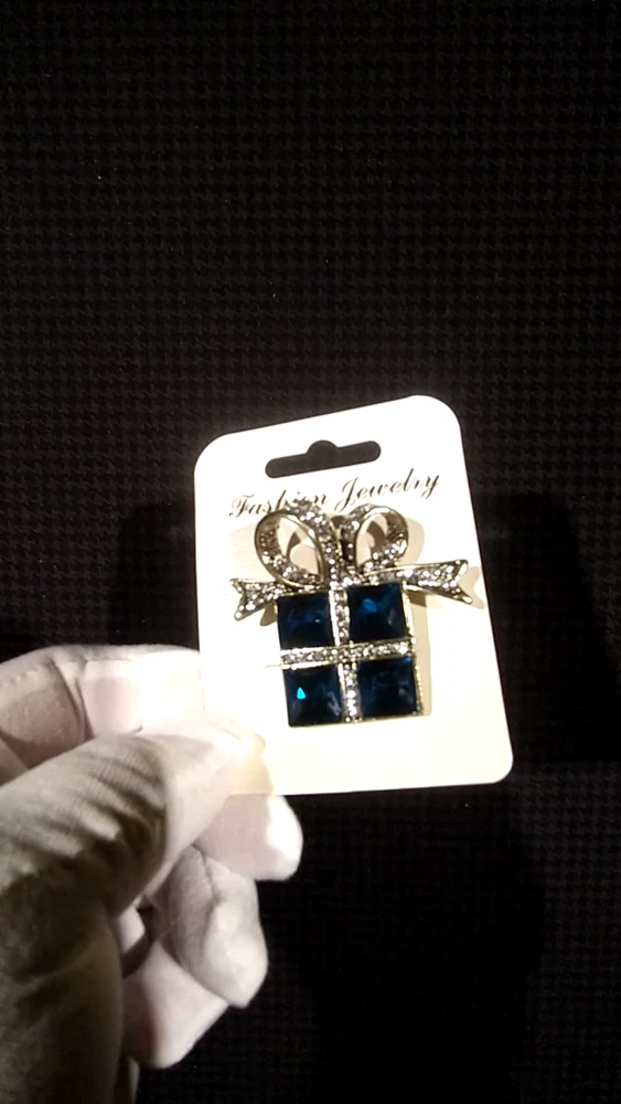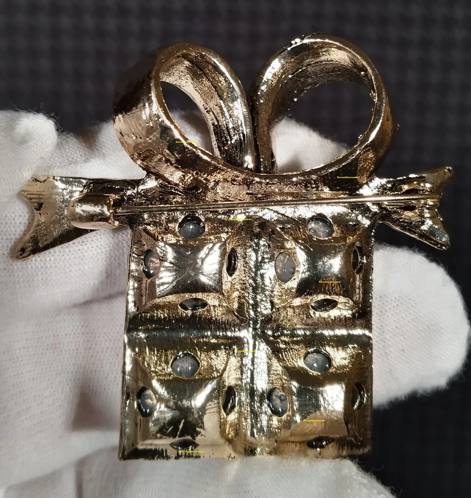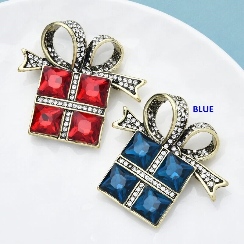 Vintage Gift Box Crystal Rhinestone Blue Bowknot Brooch Pin and Gold Bag - VIDEO Brooch is 2 " x 2 " Free Gold Foil and Cloth Bag Come see all of our other Brooches, Bracelets, Earrings, Necklaces, Pendants, , Rings, and Glow in the Dark jewelry today.