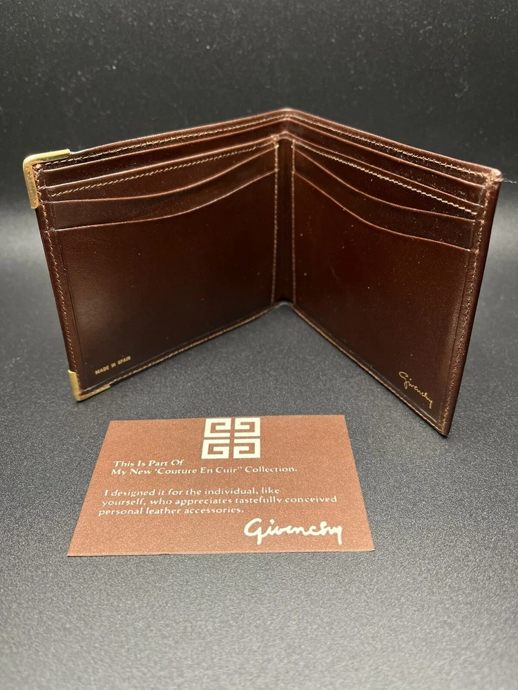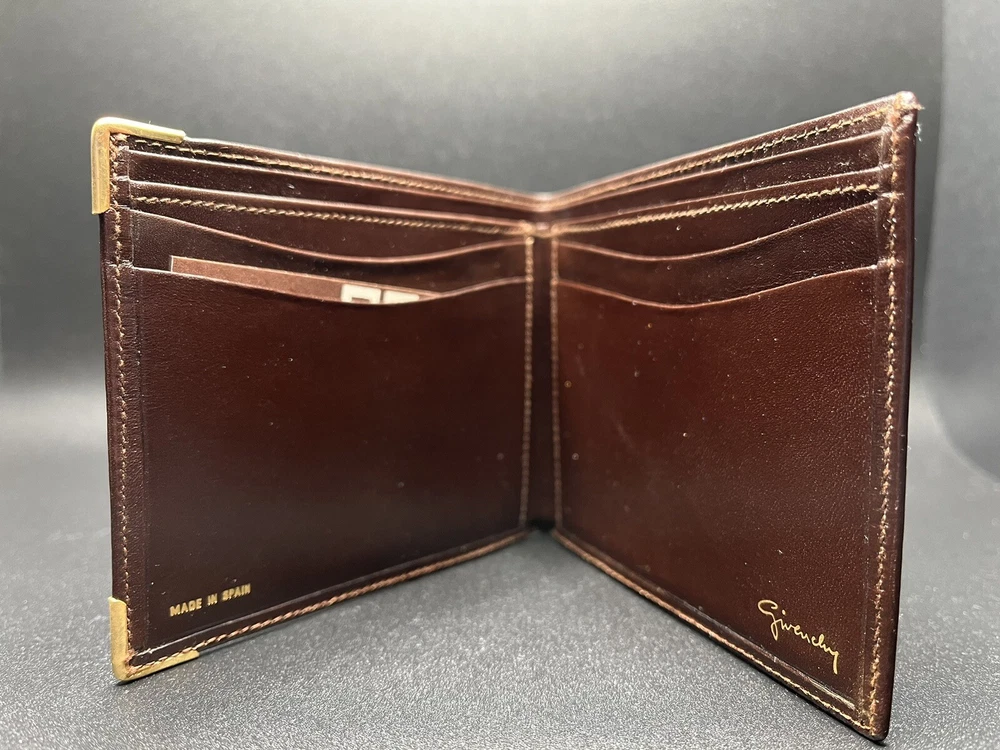 This vintage Givenchy bifold wallet is a must-have for any stylish man. Crafted from high-quality leather, this wallet is both durable and stylish. The brown color and slim design make it perfect for everyday use. The wallet is made in Spain and features the iconic Givenchy brand. It is perfect for storing cards, cash, and other essentials. Whether you're going out for a night on the town or just running errands, this wallet has got you covered.