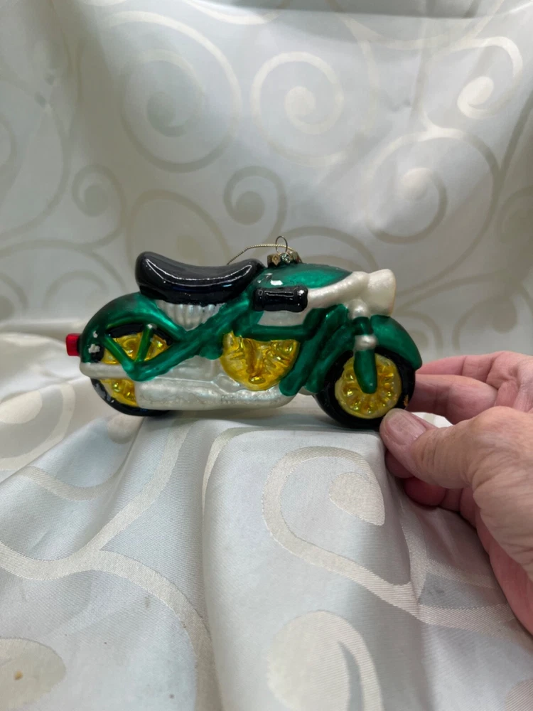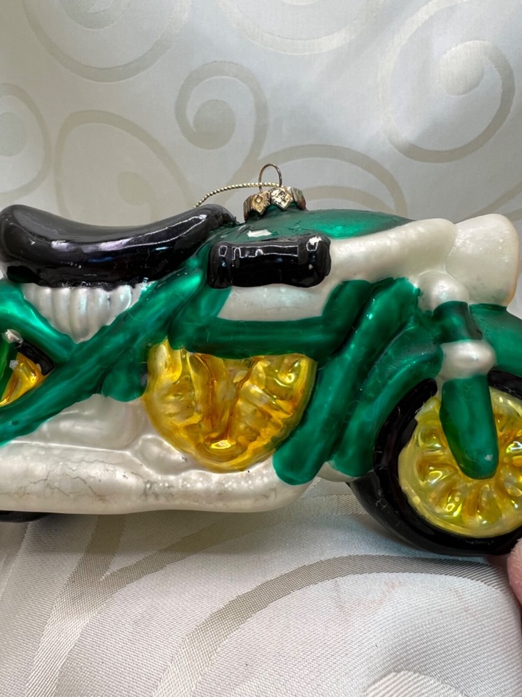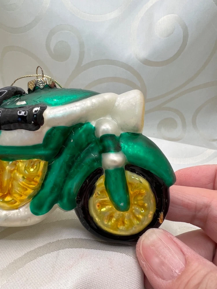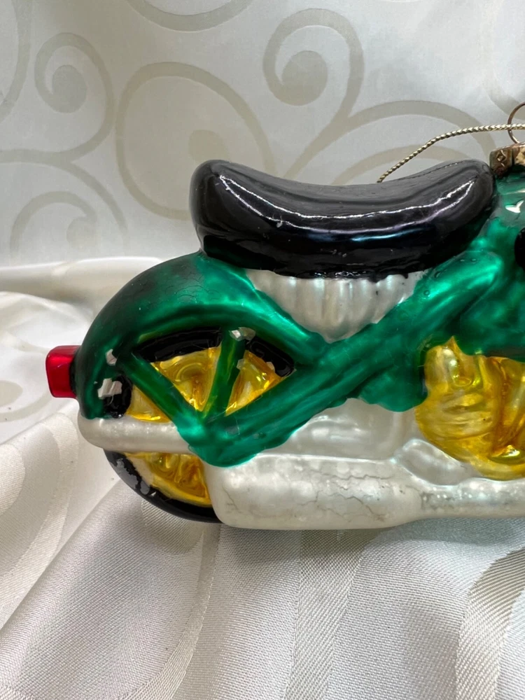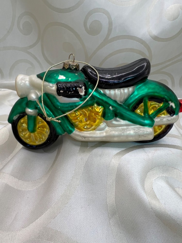 Production Technique: Hand Blown Glass Item Width: 2 inches Country of Origin: China Set Includes: Ornament Collection: Ornaments Brand: Unbranded Original/Licensed Reproduction: Original Item Length: 6 inches Personalize: No Features: Vintage Number of Items: 1 Size: Small Seller Notes: “Some paint is chipped. You can see in the photos.” Theme: Christmas Material: Glass Occasion: Christmas Color: Multicolor Item Weight: 5 oz Subject: Motorcycle Type: Ornament Shape: motorcycle Item Height: 2 3/4 inch