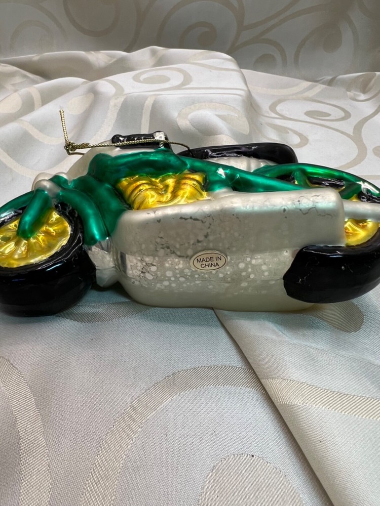 This vintage glass German motorcycle ornament is a small, multicolor decoration measuring 6 inches in length and 2 3/4 inches in height. It is a hand-blown glass ornament featuring a motorcycle design, perfect for Christmas and holiday decorations. The ornament is part of a collection of ornaments and has a vintage look, making it a unique addition to any holiday display. Made in China, this original piece is designed for motorcycle enthusiasts and collectors looking for a special and decorative item for their Christmas tree.