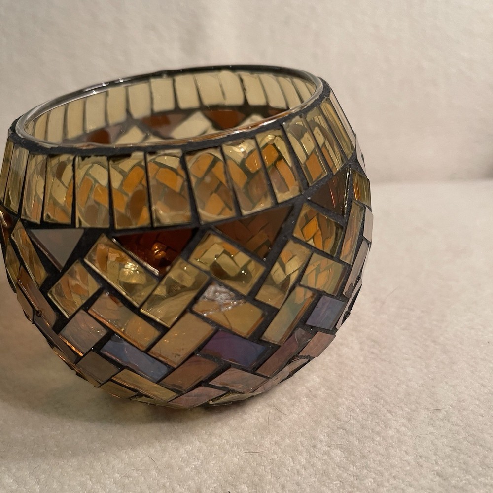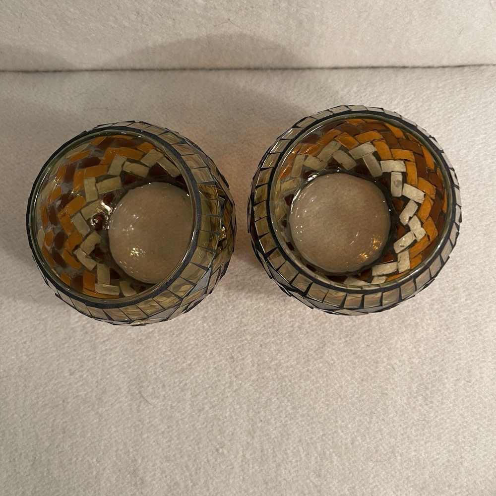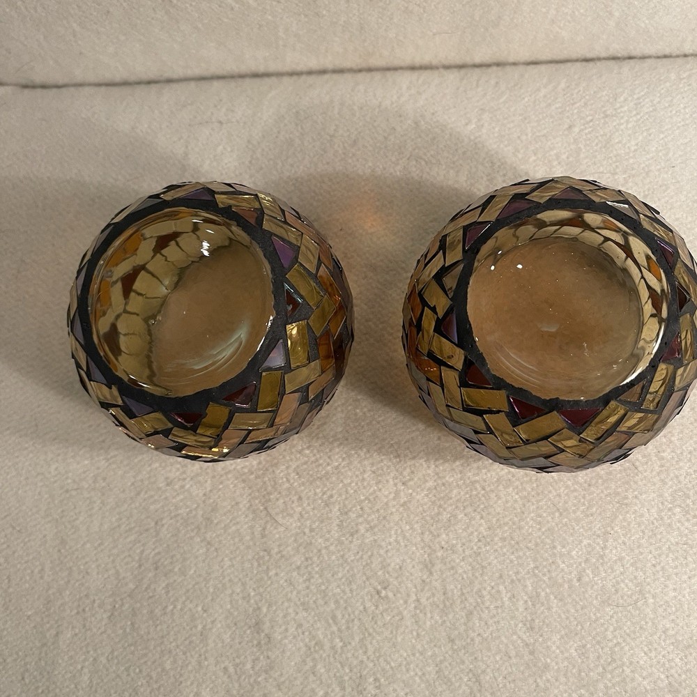 Add a touch of vintage elegance to your home decor with this set of two glass mosaic candle holders. The round shape and amber gold brown color make them suitable for all occasions and perfect for mini candles. These original 1980s pieces are a great addition to any collection and will complement any design style. Crafted from high-quality glass, these candle holders are both indoor and outdoor suitable. With a height of 3 inches and a width of 3.75 inches, they are the perfect size for any room. Don't miss out on the opportunity to own these beautiful and unique pieces. Very good vintage condition. One of the mosaic pieces has a crack. See photos.