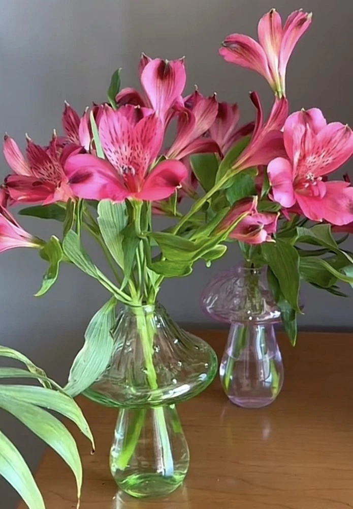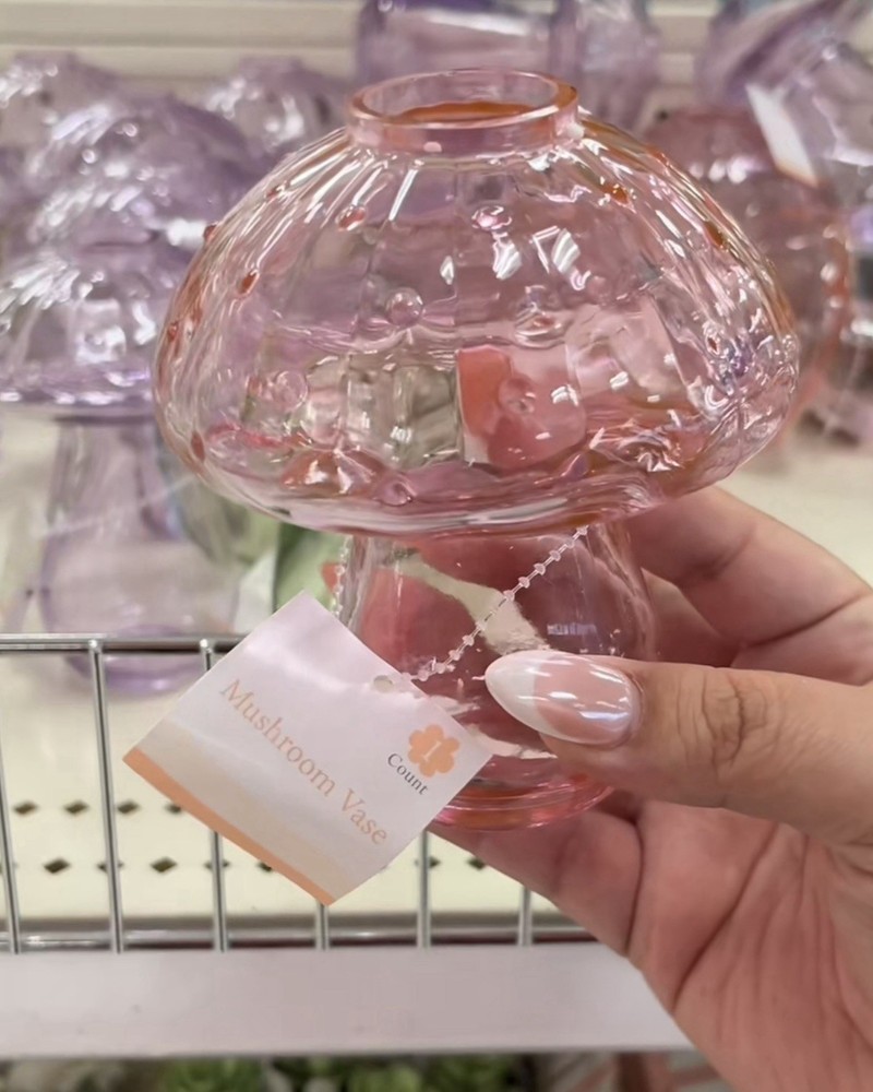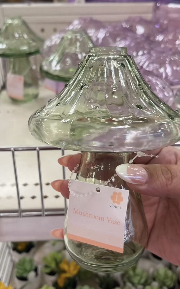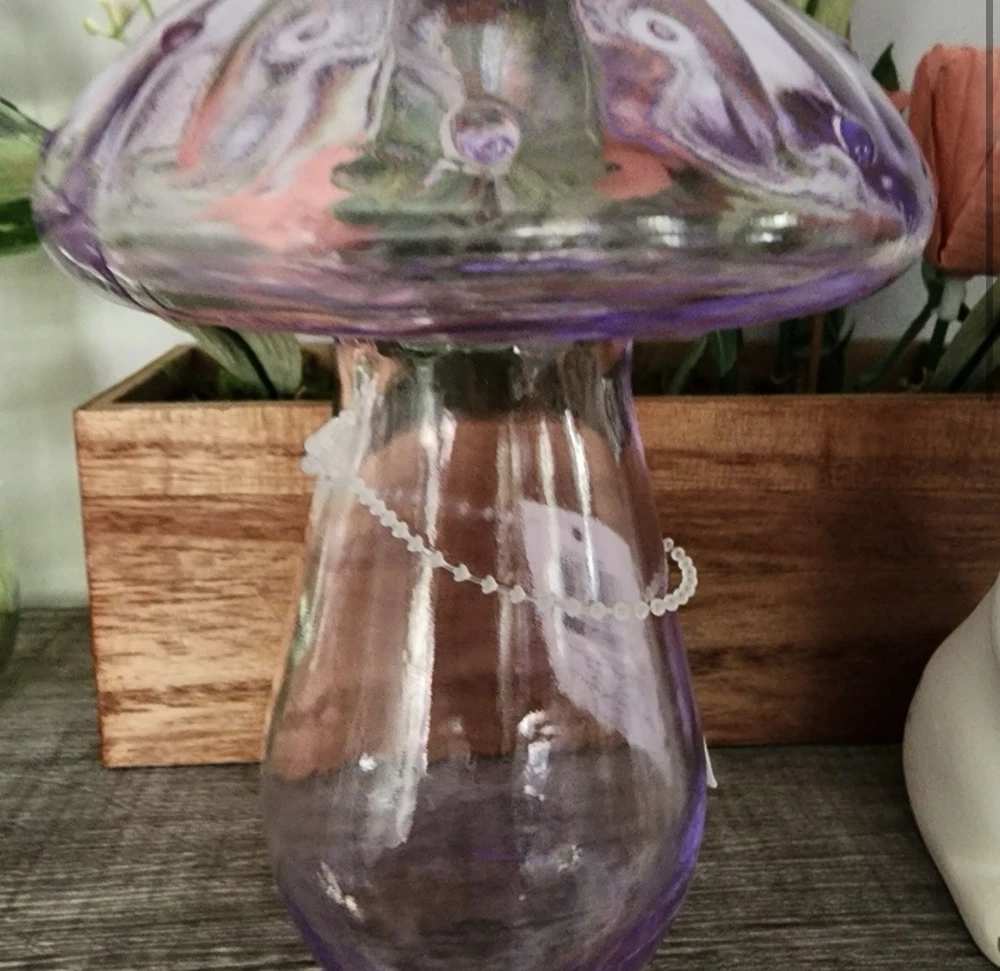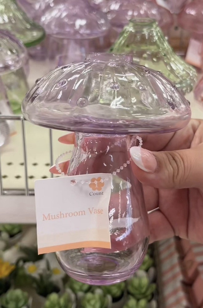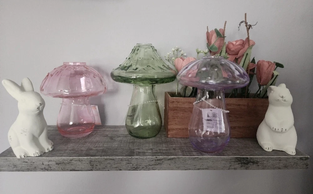 The Target Bullseye Spring 2024 Glass Mushroom Vase Planter set includes three vases in sizes of 5" and 6". Made of glass and featuring a unique mushroom shape, these multicolor vases add a whimsical touch to any home decor. Perfect for displaying flowers or as standalone decorative pieces, these vases offer a fun and creative way to enhance your living space. Set of 3 as pictured, one in pink, one in purple and one in green. Brand New