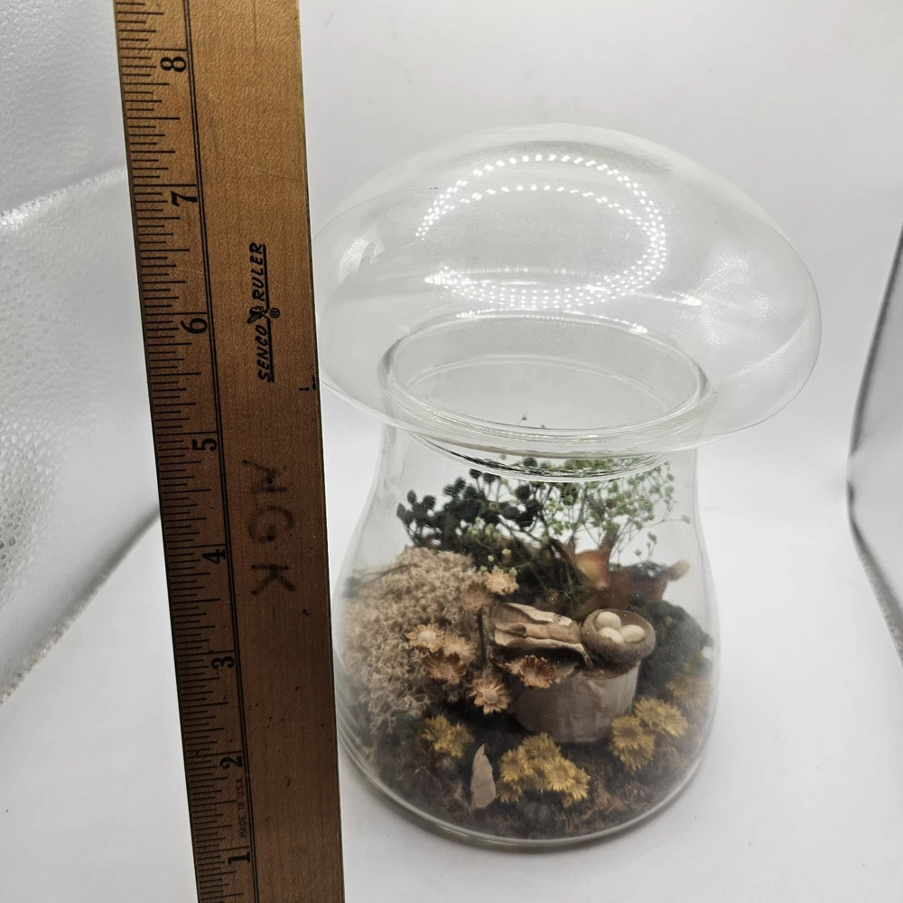 This vintage collectible is a glass mushroom adorned with woodland terrarium deer and flowers. The mushroom is made of multi-color glass and features intricate detailing. Perfect for adding a whimsical touch to any decorative display. The jar has a lid. See photos for wear