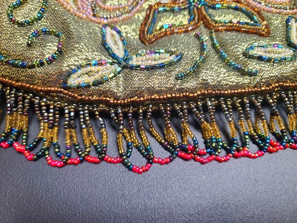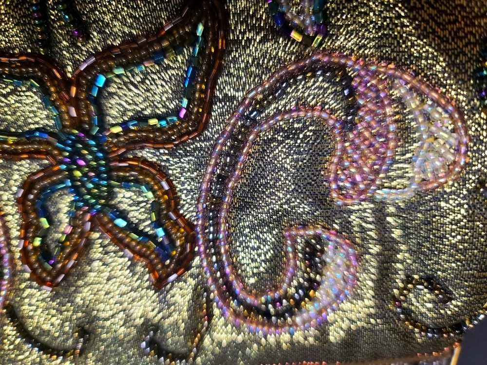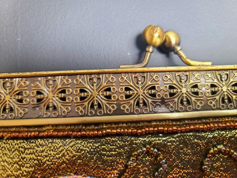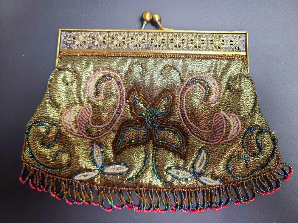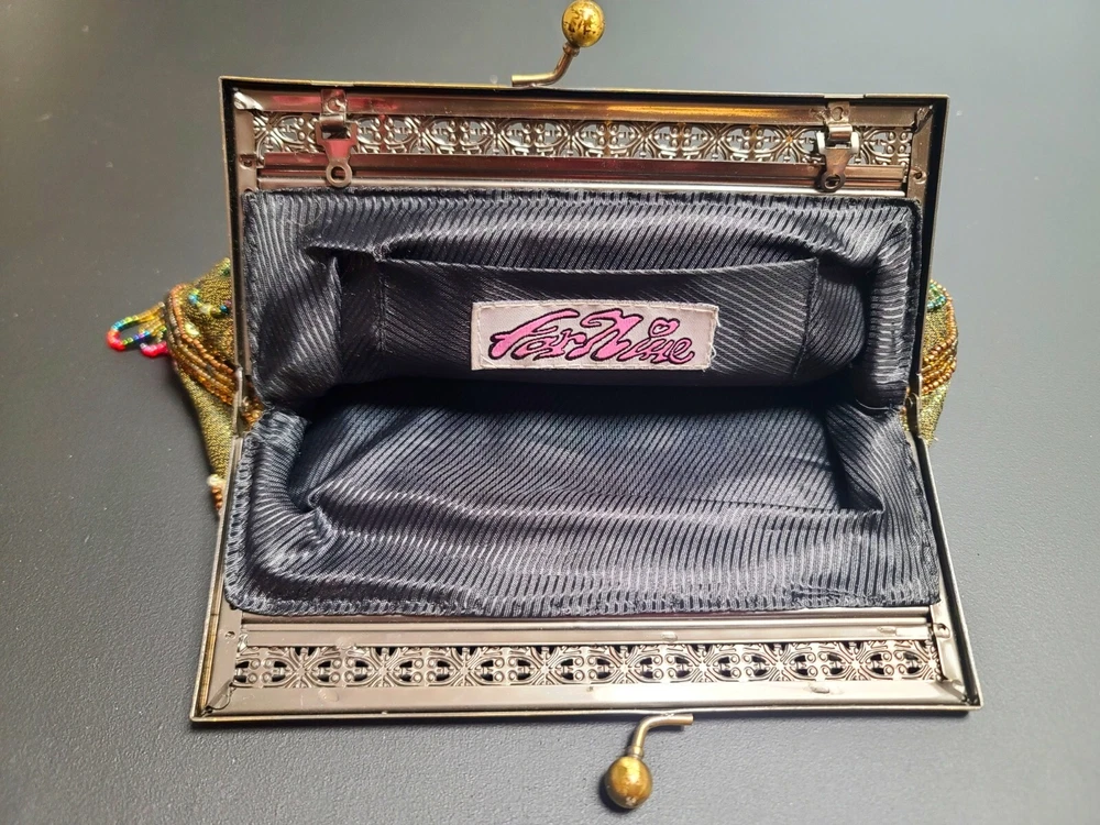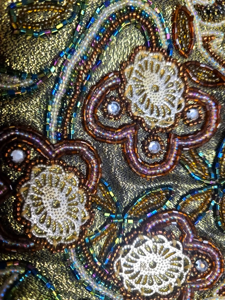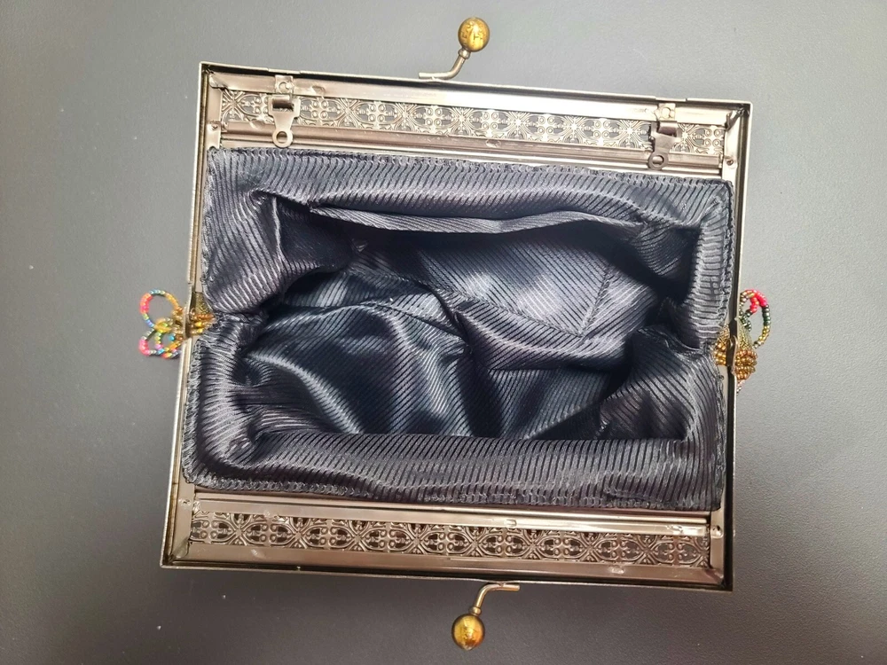 Without chain. Side pocket inside. Beads on metallic background.