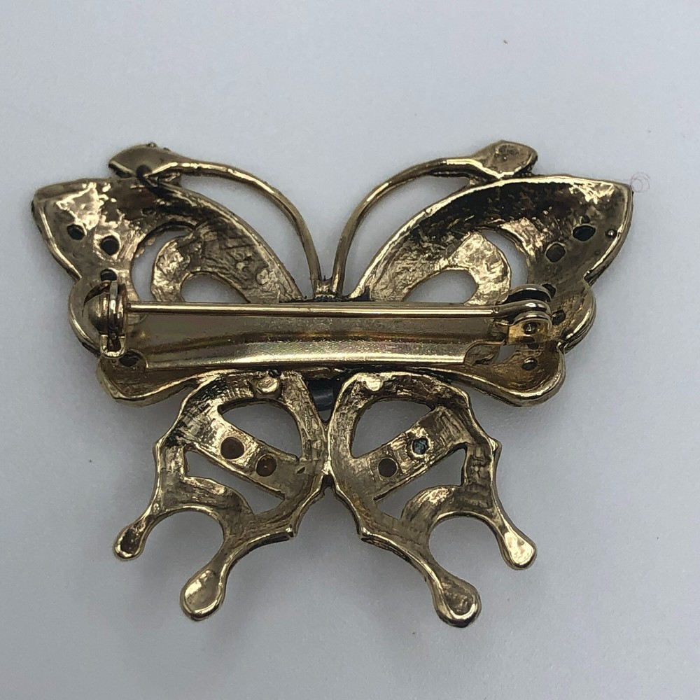 Vintage butterfly brooch. This gold tone metal brooch features carving detailing the butterfly motif. In the center is a round opaque black cabochon 7 mm in diameter. The wings are accented with small round rhinestones in blue, green, red and clear. Secure locking pin back. Brooch measures approximately 1.75 x 1.5 inches and weighs 9 grams. Excellent condition.