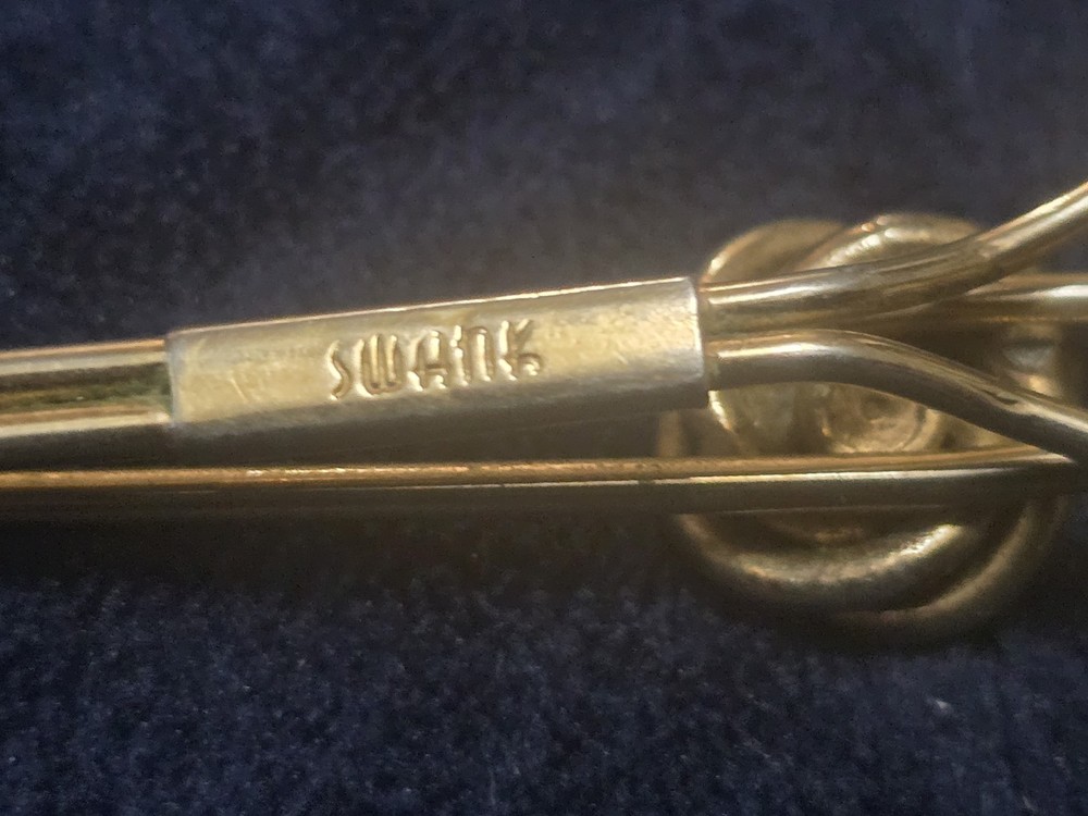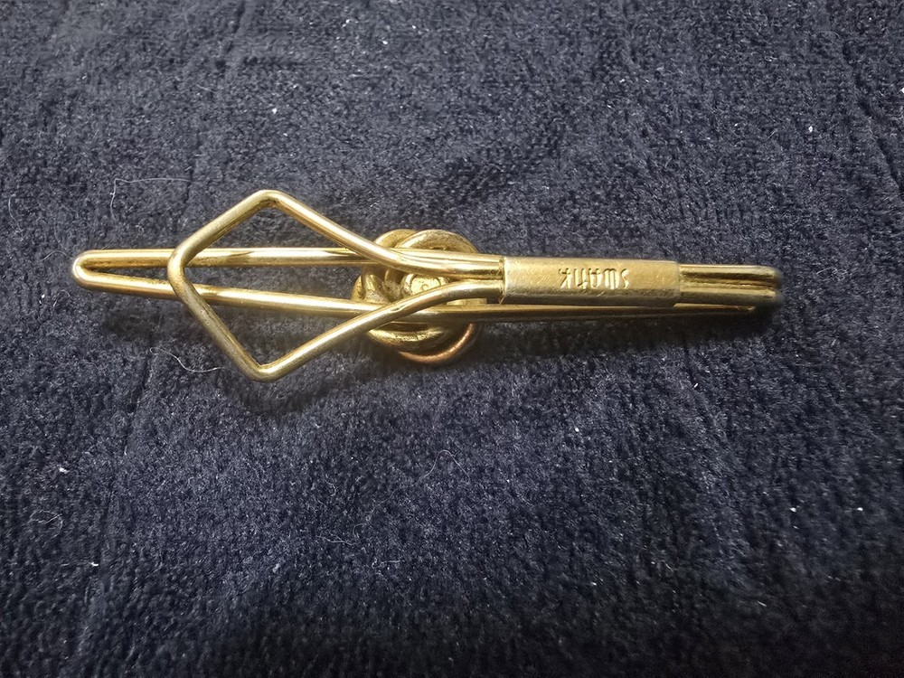 The Vintage Swank Love Knot Tie Bar features a red cabochon stone set in yellow gold filled metal, making it a stylish accessory for all occasions, especially Valentine's Day. This retro piece from the 1935-1950 era exudes a vintage charm with its knot shape and Art Deco style. Signed by Swank, this tie bar showcases a unique design that is perfect for men looking to add a touch of classic sophistication to their outfit. Made in the United States, this vintage tie bar is a timeless piece that will elevate any formal ensemble. sold as is - well loved