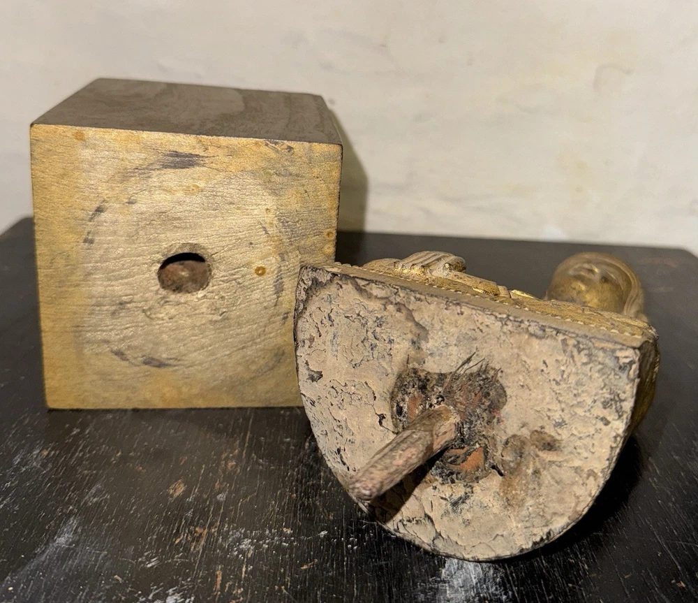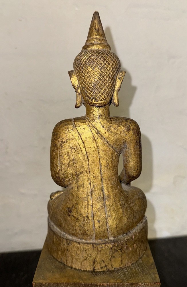 Vintage Gold Painted Hand Carved Buddha In Wood Sitrimg On Base. Guess it was made around 1930. Maybe earlier. In good condition. No damages or repairs. Figure With wonderful patina. Measures: 30,5 cm high (included base and figure). SHIPPING OUTSIDE EUROPE: SHIPPING WITH DHL GLOBAL MAIL. INCLUDED TRACK & TRACE. FULLY INSURED. SHIPPING WITHIN EUROPE: SHIPPING WITH GLS. PRICE FROM 20-30 US DOLLARS. INCLUDED T&T. FULLY INSURED. Satisfaction or your Money back gurantee.