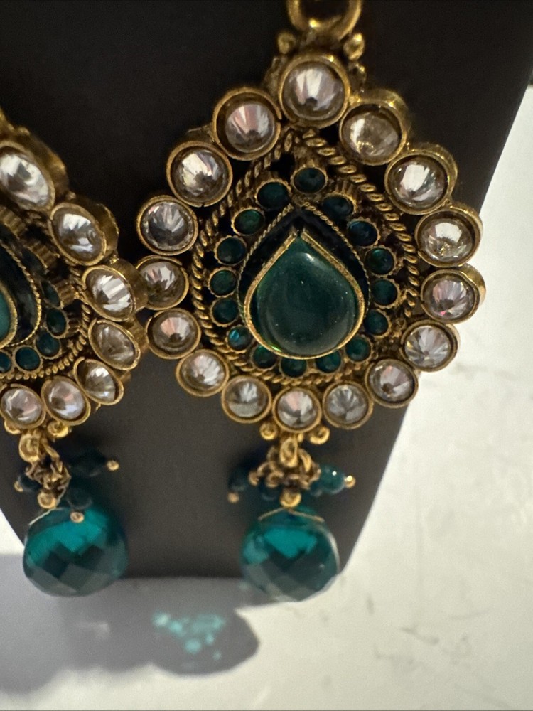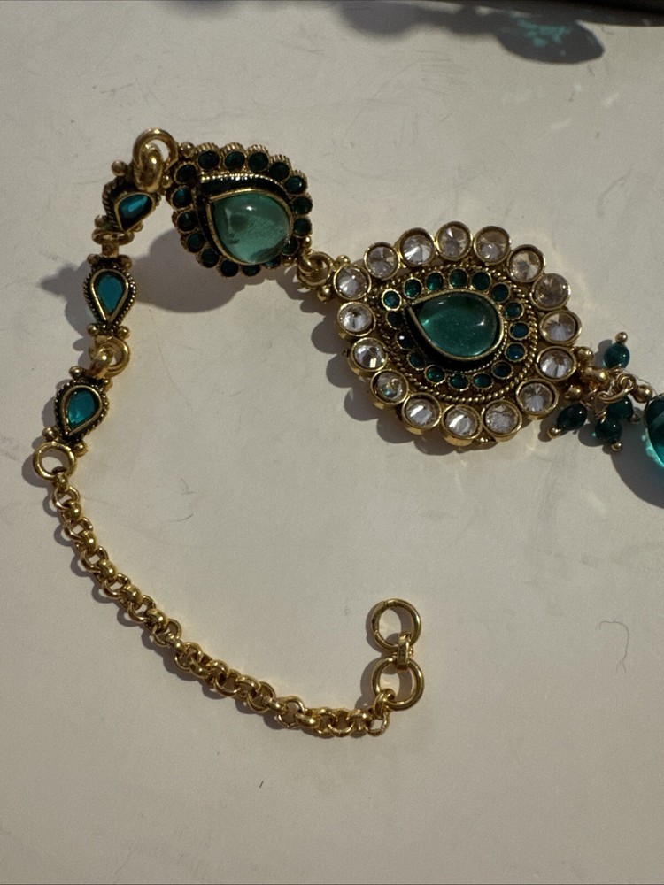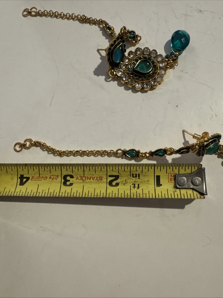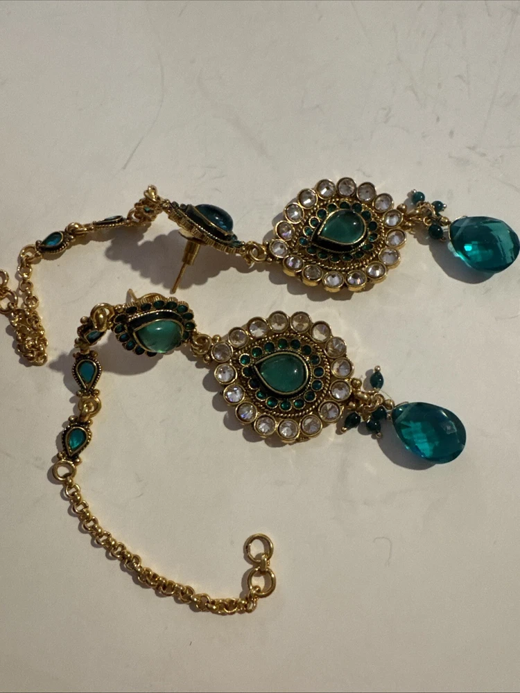 Adorn your ears with the vintage charm of these Gold Kundan Effect Earrings, paired with a complementary Green Earback Chain. These unbranded chandelier earrings are designed to add an elegant touch to any outfit, featuring a threader closure that ensures a secure and comfortable fit for all-day wear. Crafted from mixed metals and embellished with striking green stones, these earrings are perfect for a variety of special occasions, from anniversaries and birthdays to weddings and engagements. The intricate design and eye-catching green hue will effortlessly enhance your look, making these earrings a timeless addition to your jewelry collection.